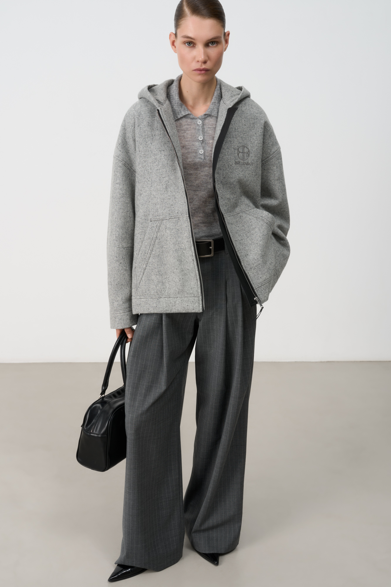 Свободный бомбер с капюшоном. Модель со спущенной линией плеча и боковыми карманами. Вышивка логотипа бренда на груди. Застежка на молнию. На подкладке.