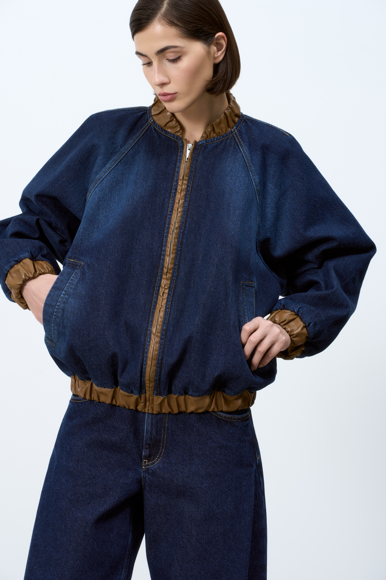 Джинсовый бомбер со вставками из экокожи. Модель свободного силуэта со спущенной линией плеча и боковыми карманами. Манжеты и низ изделия на резинке. На подкладке. Застежка на молнию.