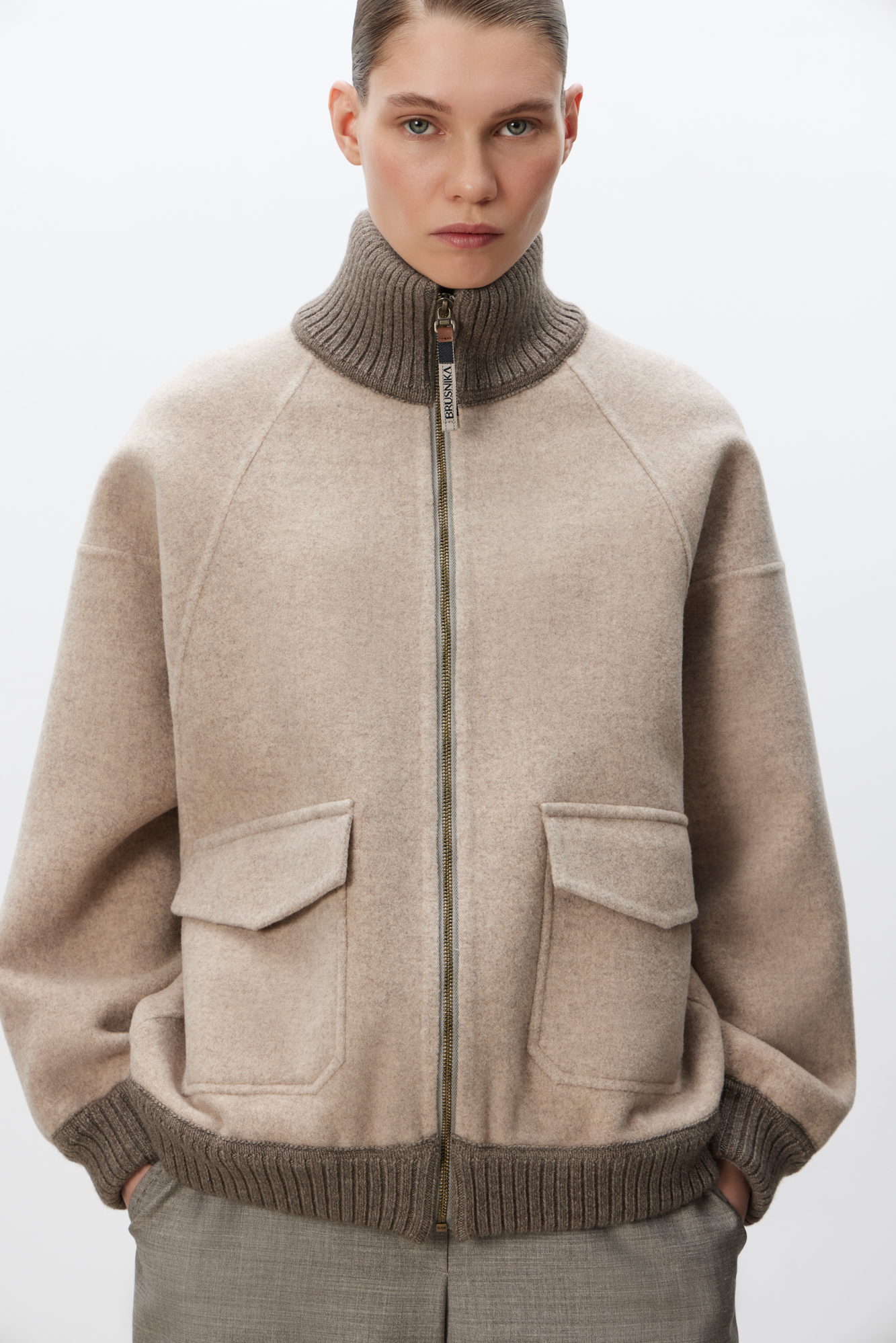 Бомбер из шерсти свободного кроя. Модель со спущенной линией плеч, воротником-стойкой и двумя накладными карманами с клапанами. Воротник, манжеты и низ изделия выполнены из плотного трикотажа в рубчик. Застежка на молнию. Без подкладки.