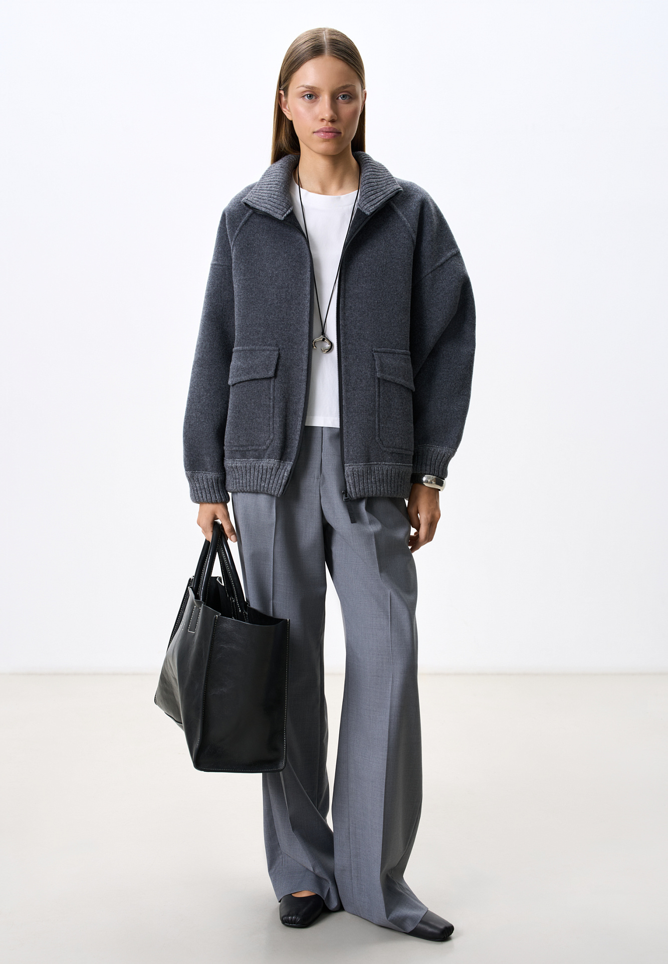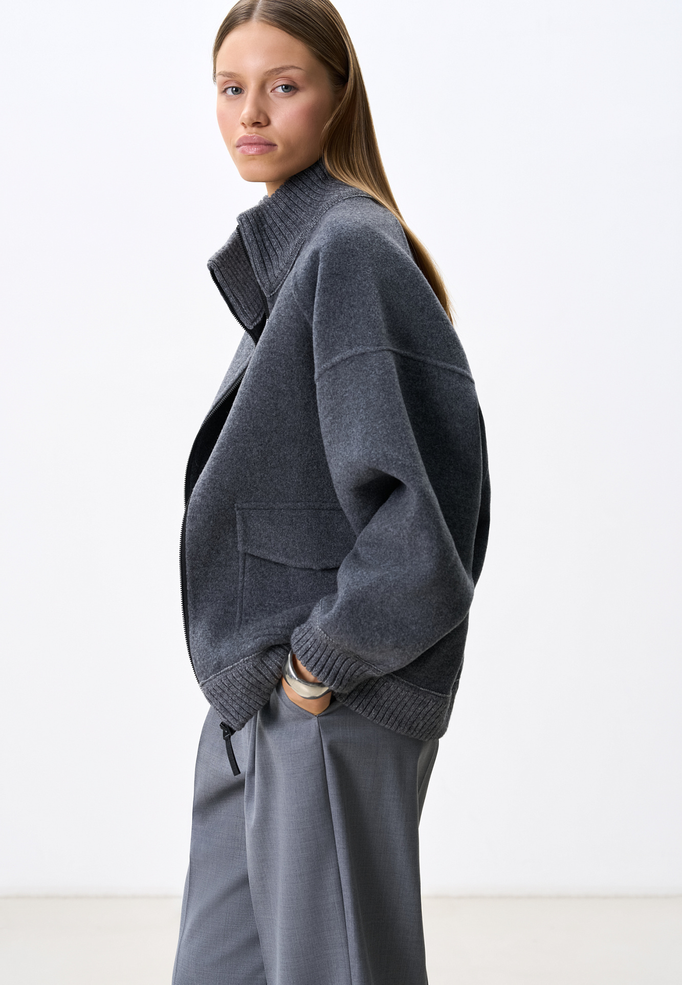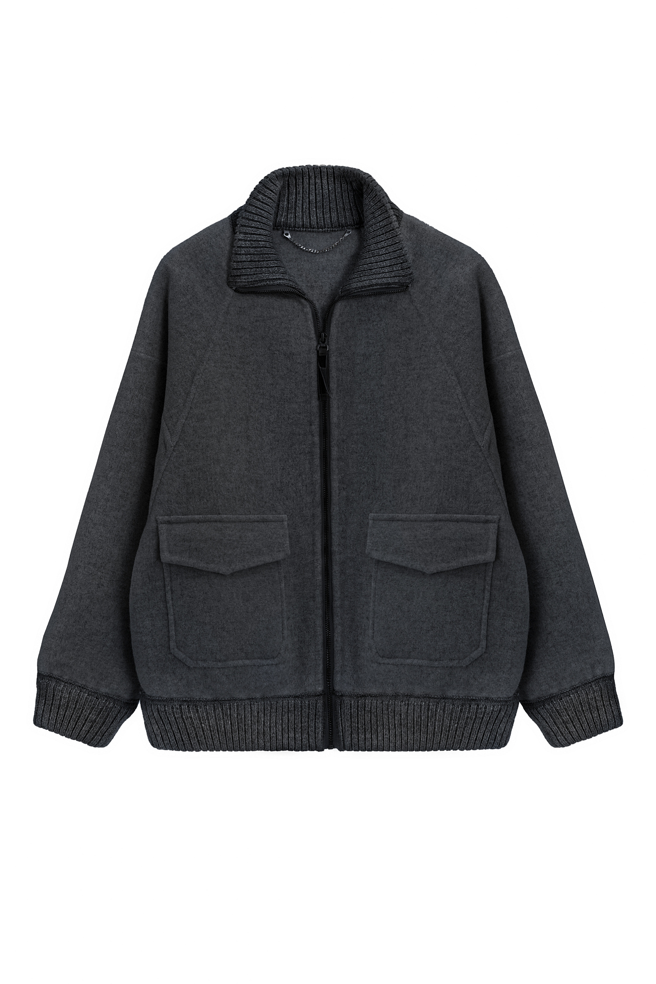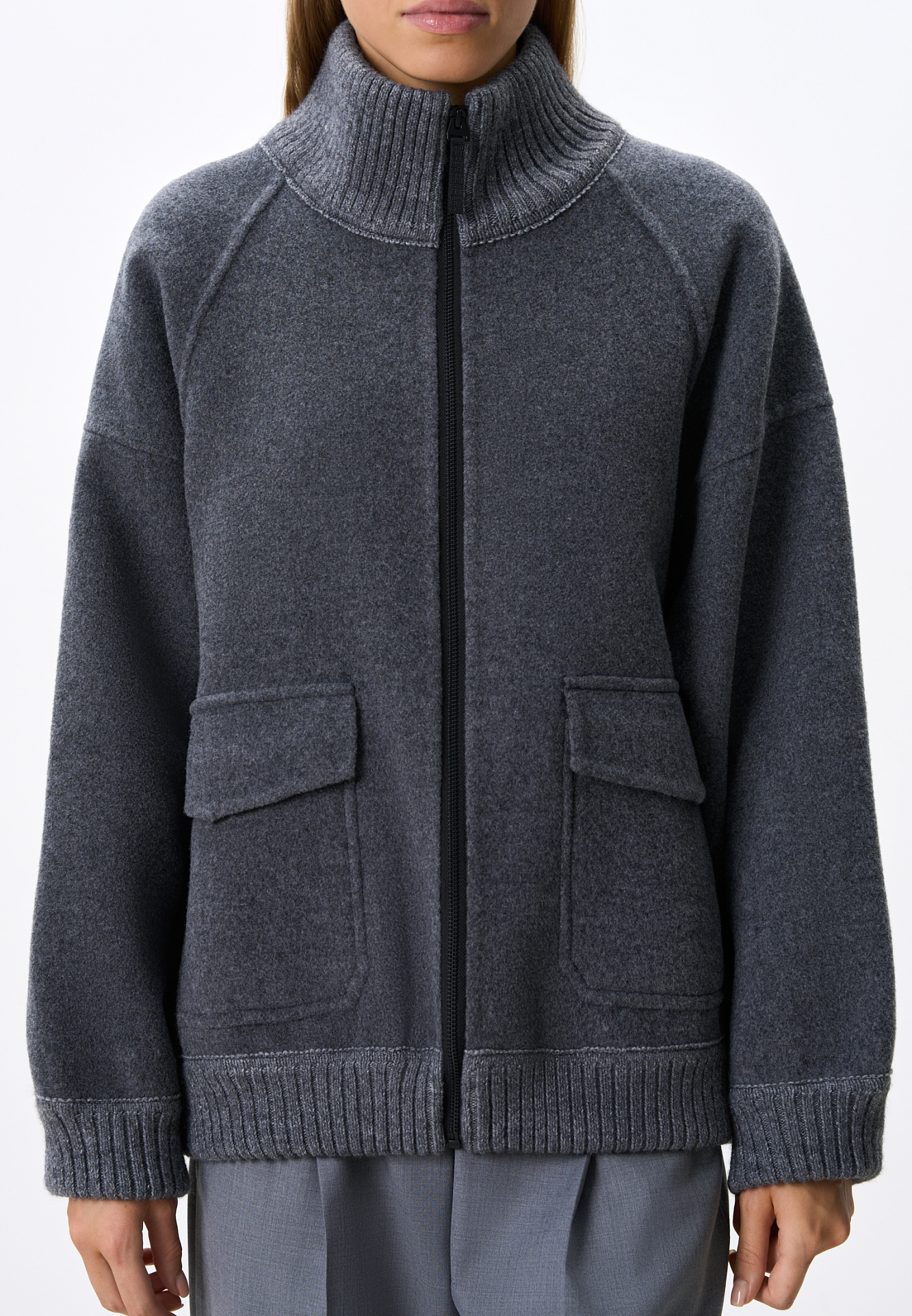 Бомбер из шерсти свободного кроя. Модель со спущенной линией плеч, воротником-стойкой и двумя накладными карманами с клапанами. Воротник, манжеты и низ изделия выполнены из плотного трикотажа в рубчик. Застежка на молнию. Без подкладки.