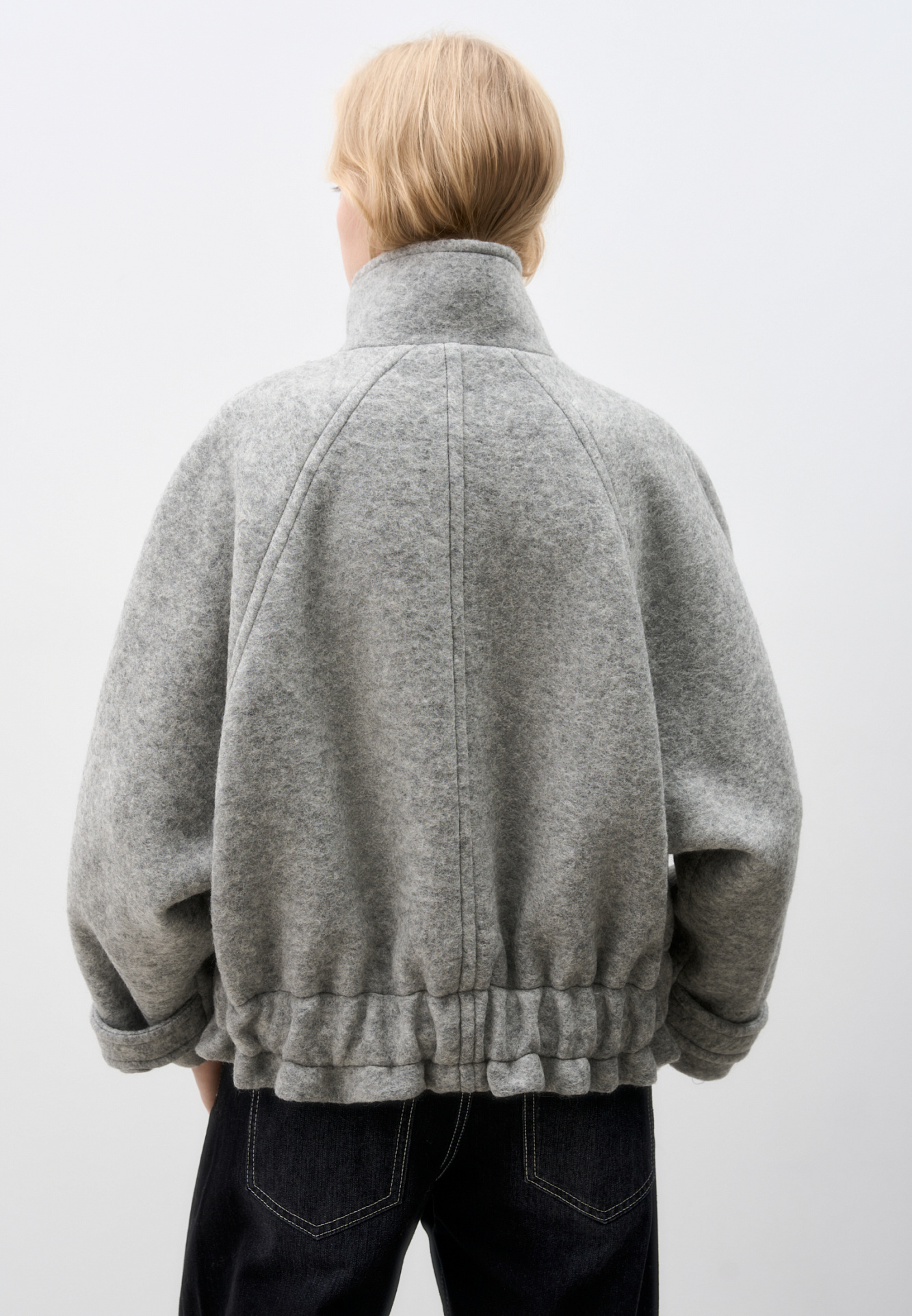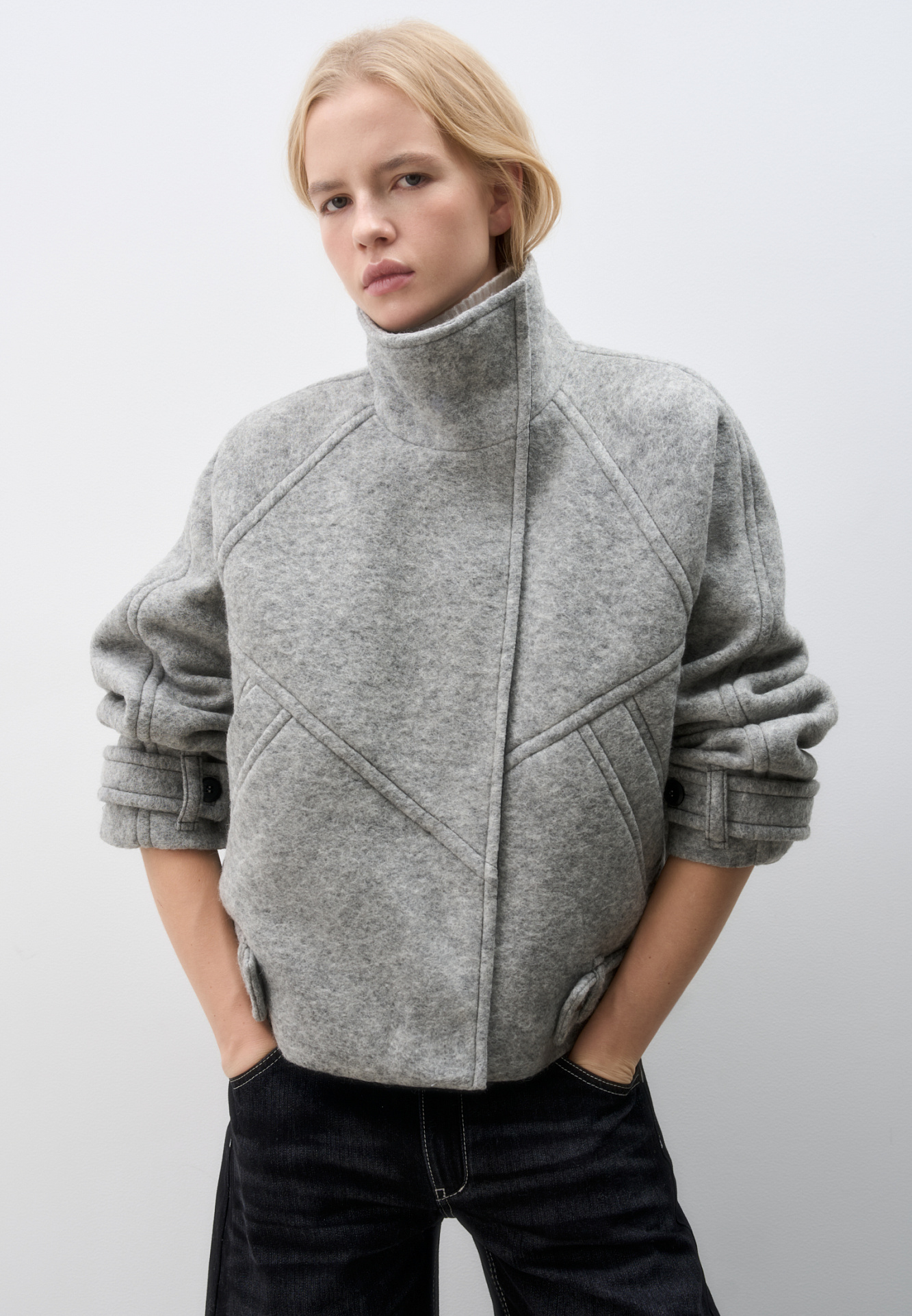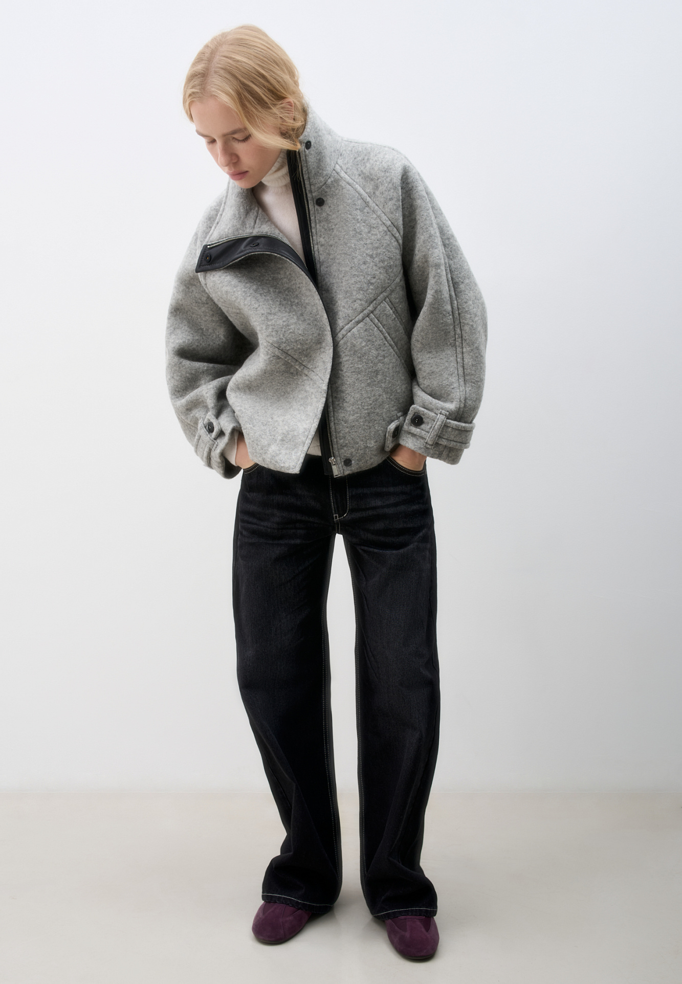 Шерстяной бомбер с воротником-стойкой. Модель свободного силуэта, с патами на пуговицах на манжетах и по низу изделия, застежка на молнию и магнитные пуговицы под планкой, декорированной экокожей. Бомбер выполнен на подкладке.