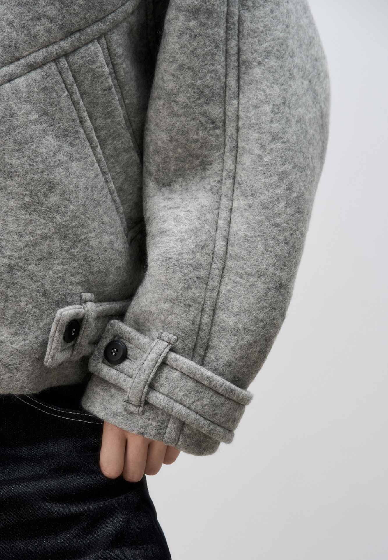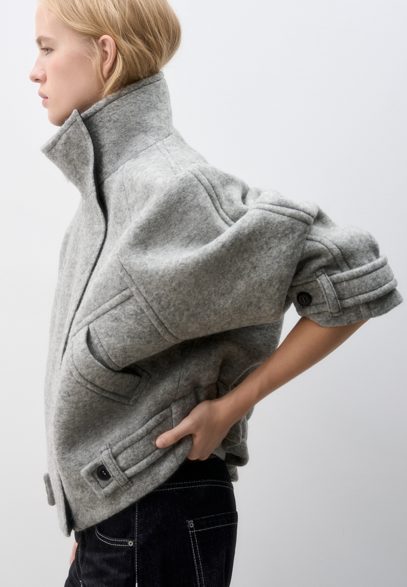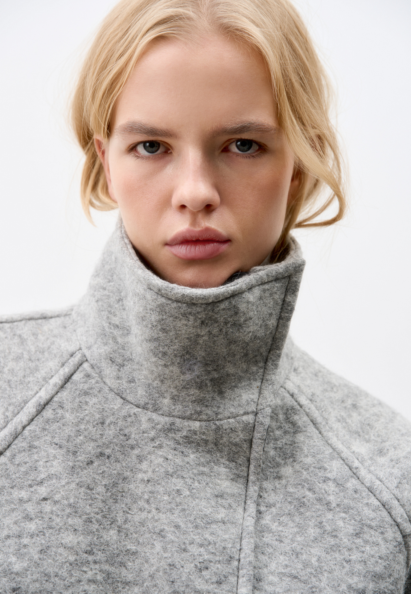 Шерстяной бомбер с воротником-стойкой. Модель свободного силуэта, с патами на пуговицах на манжетах и по низу изделия, застежка на молнию и магнитные пуговицы под планкой, декорированной экокожей. Бомбер выполнен на подкладке.