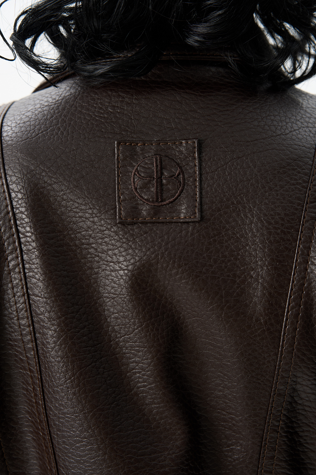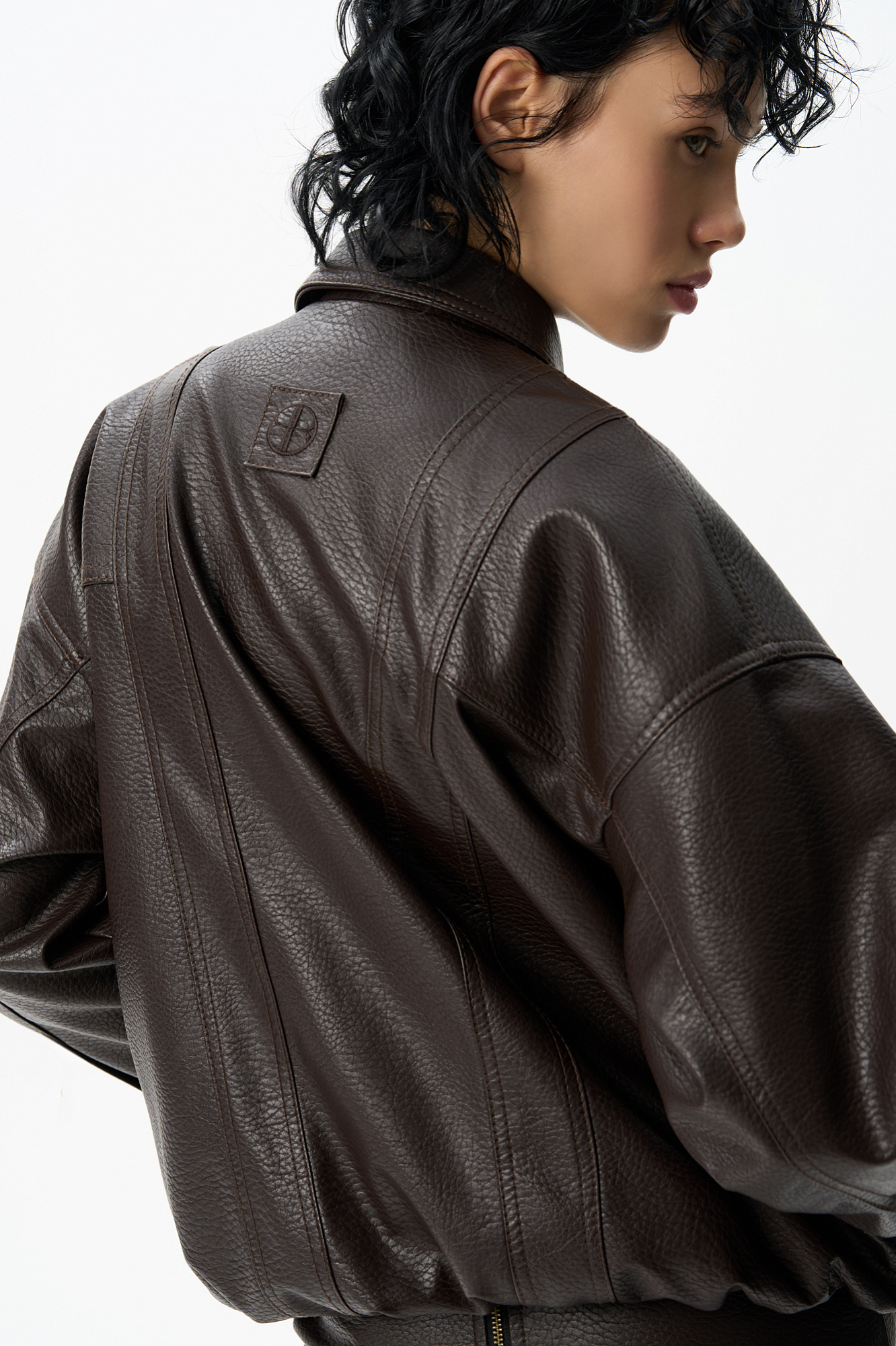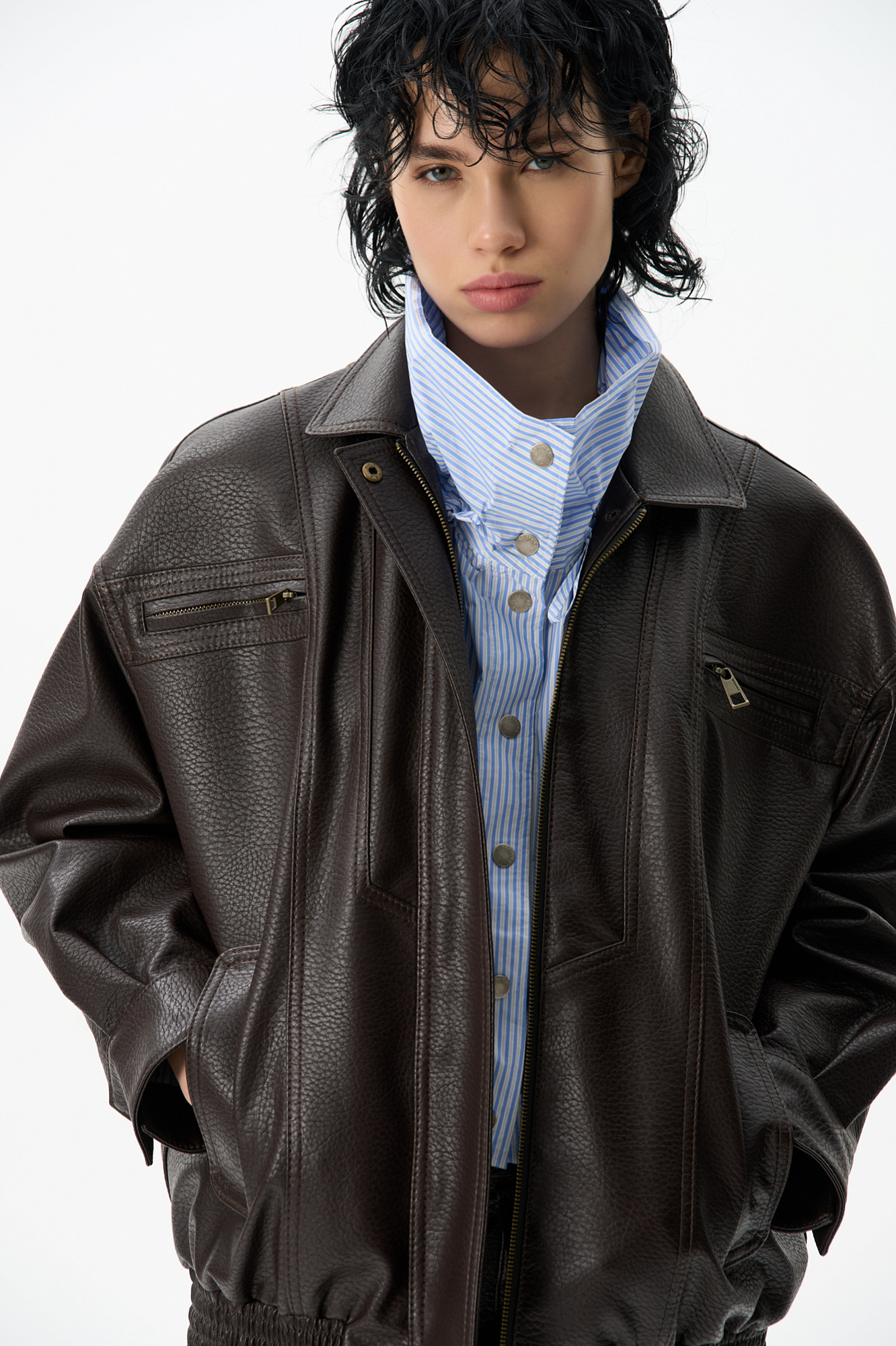 Бомбер из текстурной экокожи. Модель свободного силуэта с длинными рукавами, отложным воротником, двумя нагрудными карманами на молниях и глубокими боковыми карманами. Застежка на молнию и металлические кнопки на планке. Изделие на подкладке.