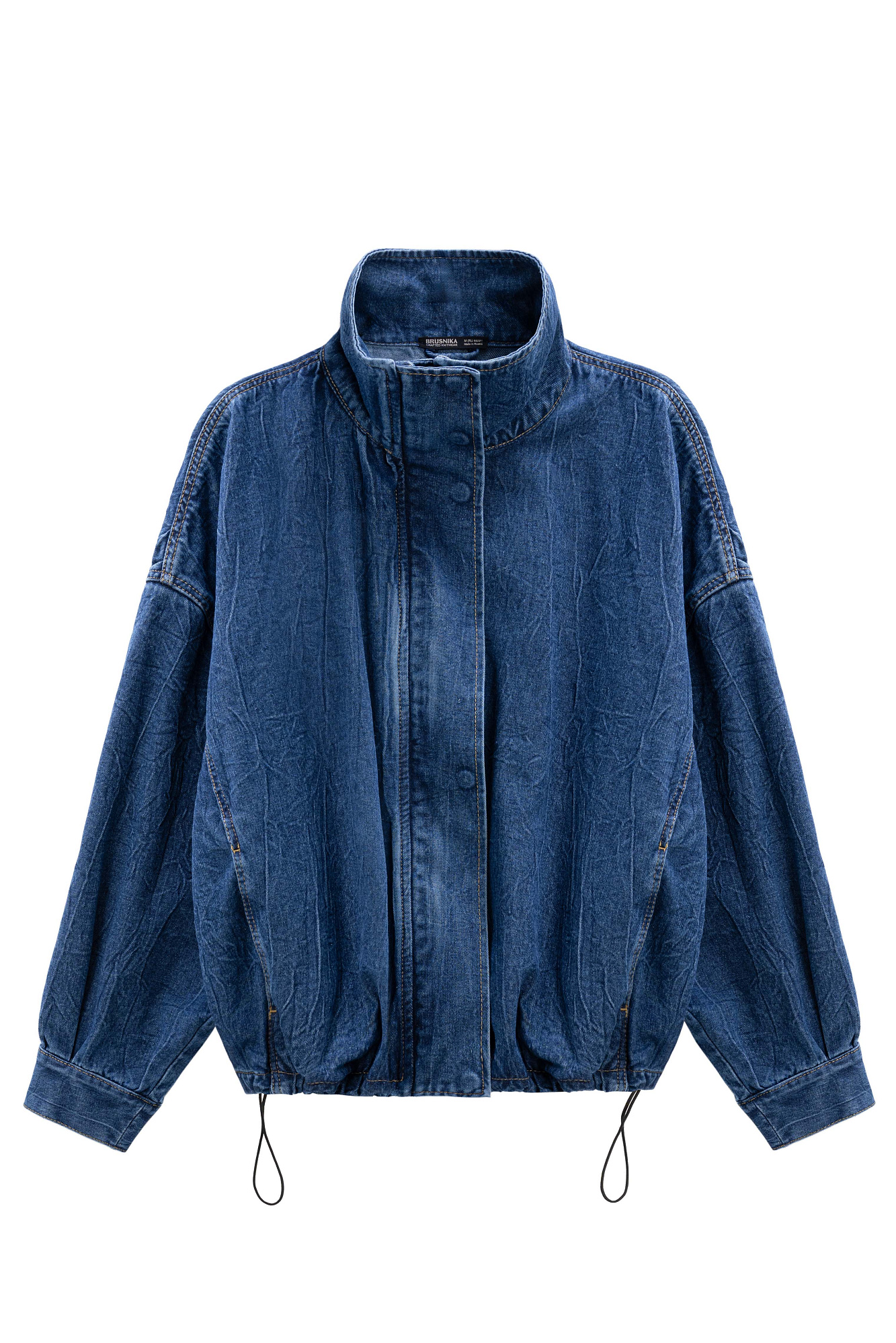 Джинсовый бомбер из 100% хлопка с жатой текстурой. Модель свободного силуэта со спущенной линией плеч, воротником-стойкой, регулируемой кулиской по низу и застежкой на молнию под планкой со скрытыми кнопками.