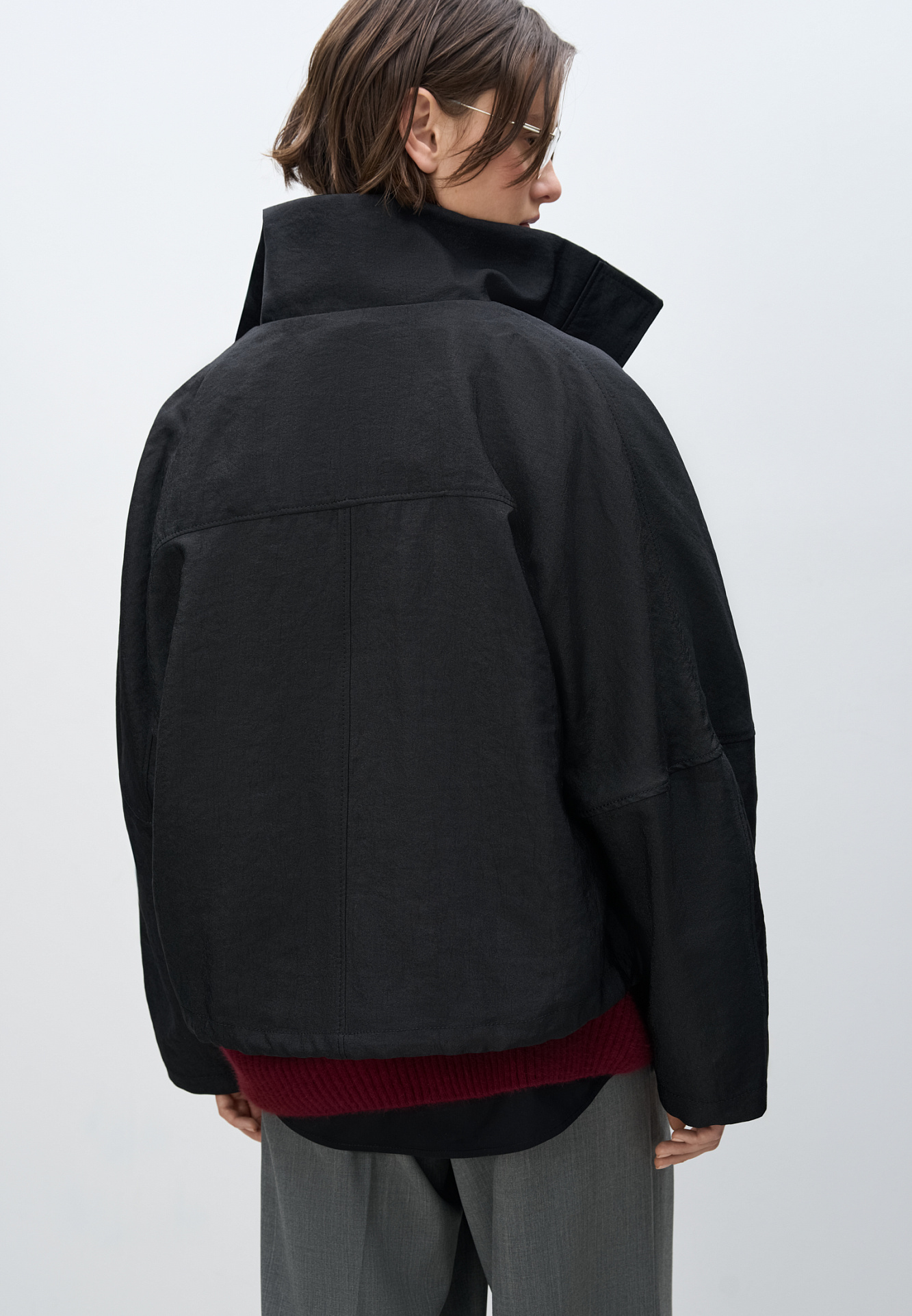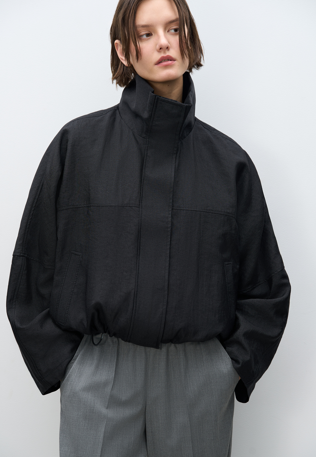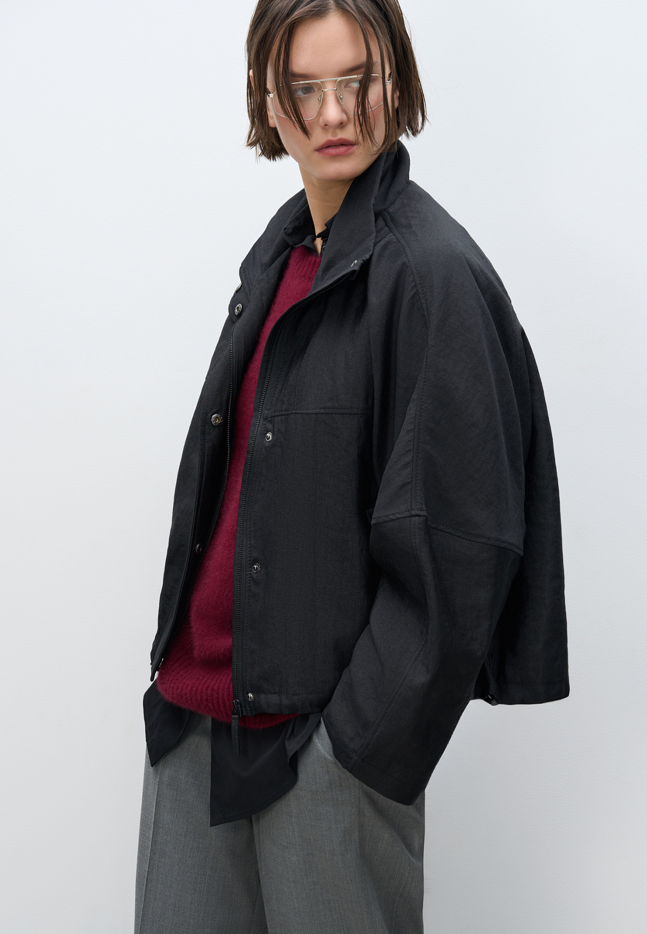 Бомбер из вискозы с воротником-стойкой. Модель свободного силуэта со спущенной линией плеча и боковыми карманами. Низ изделия выполнен на резинке. Застежка на молнию под планкой с кнопками.