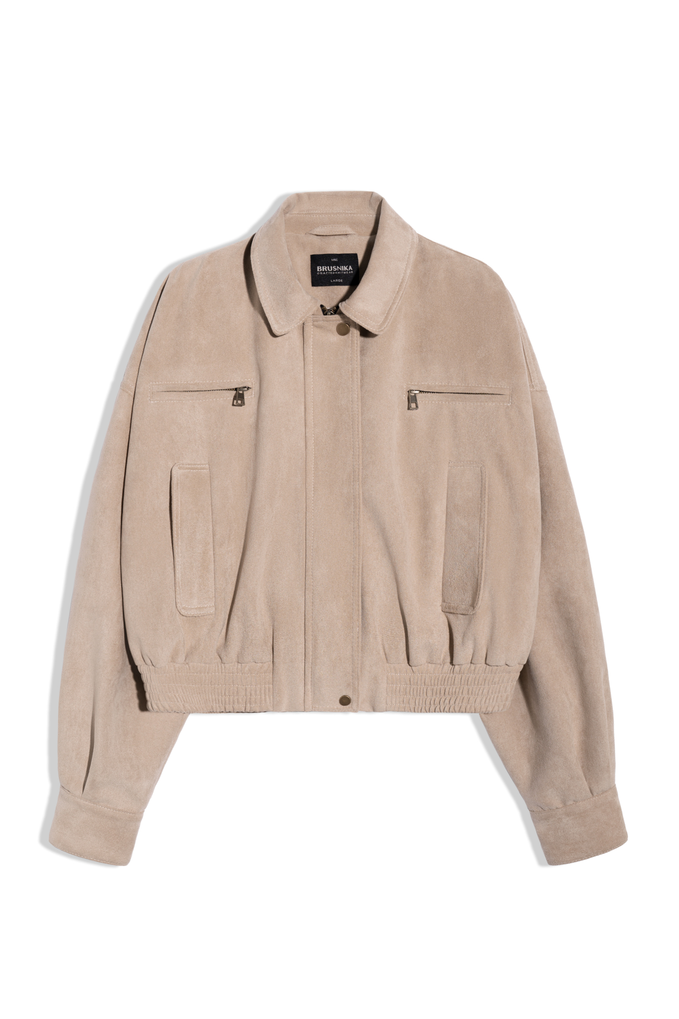 Бомбер из замши с отложным воротником. Модель свободного силуэта со спущенной линией плеча, двумя нагрудными карманами на молнии и двумя боковыми карманами. Низ изделия выполнен на резинке. Застежка на молнию под планкой. На подкладке.