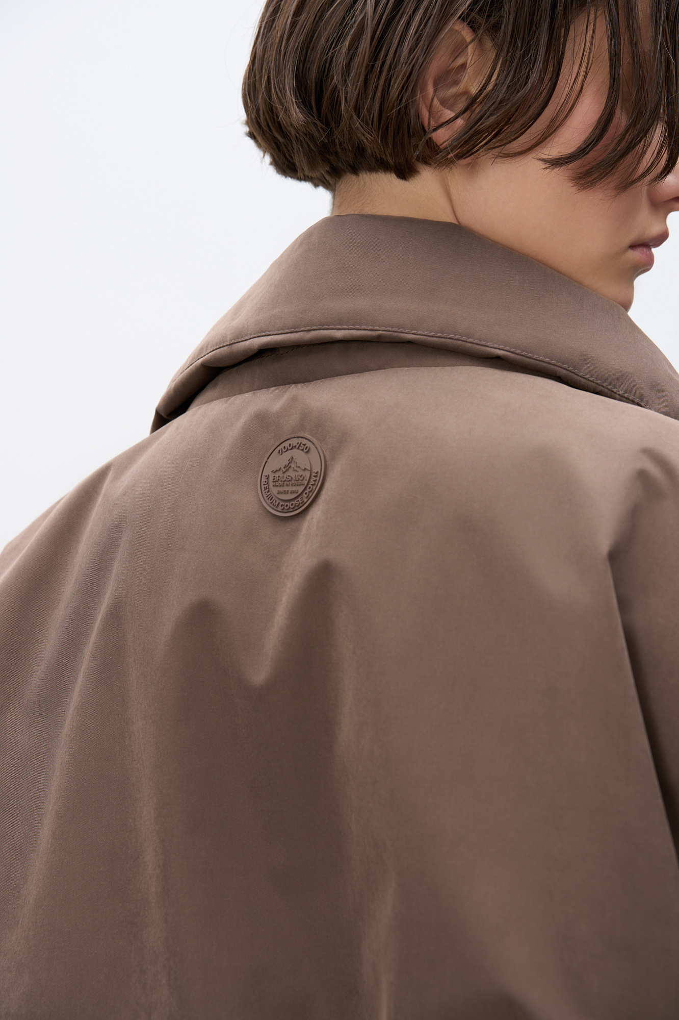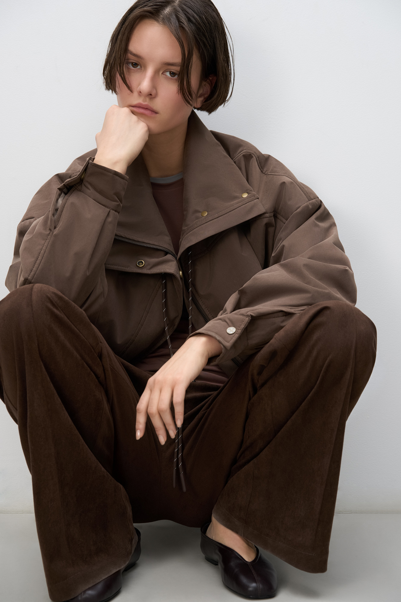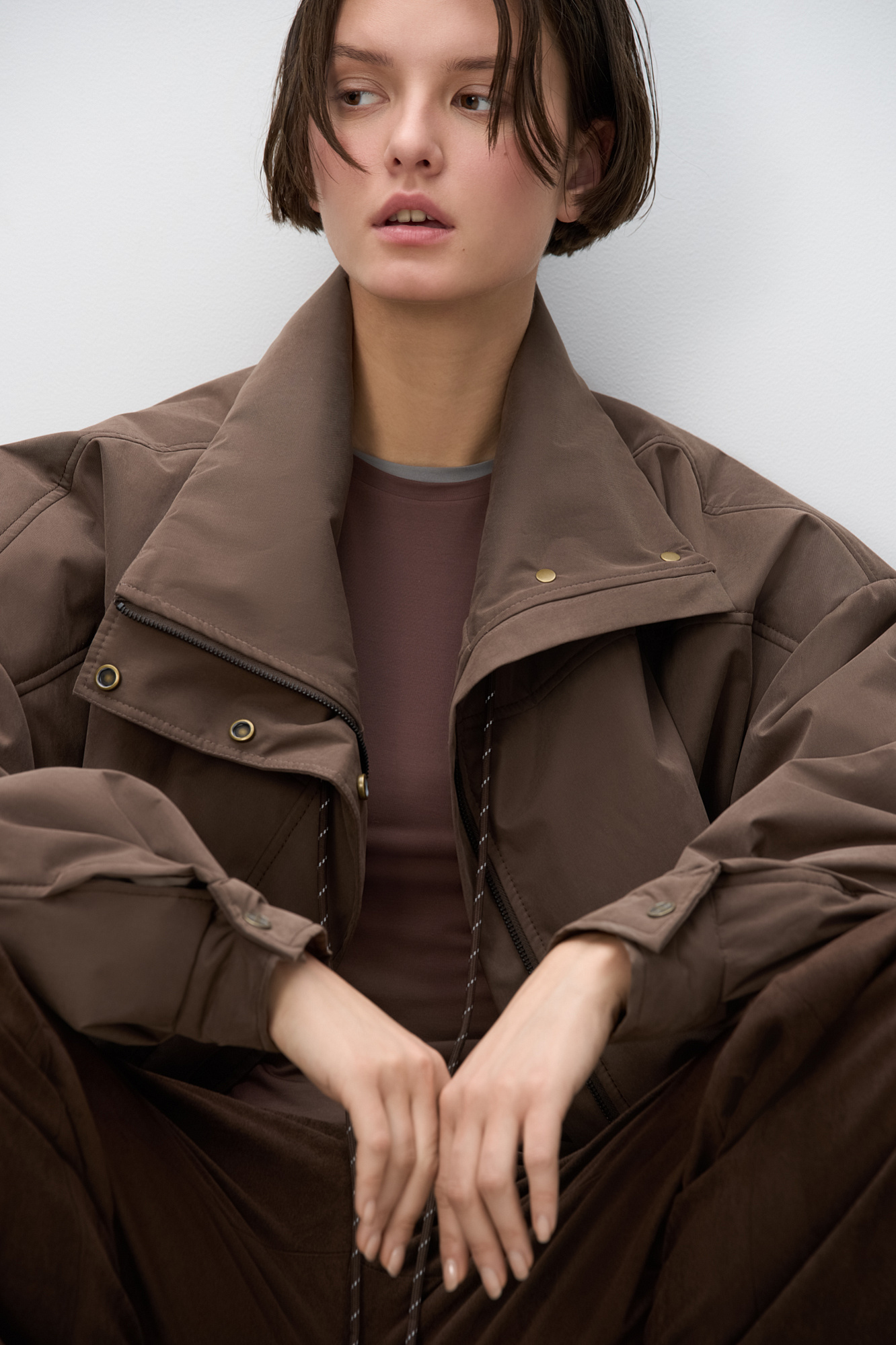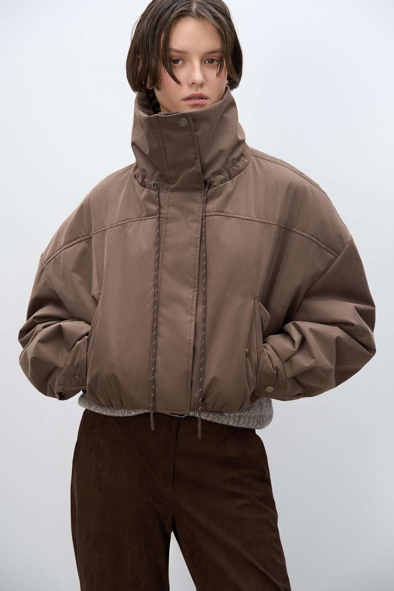 Объемный бомбер с воротником-стойкой. Модель укороченного силуэта со спущенной линией плеч, глубокими врезными карманами и застежкой на молнию под планку с кнопками. Манжеты рукавов декорированы металлическими брендированными кнопками.