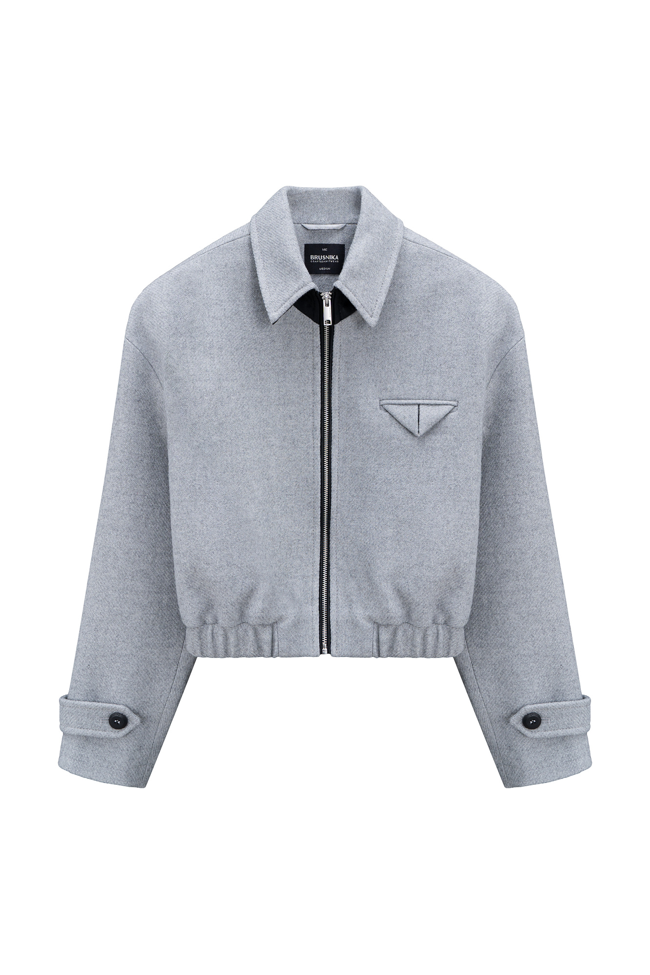 Шерстяной бомбер с отложным с воротником. Модель прямого силуэта с подплечниками и имитацией кармана на груди. Длинные рукава с патами на манжетах. Воротник декорирован вставкой из экокожи. Застежка на молнию. Изделие на подкладке.