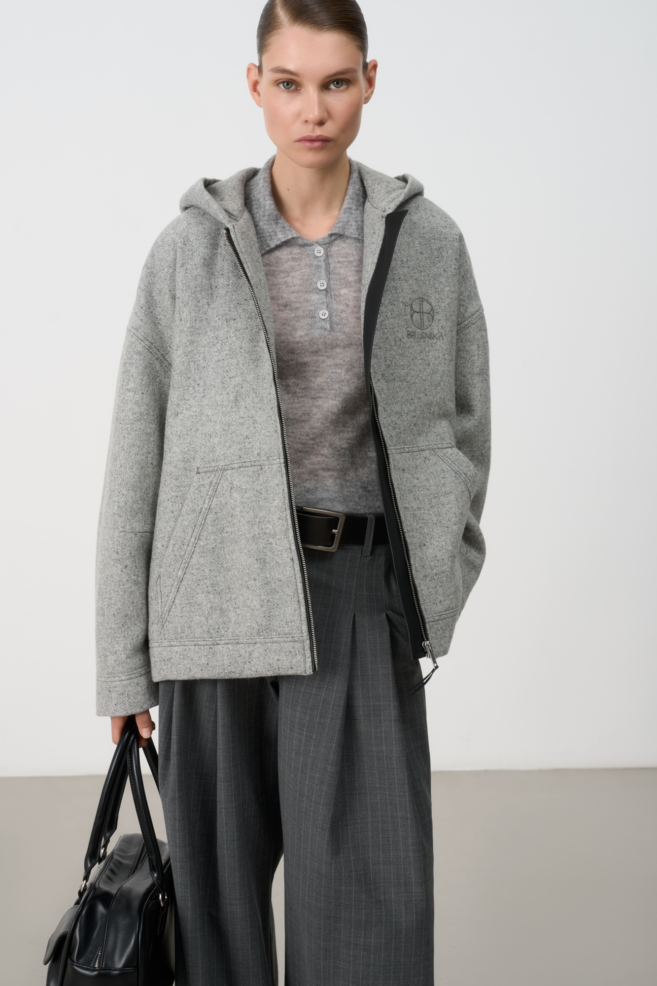 Свободный бомбер с капюшоном. Модель со спущенной линией плеча и боковыми карманами. Вышивка логотипа бренда на груди. Застежка на молнию. На подкладке.