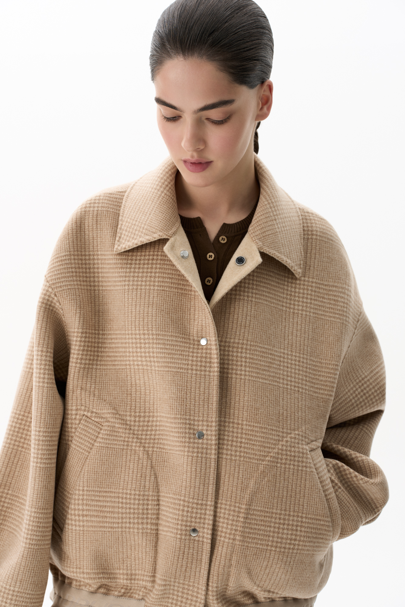 Двусторонний бомбер из 100% шерсти. Модель прямого свободного силуэта со спущенной линией плеч, отложным воротником и двумя накладными карманами. Застежка на магнитные кнопки.