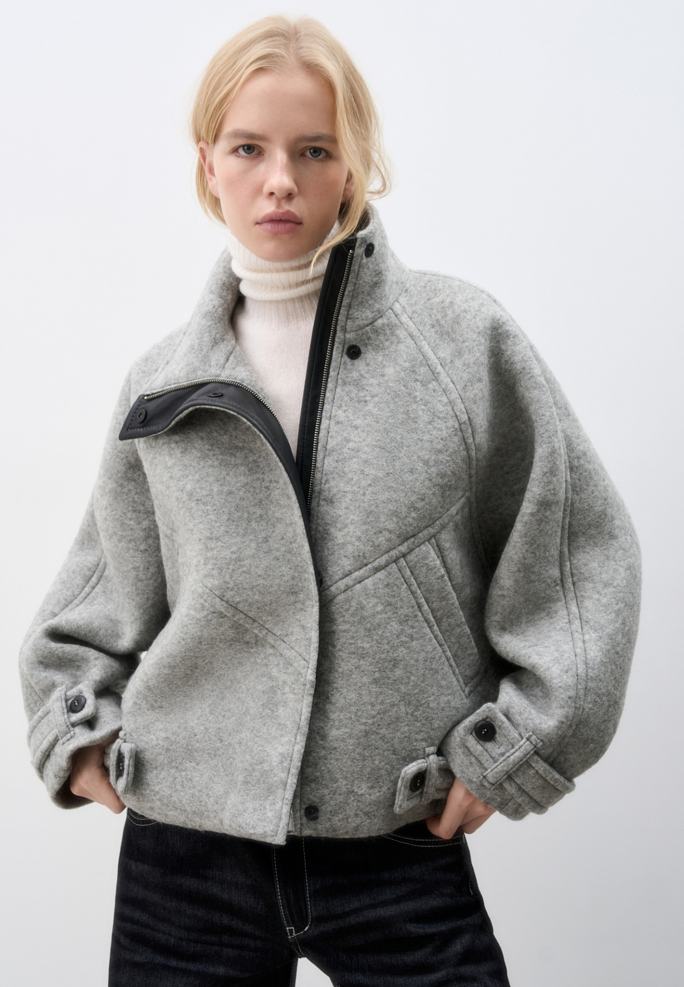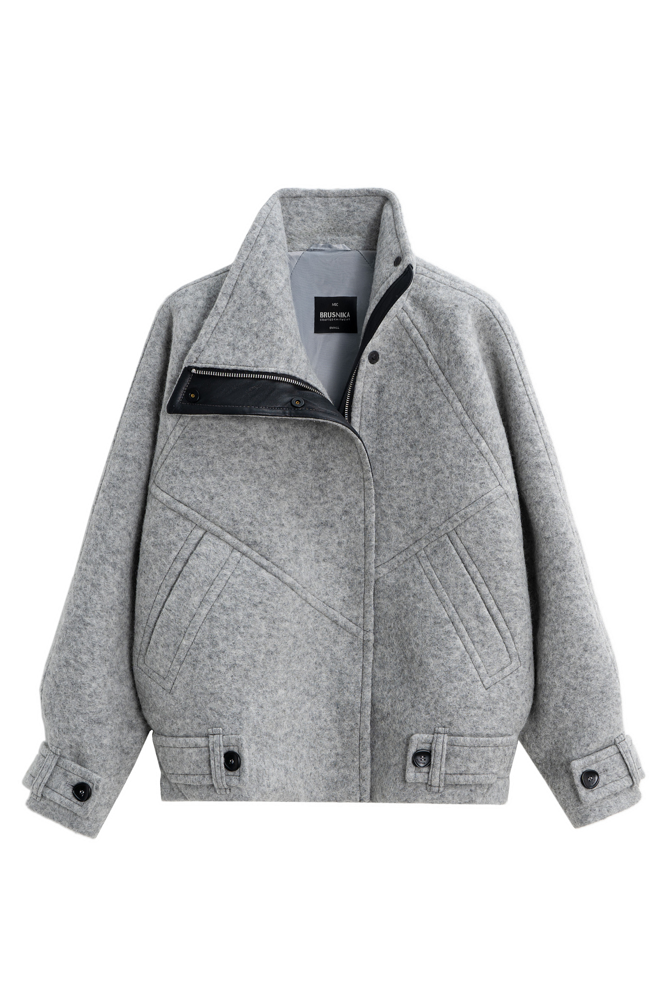 Шерстяной бомбер с воротником-стойкой. Модель свободного силуэта, с патами на пуговицах на манжетах и по низу изделия, застежка на молнию и магнитные пуговицы под планкой, декорированной экокожей. Бомбер выполнен на подкладке.