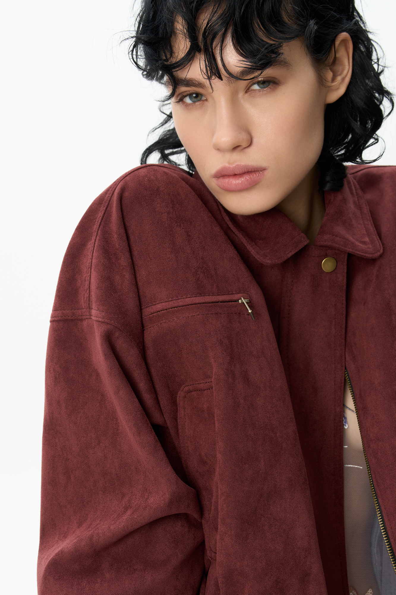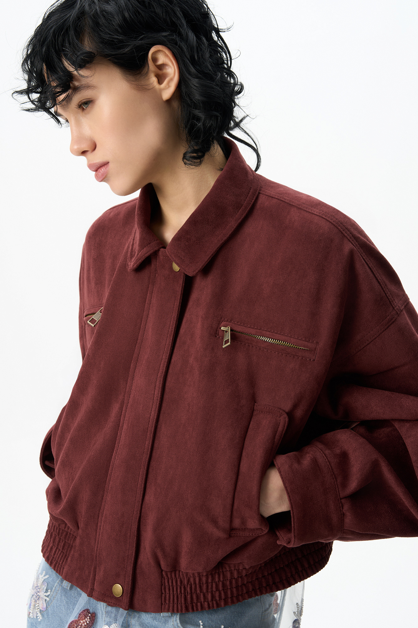 Бомбер из ткани с имитацией внешнего вида и свойств натуральной замши. Модель свободного силуэта со спущенной линией плеча, с отложным воротником, двумя нагрудными карманами на молнии и двумя боковыми карманами. Низ изделия выполнен на резинке. Застежка на молнию под планкой. На подкладке.