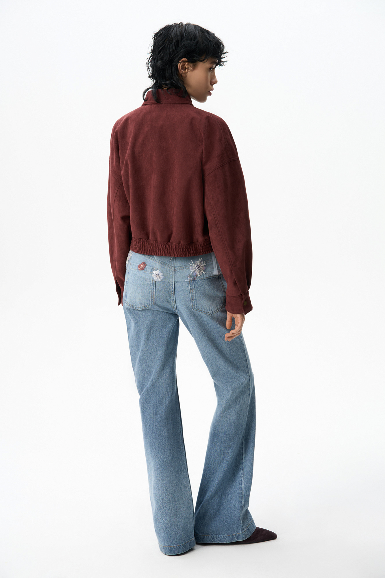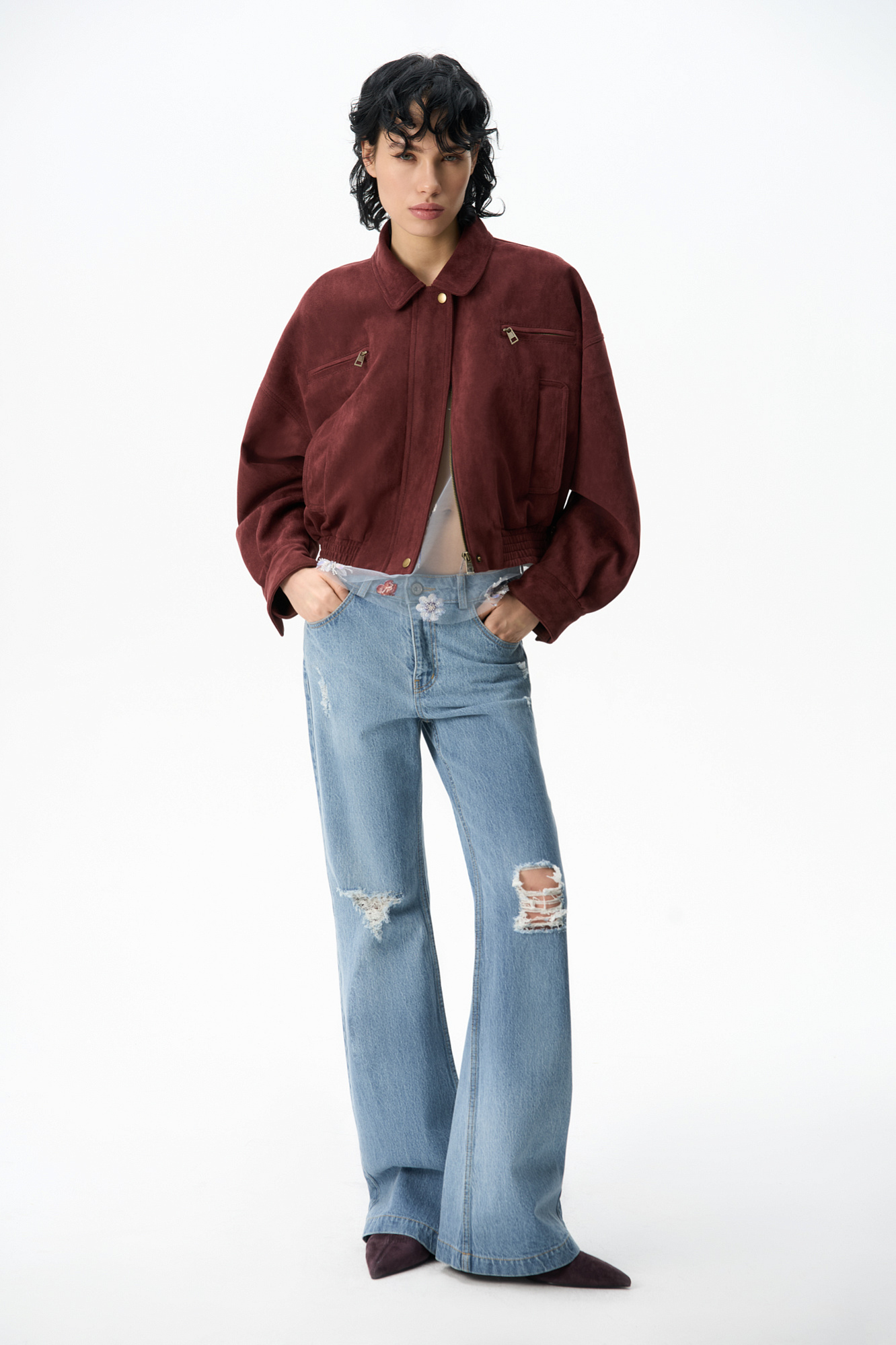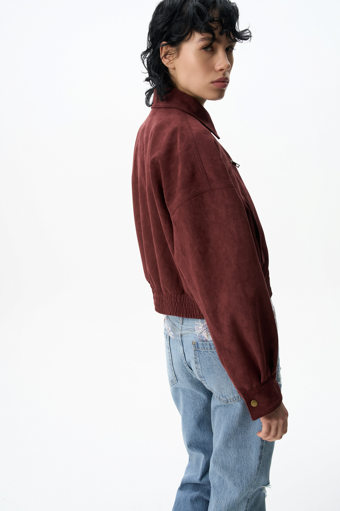 Бомбер из замши с отложным воротником
