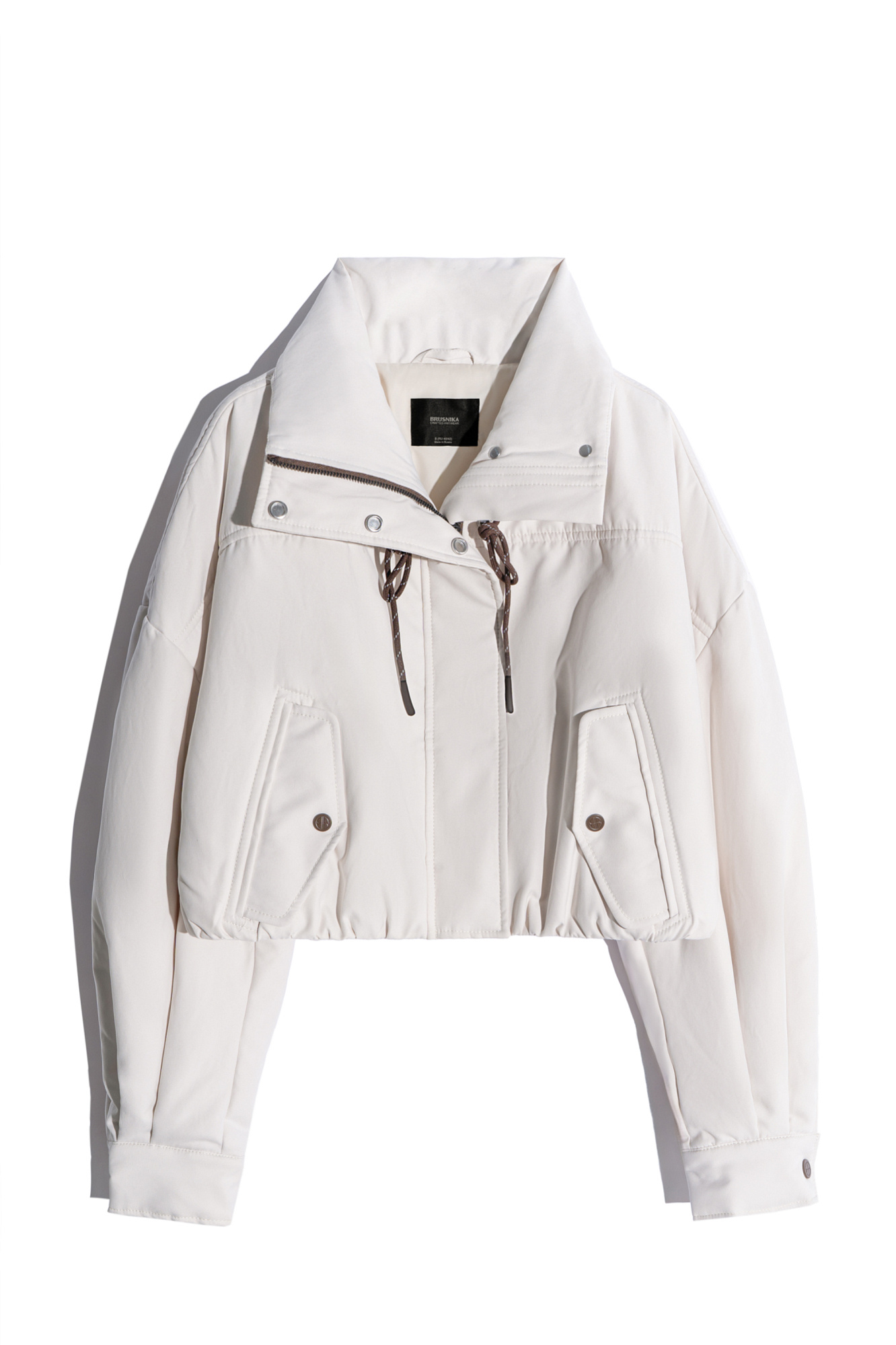 Объемный бомбер с воротником-стойкой. Модель укороченного силуэта со спущенной линией плеч, глубокими врезными карманами и застежкой на молнию под планку с кнопками. Манжеты рукавов декорированы металлическими брендированными кнопками.
