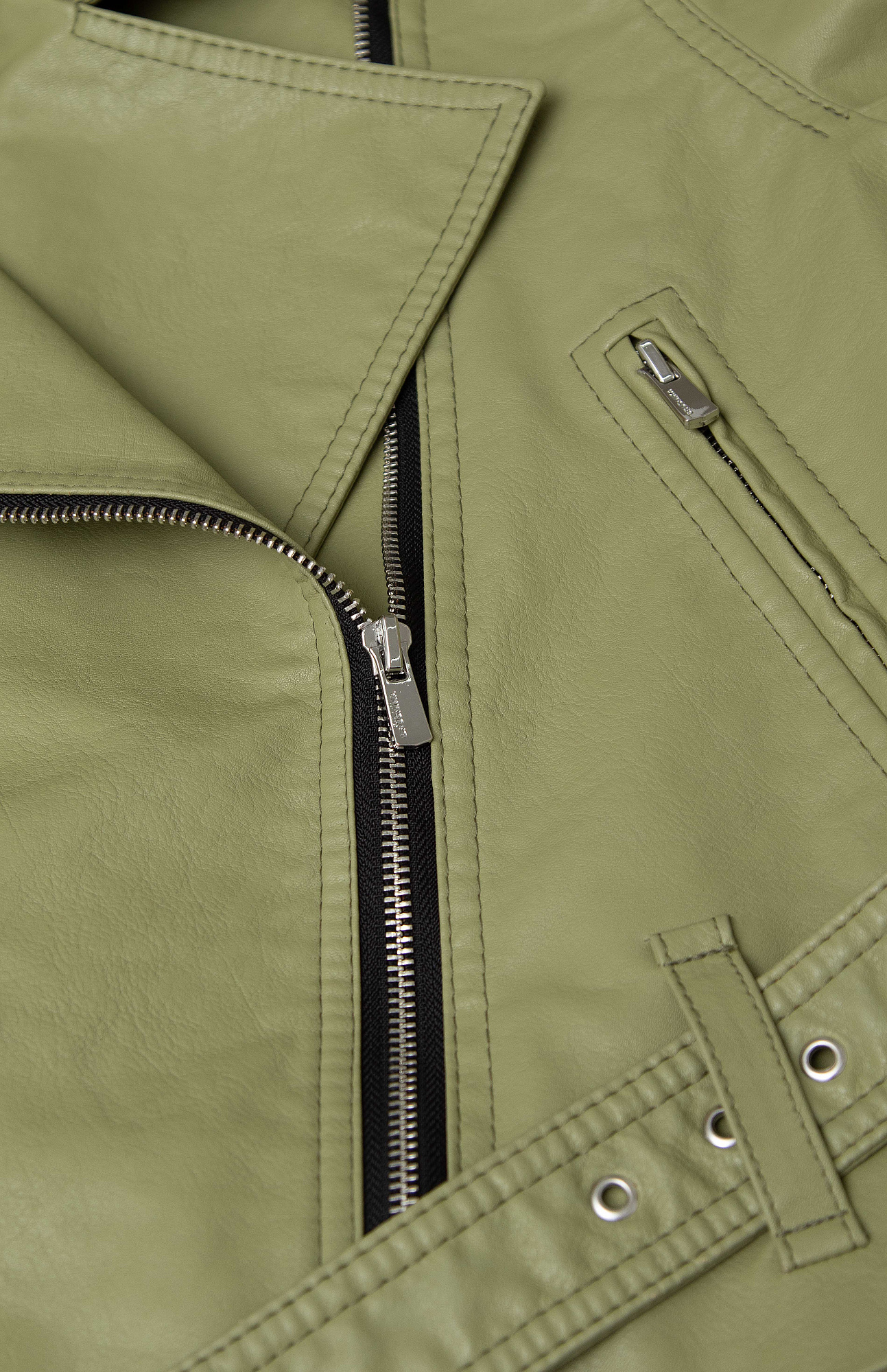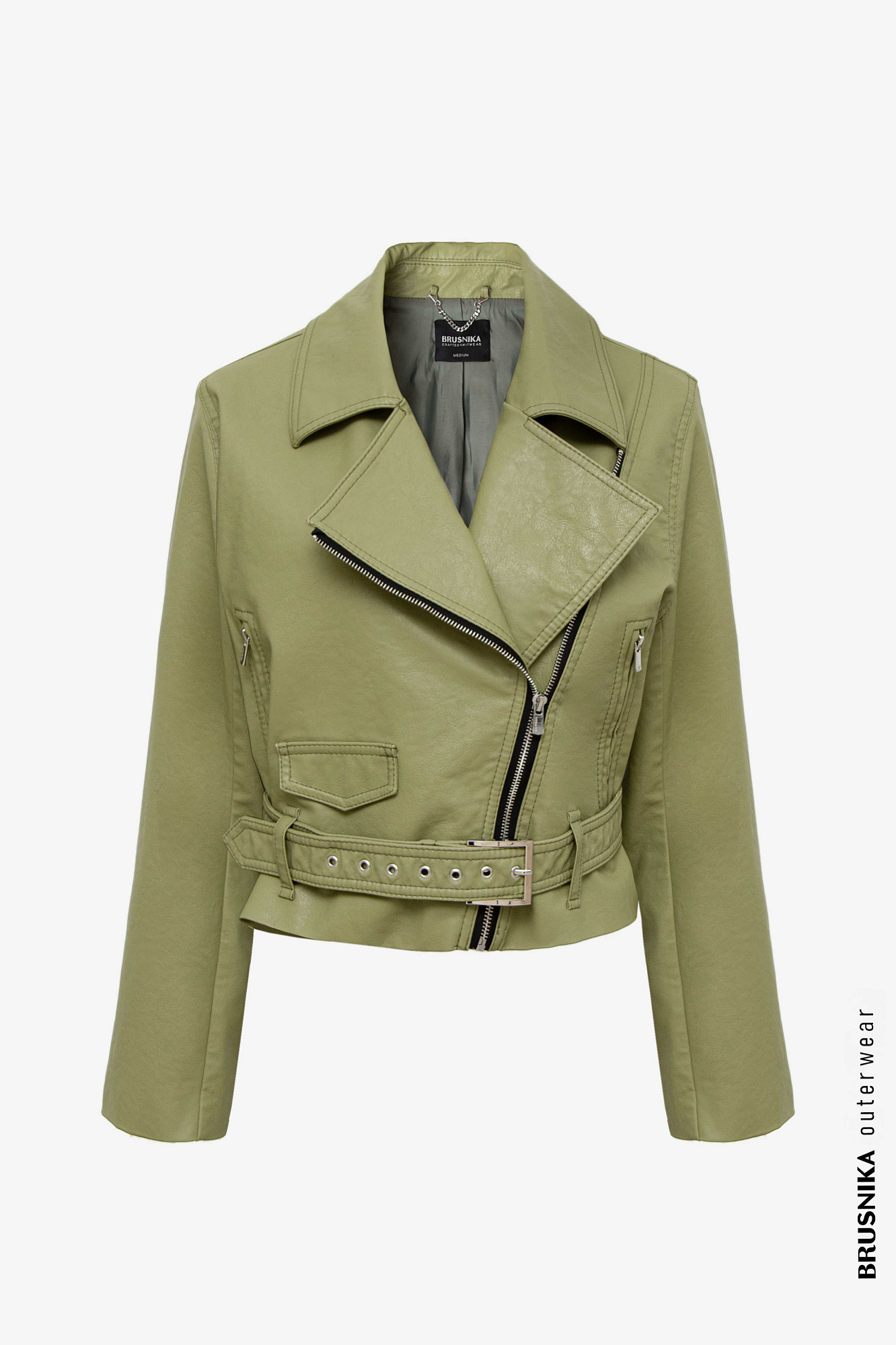 Укороченная куртка из эко-кожи с карманом сбоку. Застежка на молнии.
