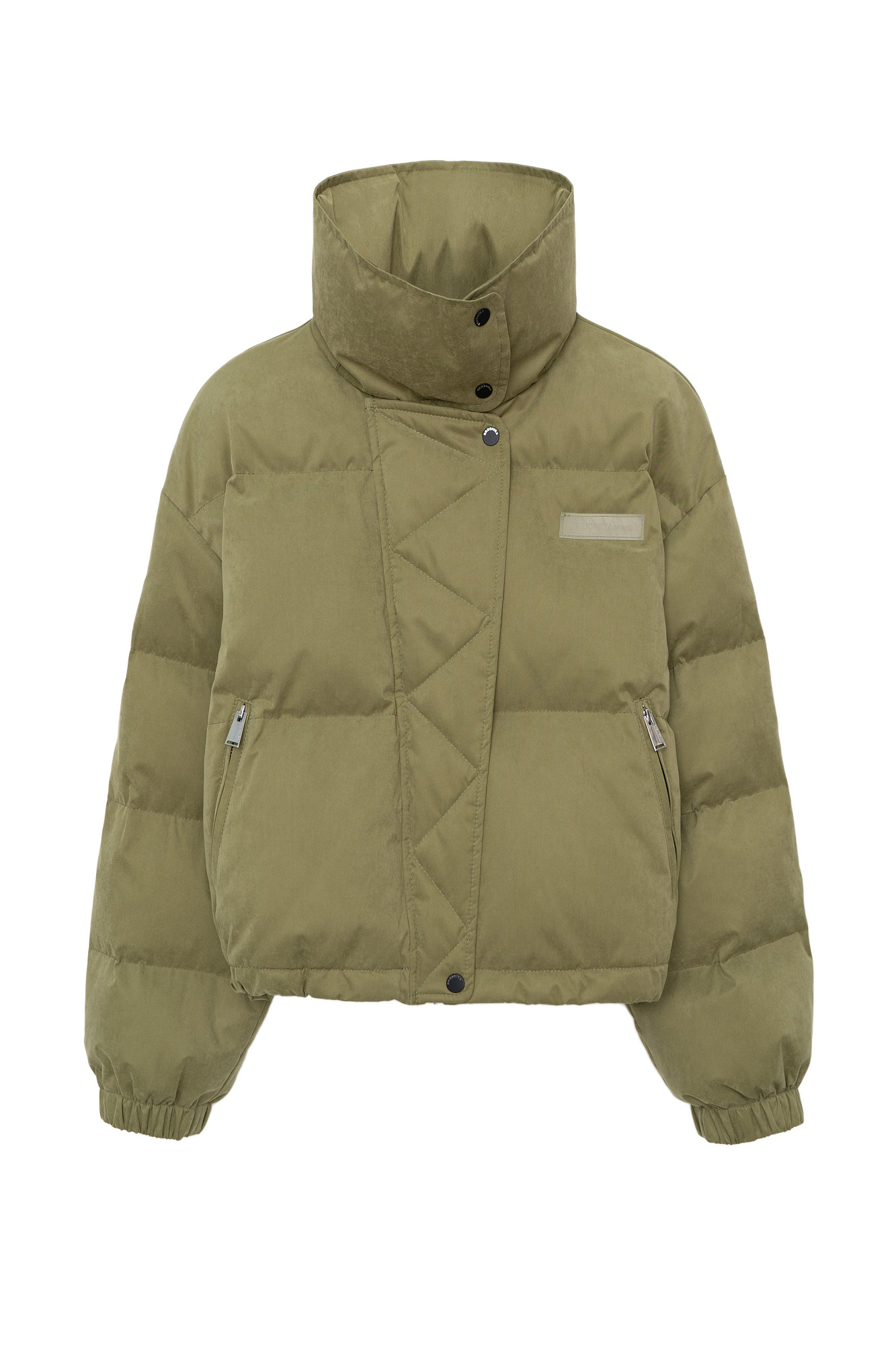 Утепленный пуховик с воротником-стойкой и капюшоном на молнии. Модель свободного силуэта с боковыми карманами, спущенным плечом и брендированным ярлыком на груди. Застежка на потайную молнию и кнопки. Наполнитель натуральный пух 90% перо 10%.
