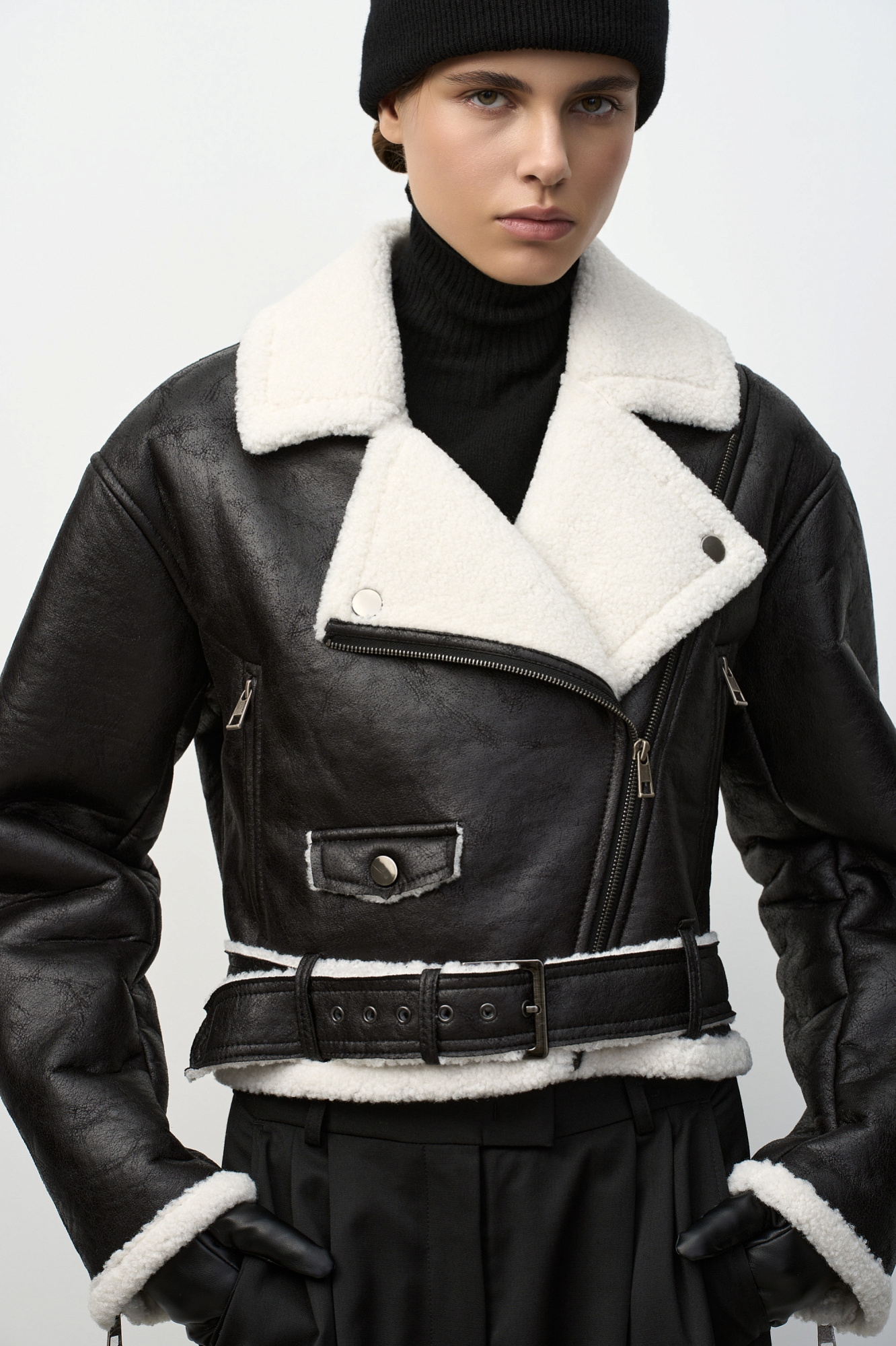 Дубленка-косуха с подкладкой из экомеха. Укороченная модель приталенного силуэта. Застежка на молнию, два кармана на молниях, ремень из основной ткани с металлической пряжкой.