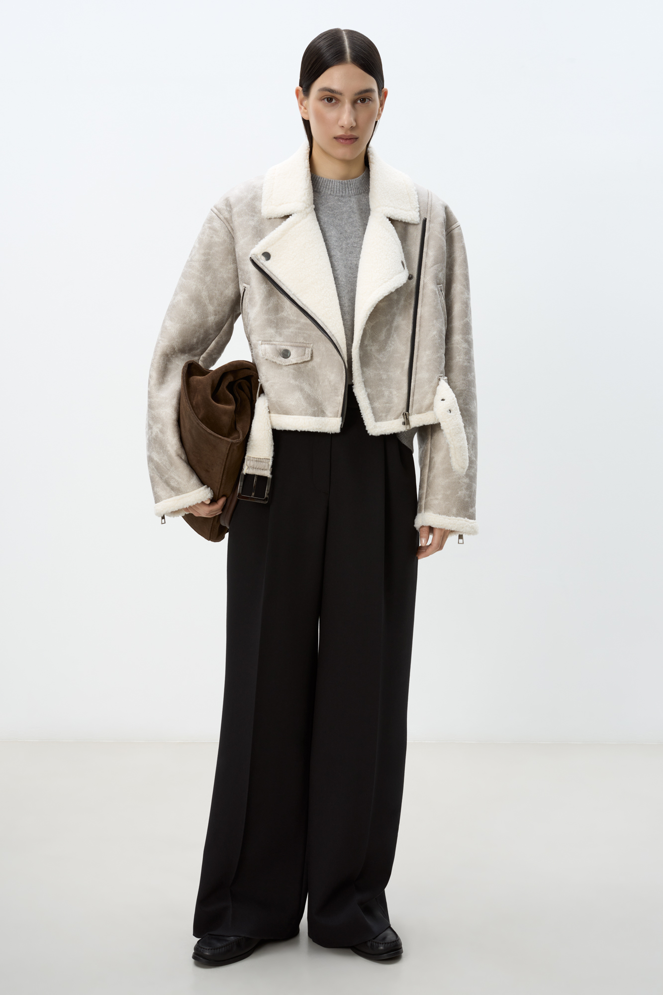 Дубленка-косуха с подкладкой из экомеха. Укороченная модель приталенного силуэта. Застежка на молнию, два кармана на молниях, ремень из основной ткани с металлической пряжкой.