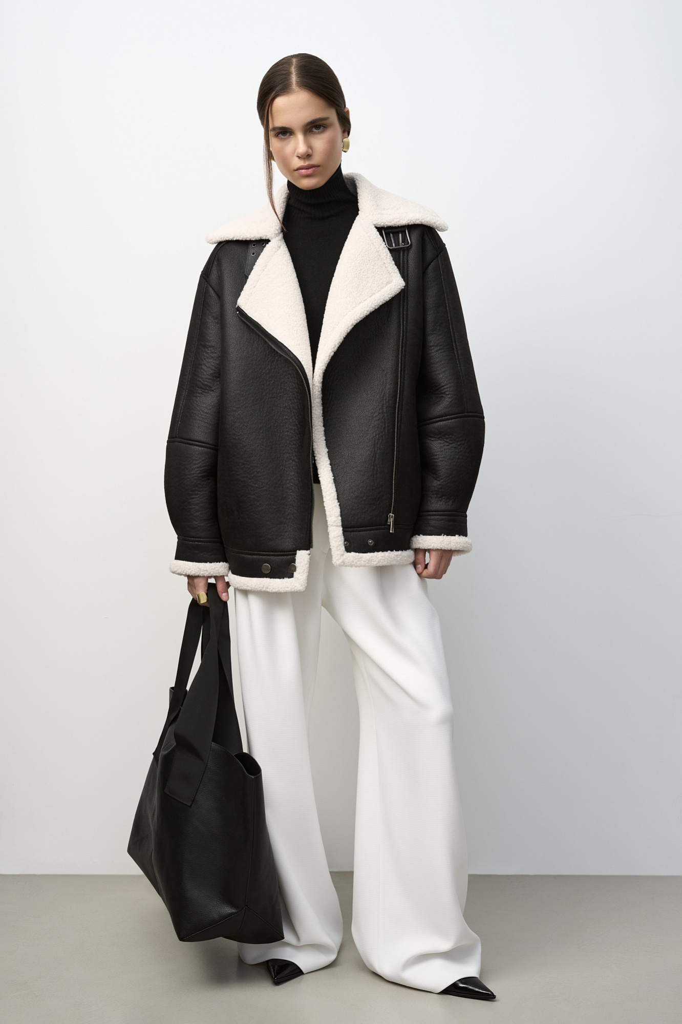 Дубленка из экокожи с подкладкой из экомеха. Модель свободного силуэта со спущенной линией плеча, боковыми карманами и косой застежкой.