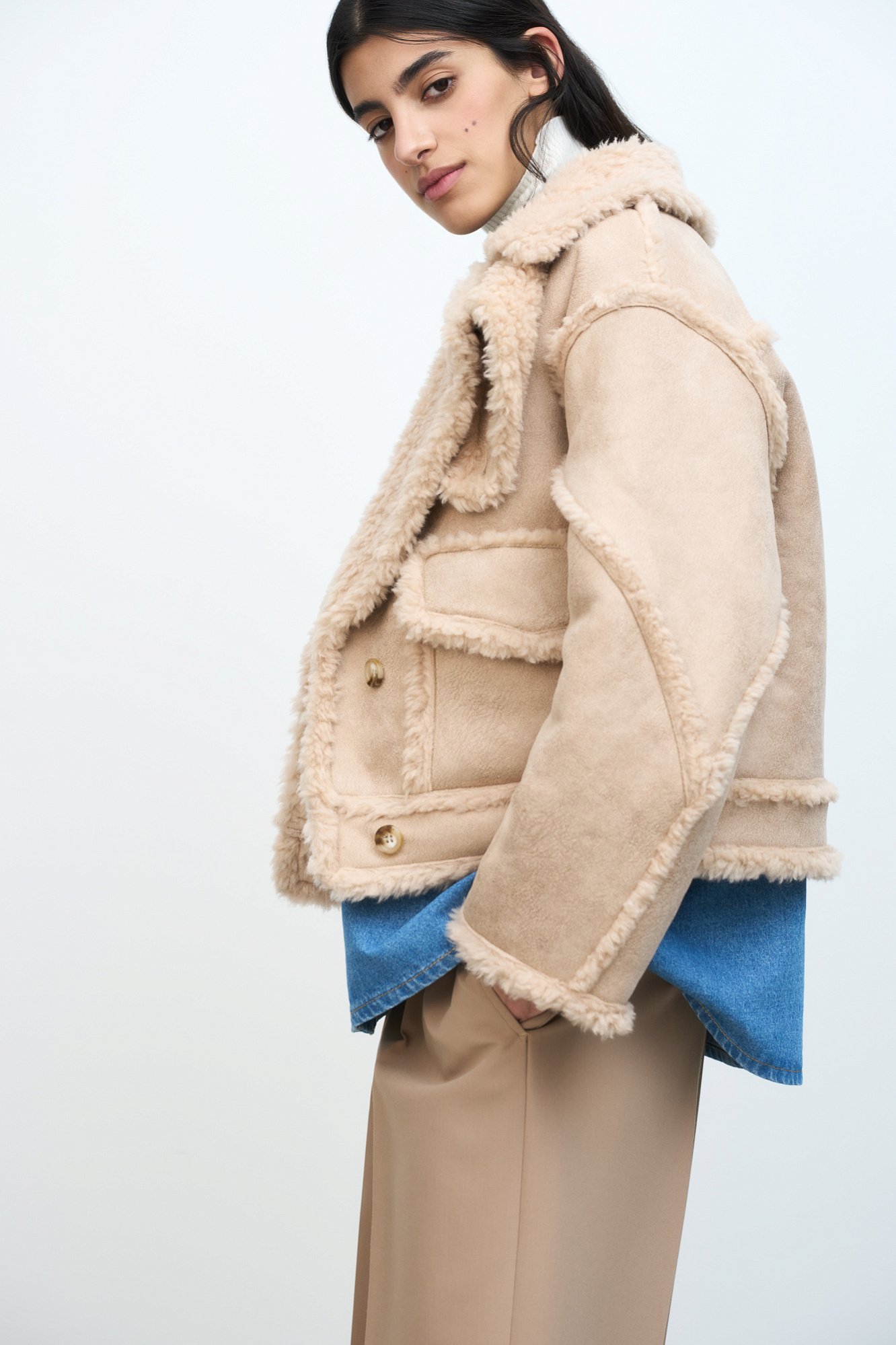 Укороченная дубленка из шерсти с накладными карманами. Модель приталенного силуэта со спущенной линией плеча, брендированным ярлыком на спине и отстегивающимся воротником. Застежка на пуговицы.