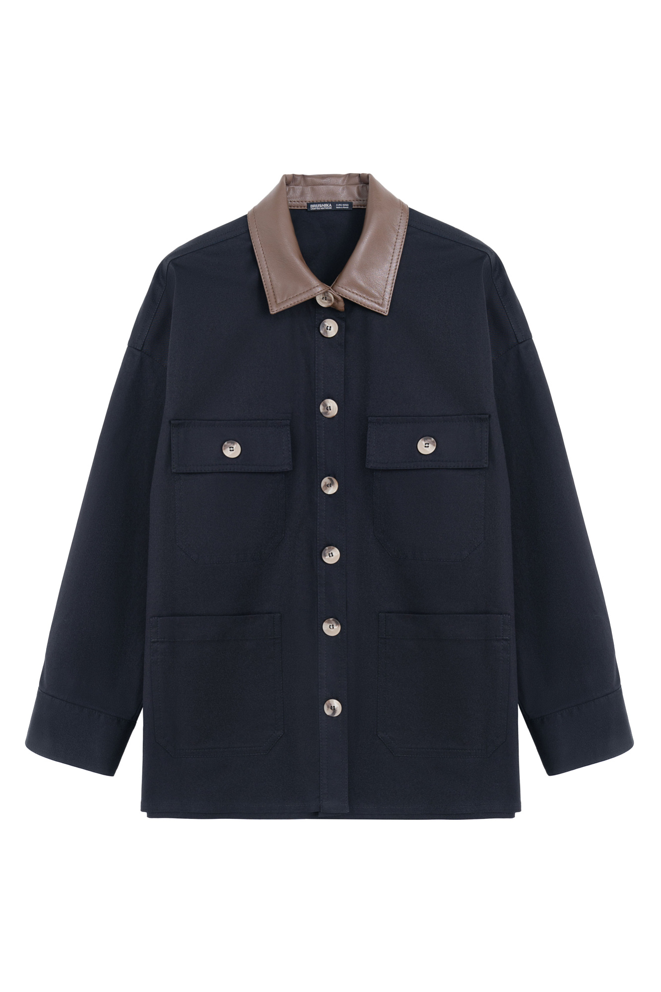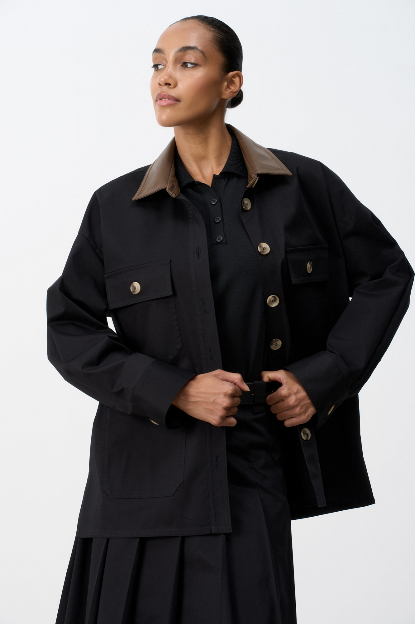 Куртка с накладными карманами. Модель свободного силуэта, воротник декорирован вставкой из экокожи. Ткань с водоотталкивающим тефлоновым напылением. Дополнить образ можно юбкой в таком же стиле.