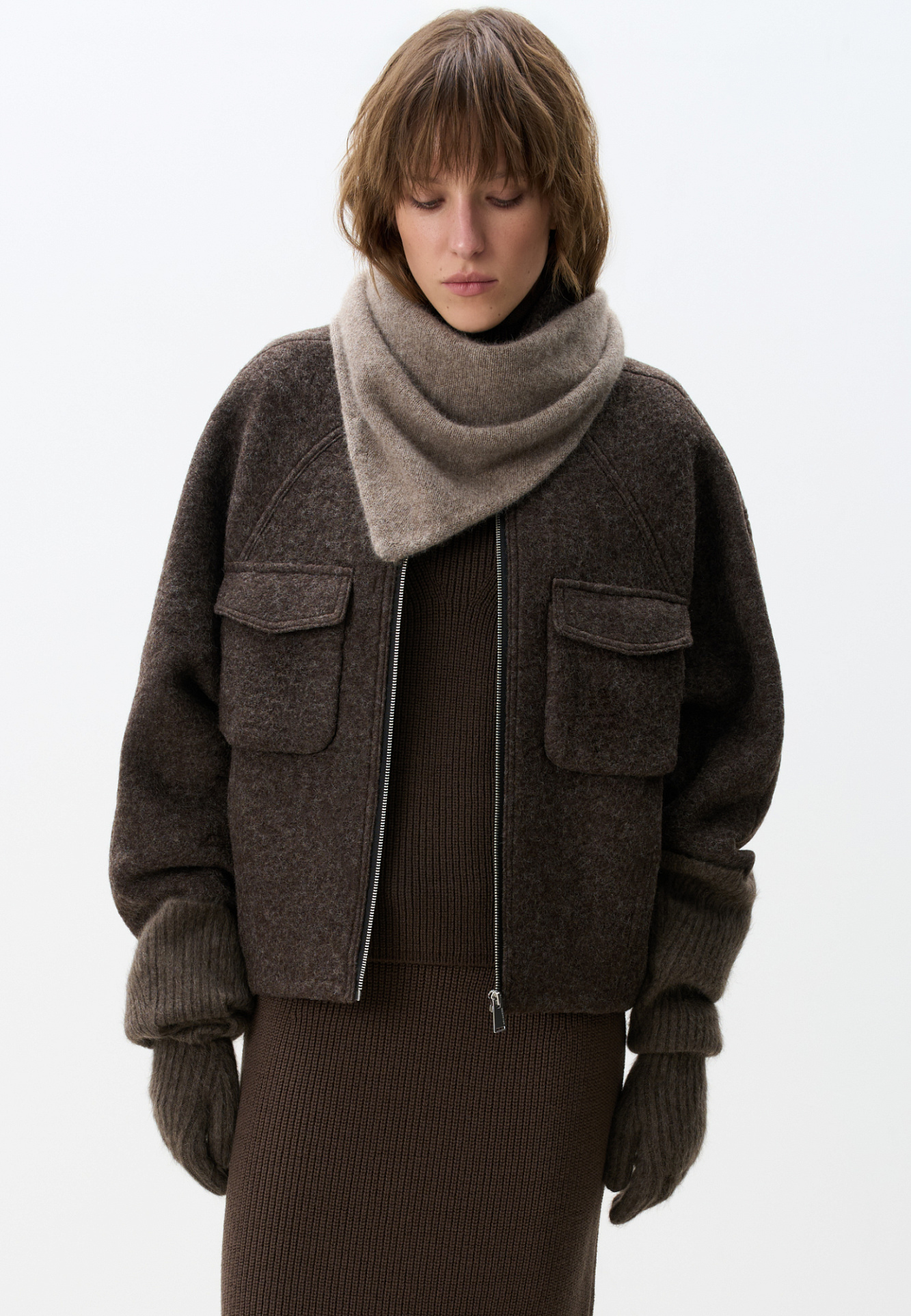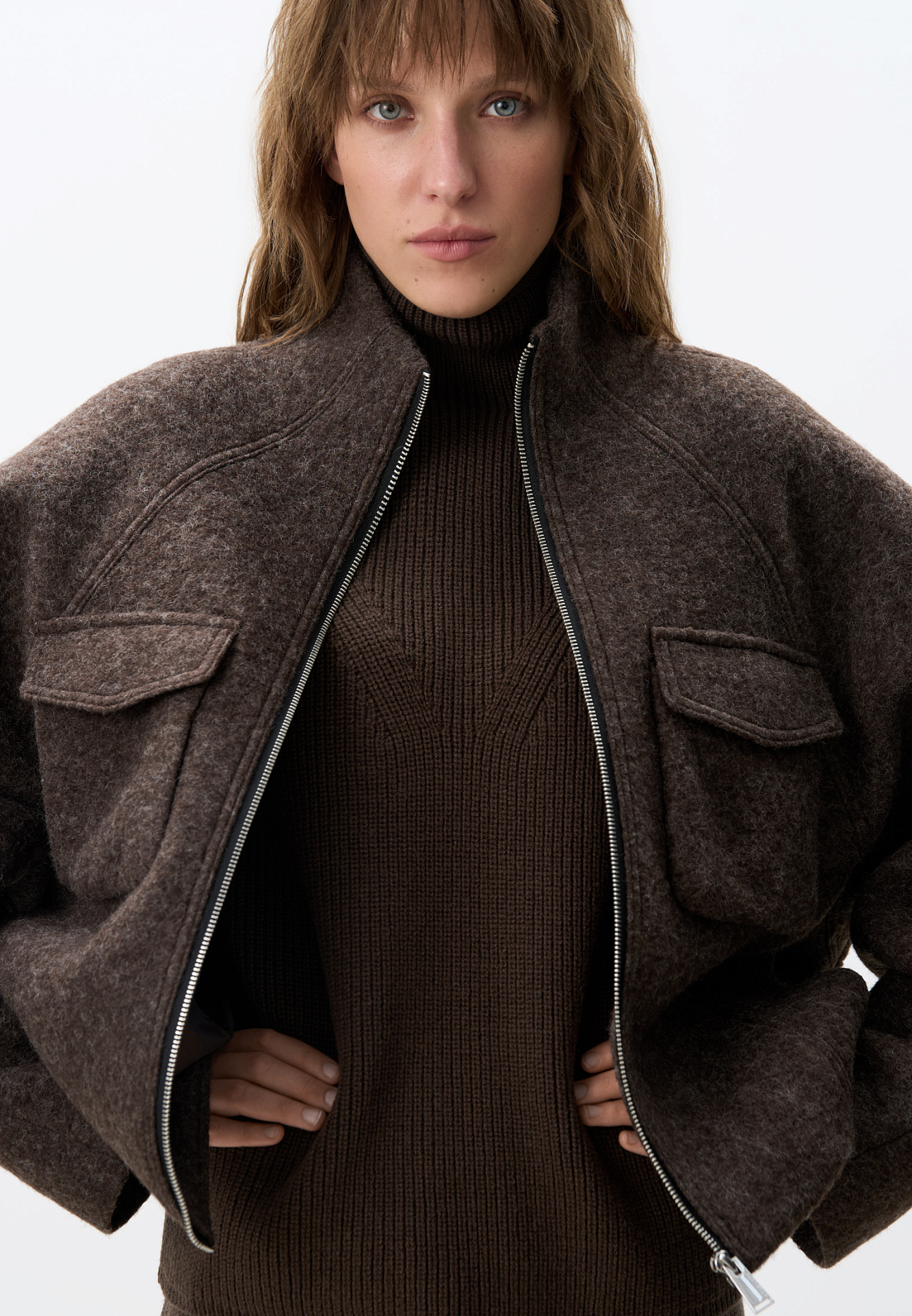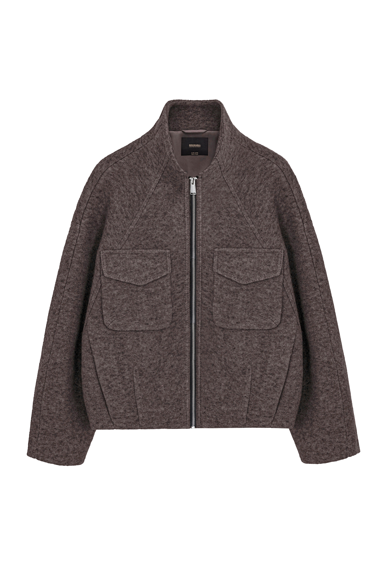 Шерстяная куртка на подкладке. Модель свободного силуэта со спущенной линией плеча, накладными карманами на груди и воротником-стойкой. Застежка на молнию.