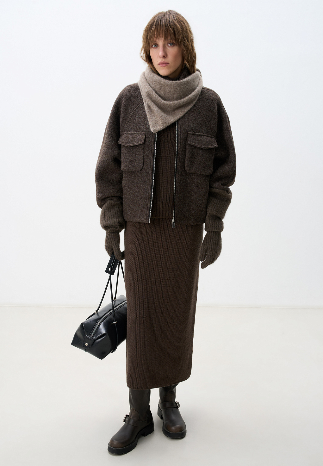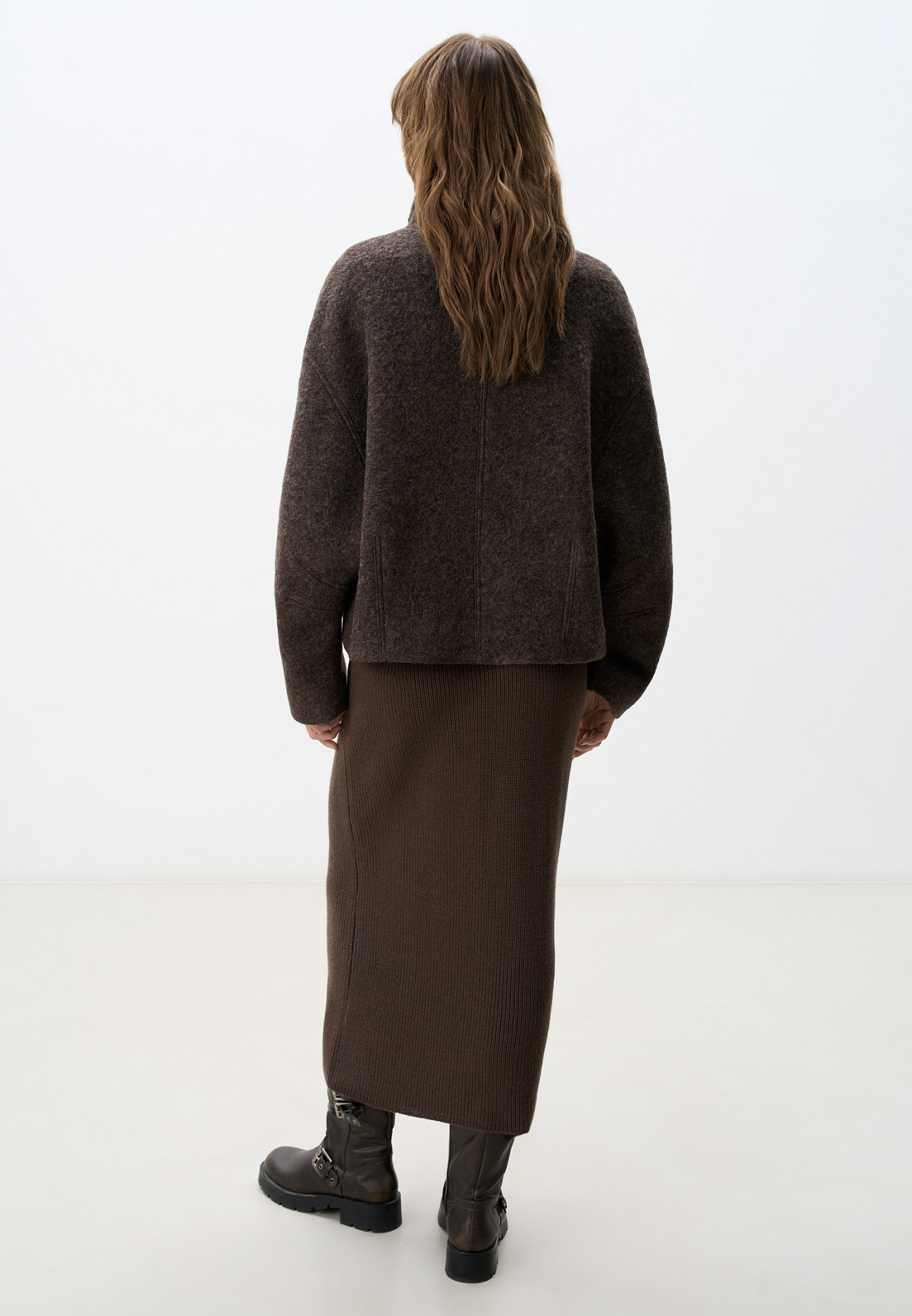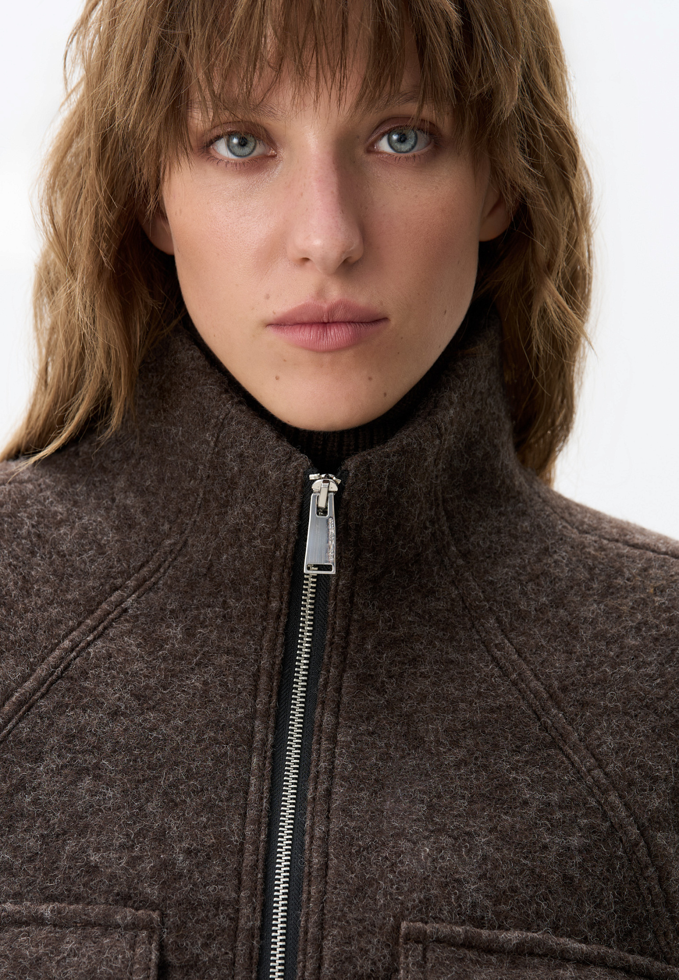 Шерстяная куртка на подкладке. Модель свободного силуэта со спущенной линией плеча, накладными карманами на груди и воротником-стойкой. Застежка на молнию.