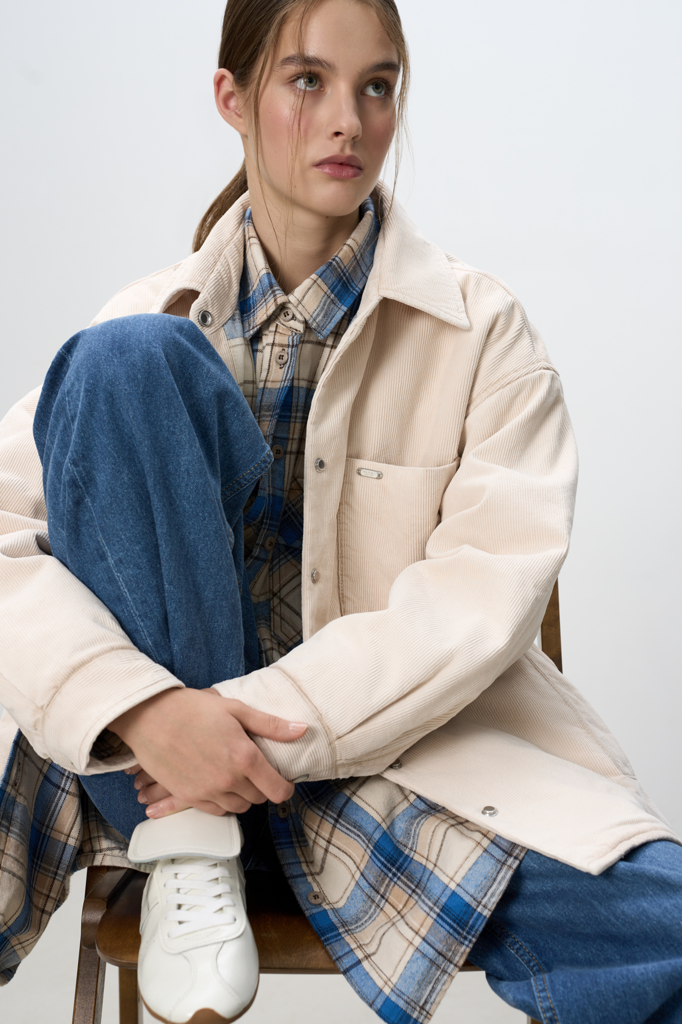 Вельветовая куртка из 100% хлопка. Модель свободного силуэта со спущенной линией плеча, боковыми и нагрудными карманами. Манжеты на пуговицах. Застежка на магнитные кнопки. Изделие на подкладке.