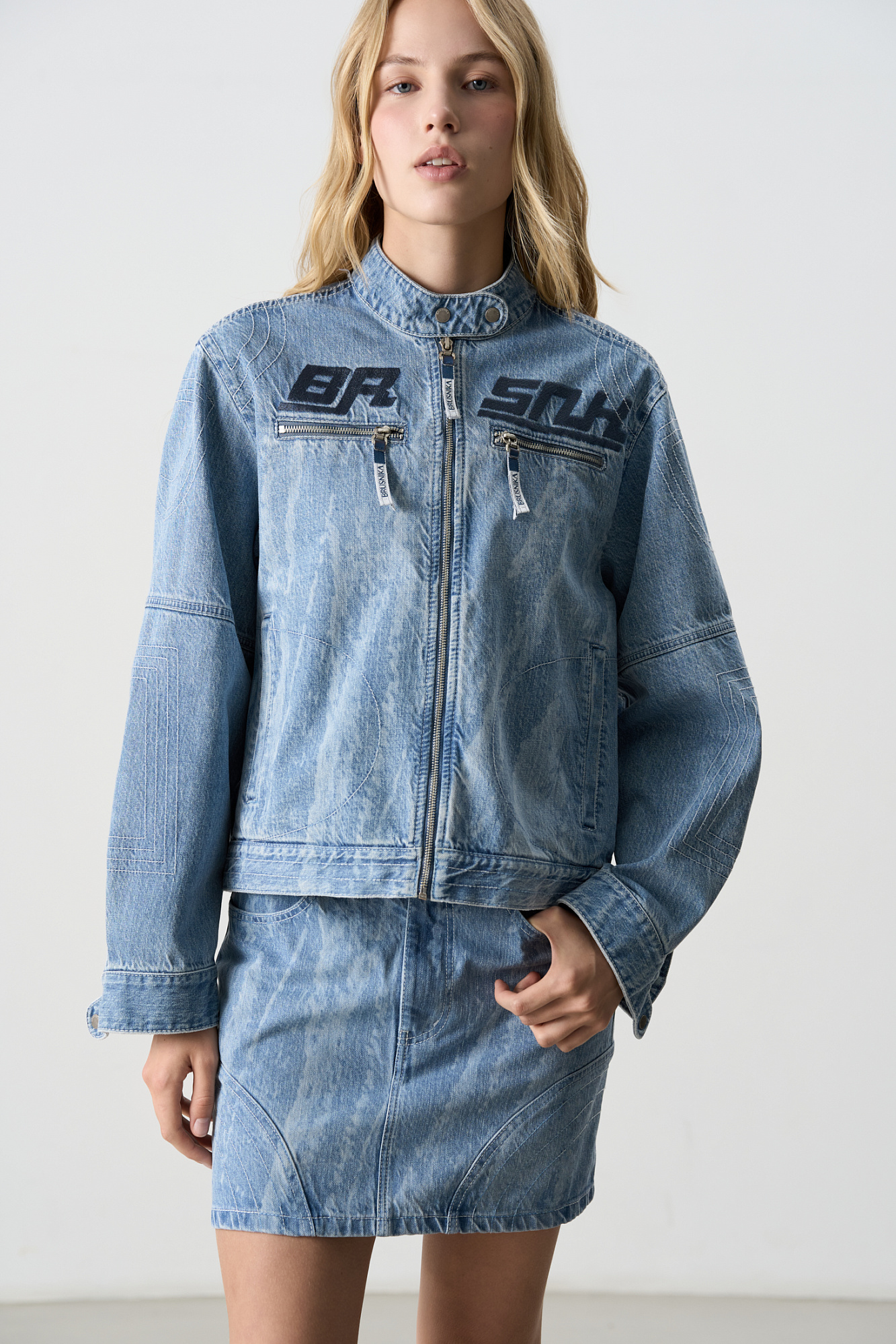 Джинсовая куртка из 100% хлопка. Модель свободного силуэта с коротким воротником-стойкой. Изделие декорировано отстрочкой контрастного цвета, формирующей графические акценты на плечах и рукавах, брендированной вышивкой на груди, боковыми карманами и карманами на груди под молнией. Застежка на молнию. Без подкладки.