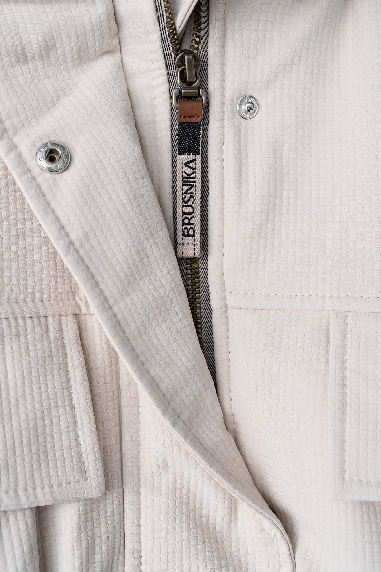 Длинная куртка на синтепоне из текстурной ткани. Модель свободного силуэта со спущенной линией плеча, накладными и боковыми карманами, воротником-стойкой и капюшоном. Изделие на подкладке. Застежка на молнию под планкой с кнопками.