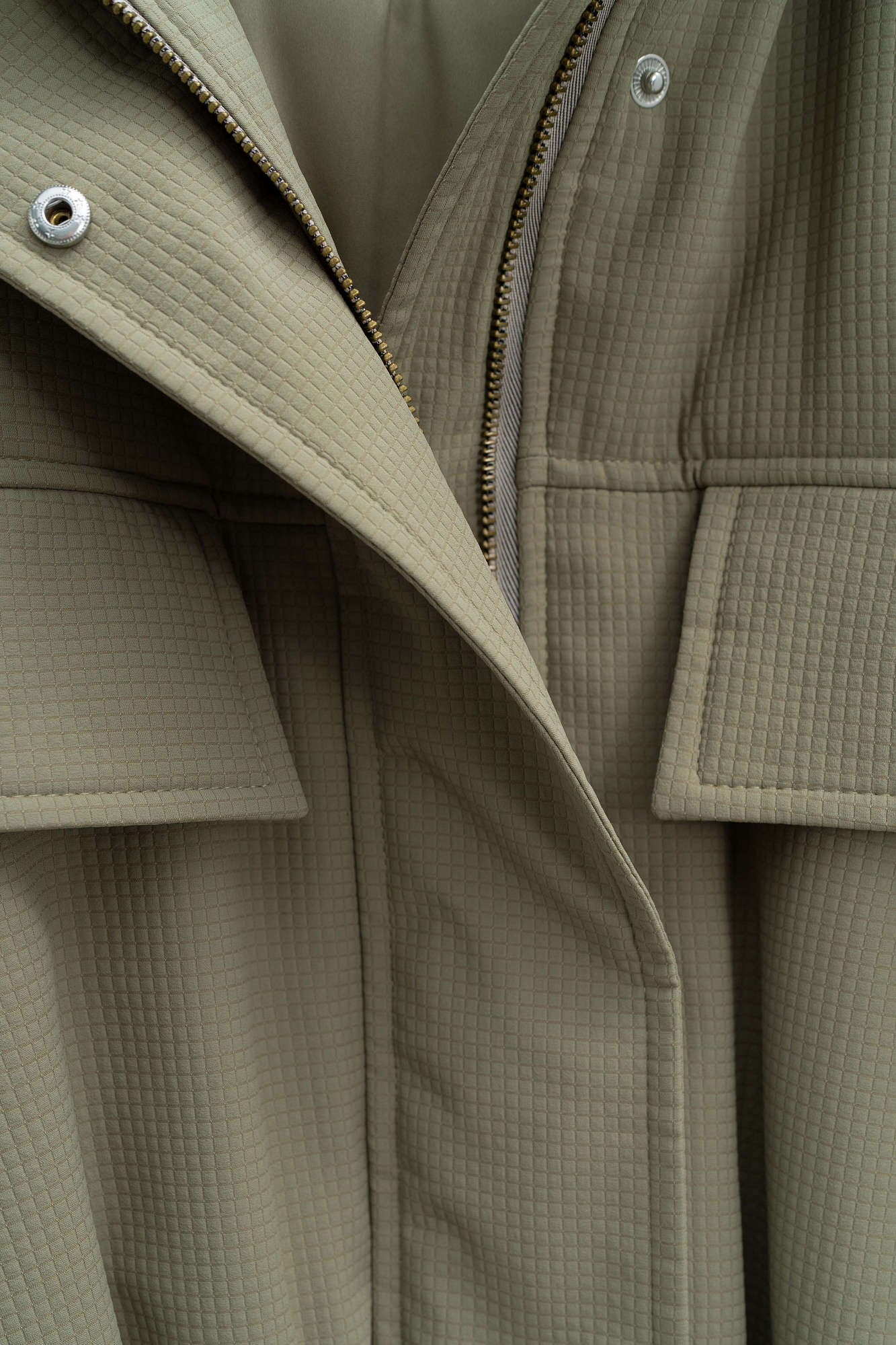 Длинная куртка на синтепоне из текстурной ткани. Модель свободного силуэта со спущенной линией плеча, накладными и боковыми карманами, воротником-стойкой и капюшоном. Изделие на подкладке. Застежка на молнию под планкой с кнопками.
