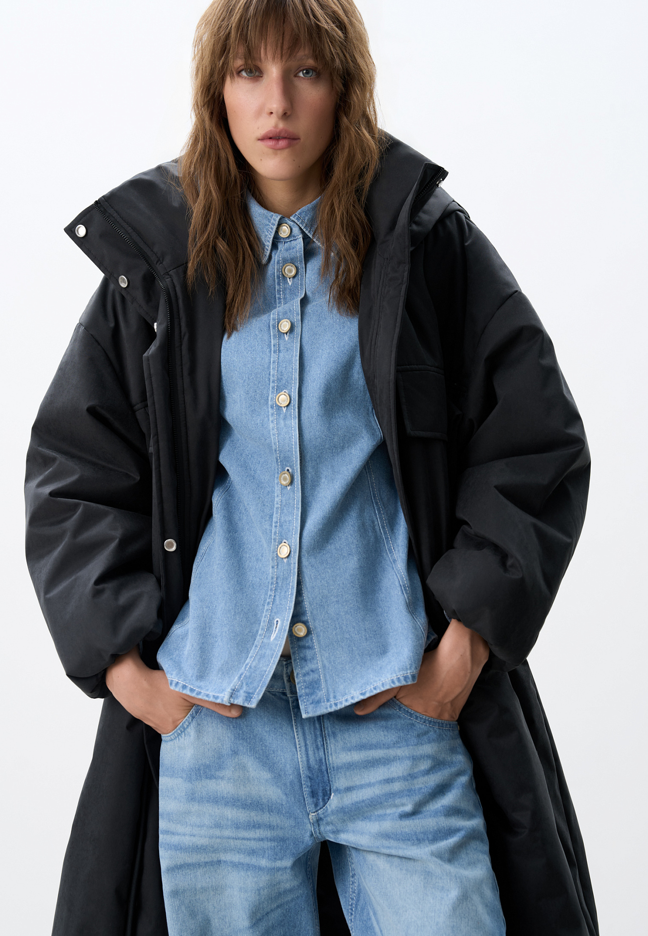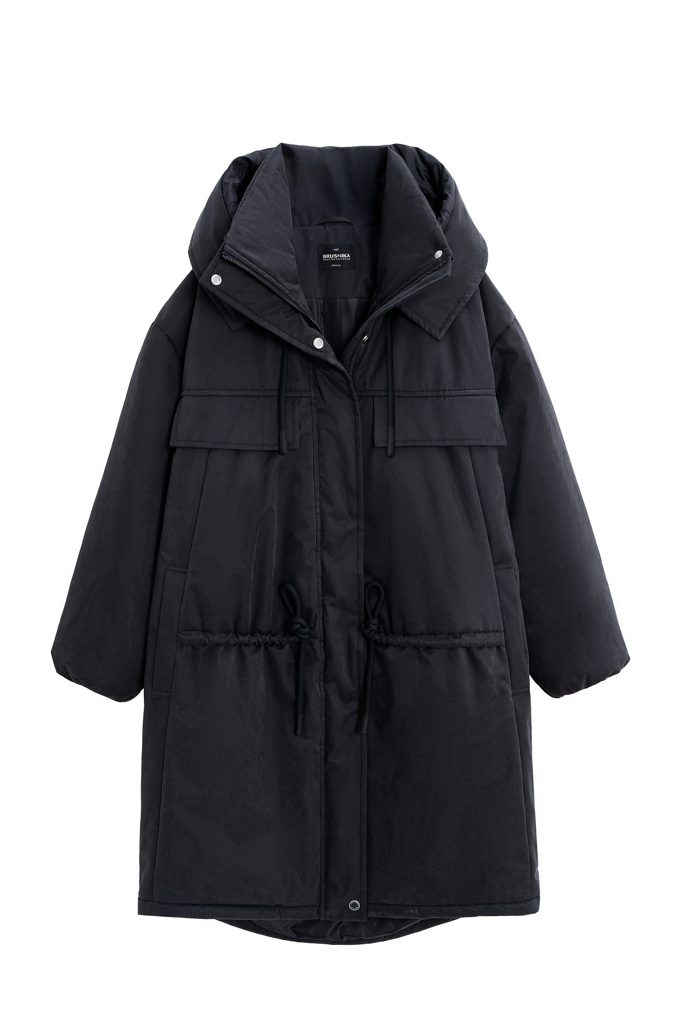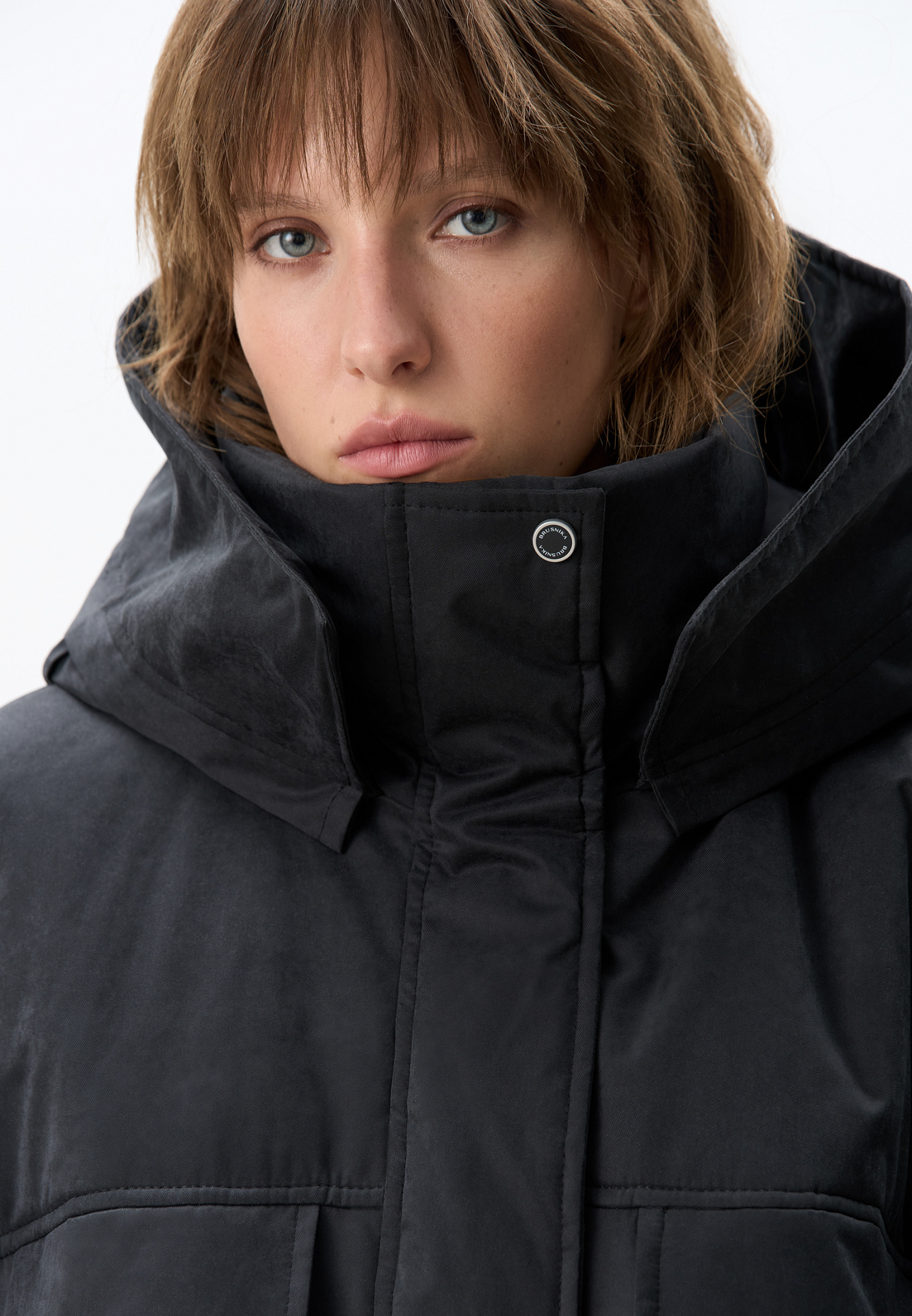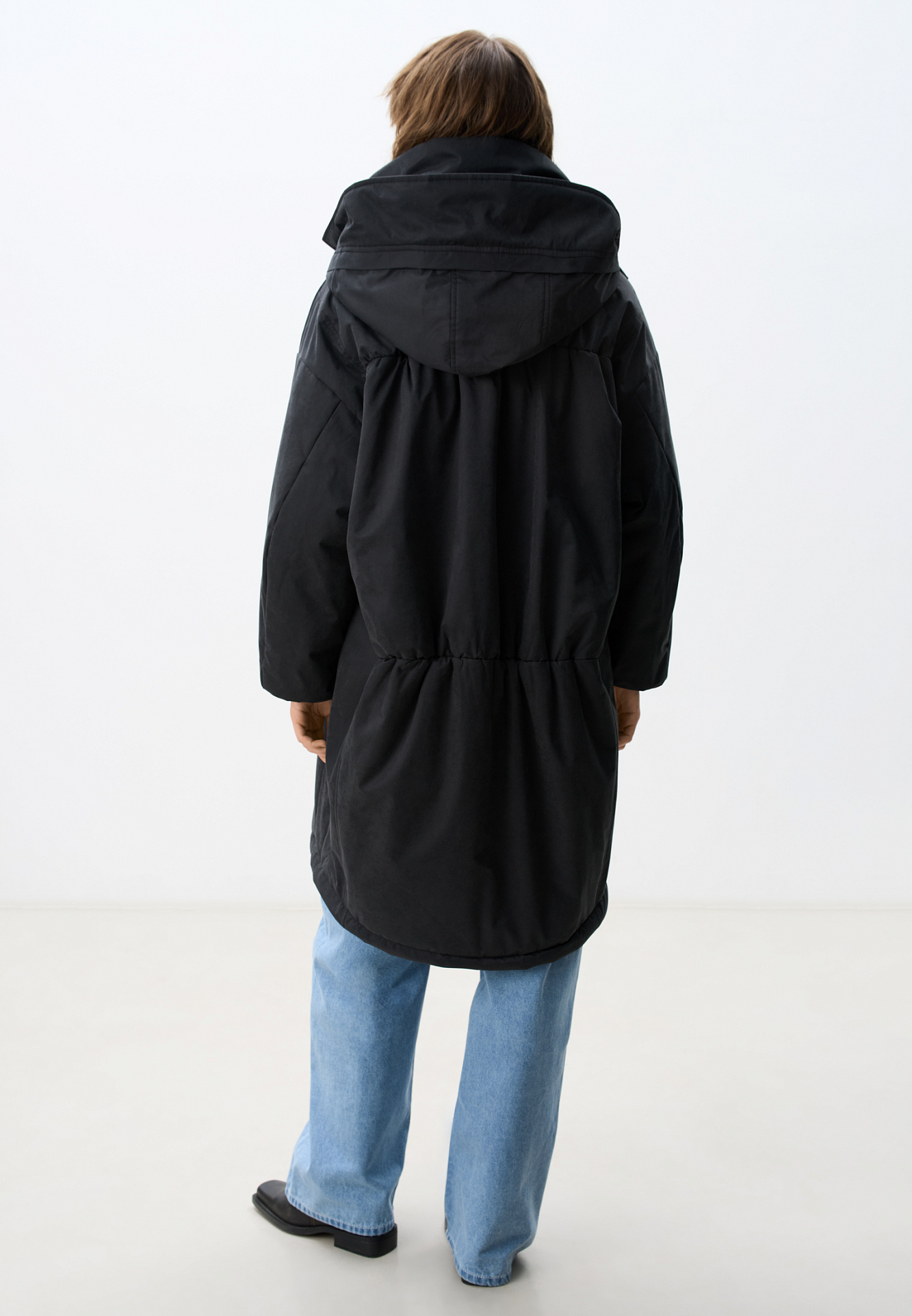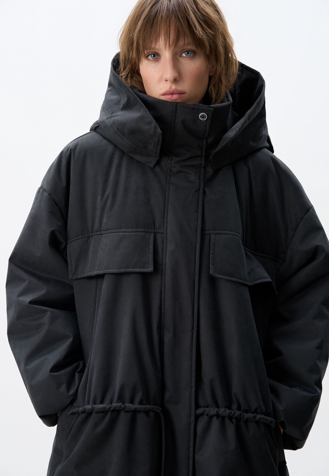 Длинная куртка на синтепоне с капюшоном. Модель свободного силуэта со спущенной линией плеча, накладными и боковыми карманами, регулируемой кулиской на поясе. Изделие на подкладке. Застежка на молнию и магнитные кнопки.