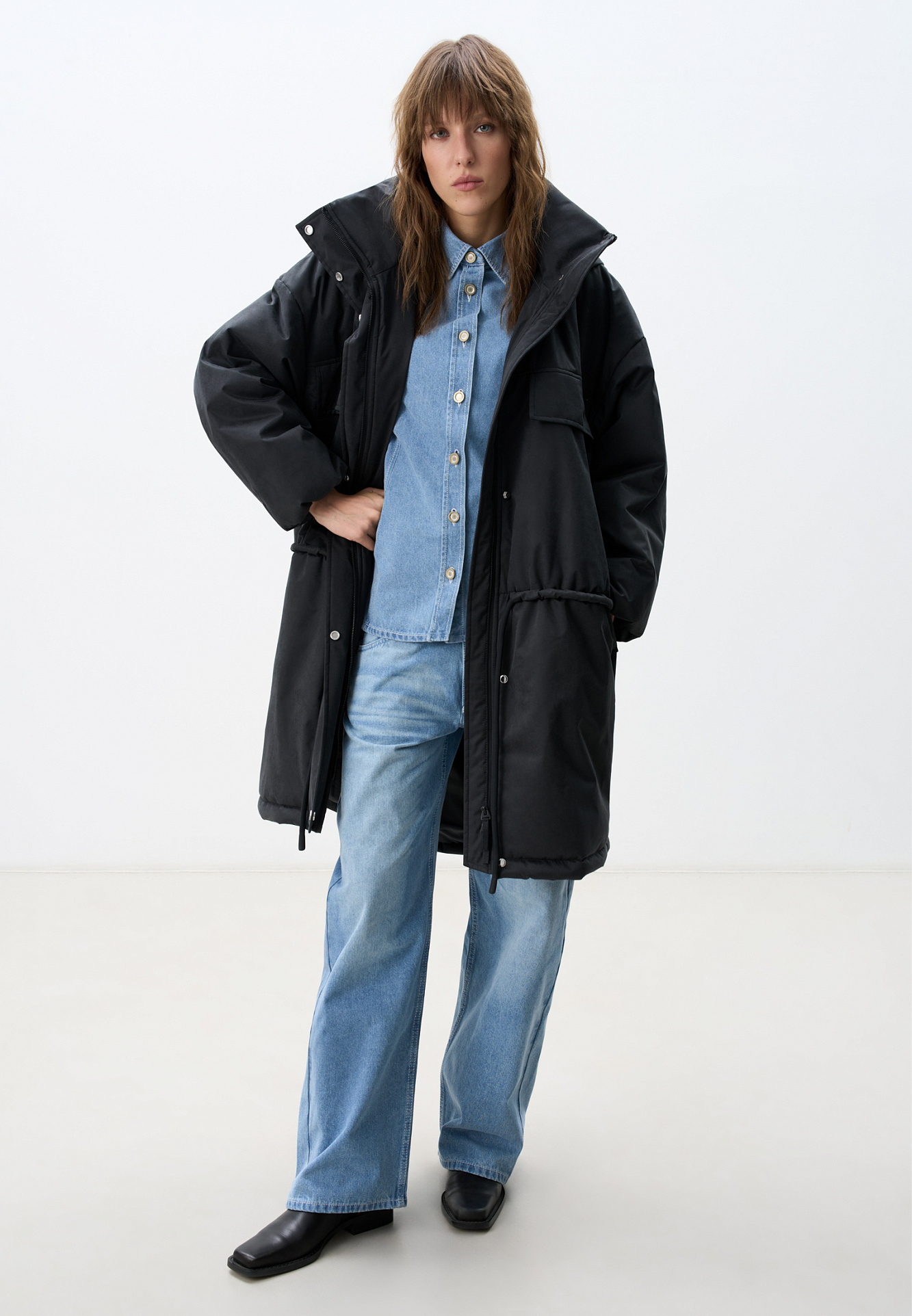 Длинная куртка на синтепоне с капюшоном. Модель свободного силуэта со спущенной линией плеча, накладными и боковыми карманами, регулируемой кулиской на поясе. Изделие на подкладке. Застежка на молнию и магнитные кнопки.