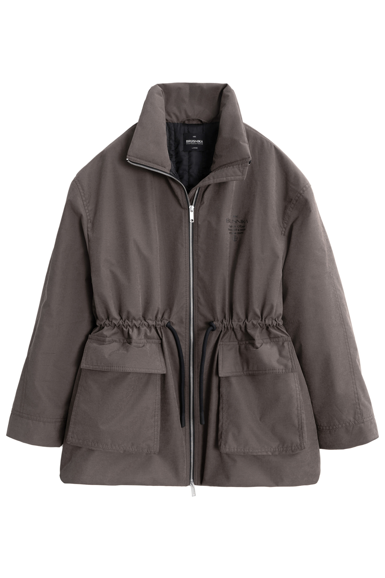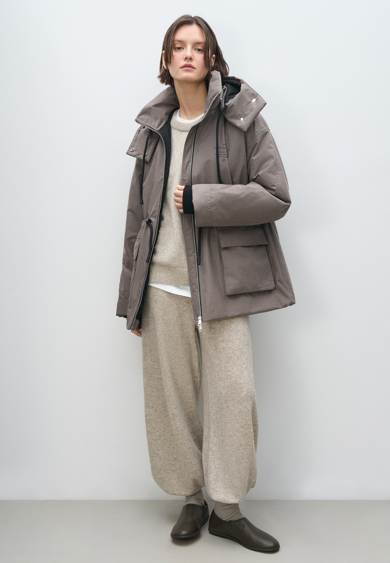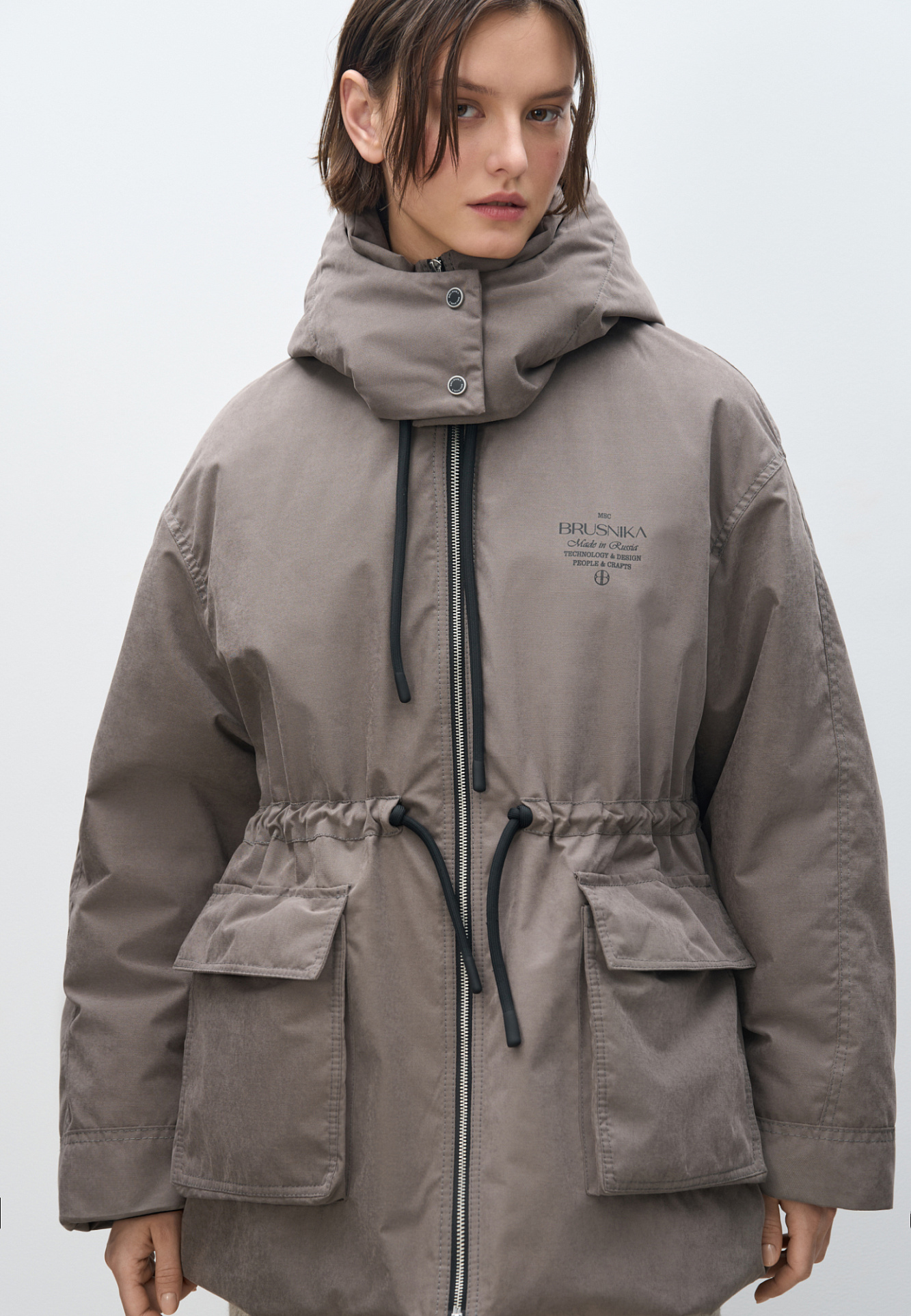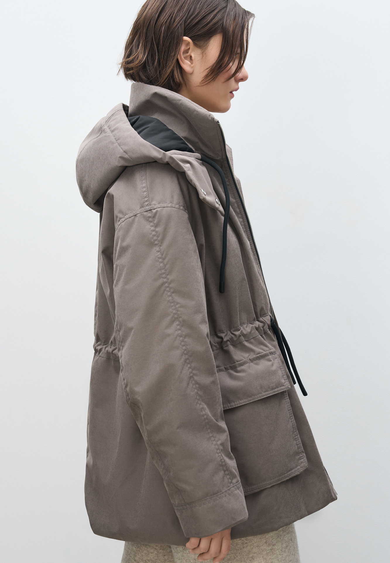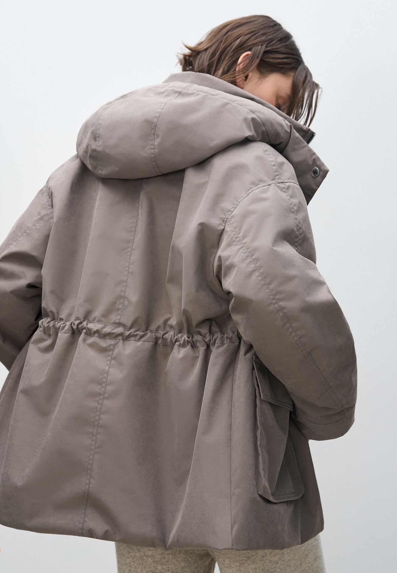 Парка на синтепоне. Модель свободного силуэта с регулируемой кулиской на талии, большими накладными карманами с клапанами, со спущенной линией плеч и воротником-стойкой. В комплекте к куртке идет дополнительный объемный воротник и капюшон. Застежка на молнию. Изделие выполнено на подкладке.