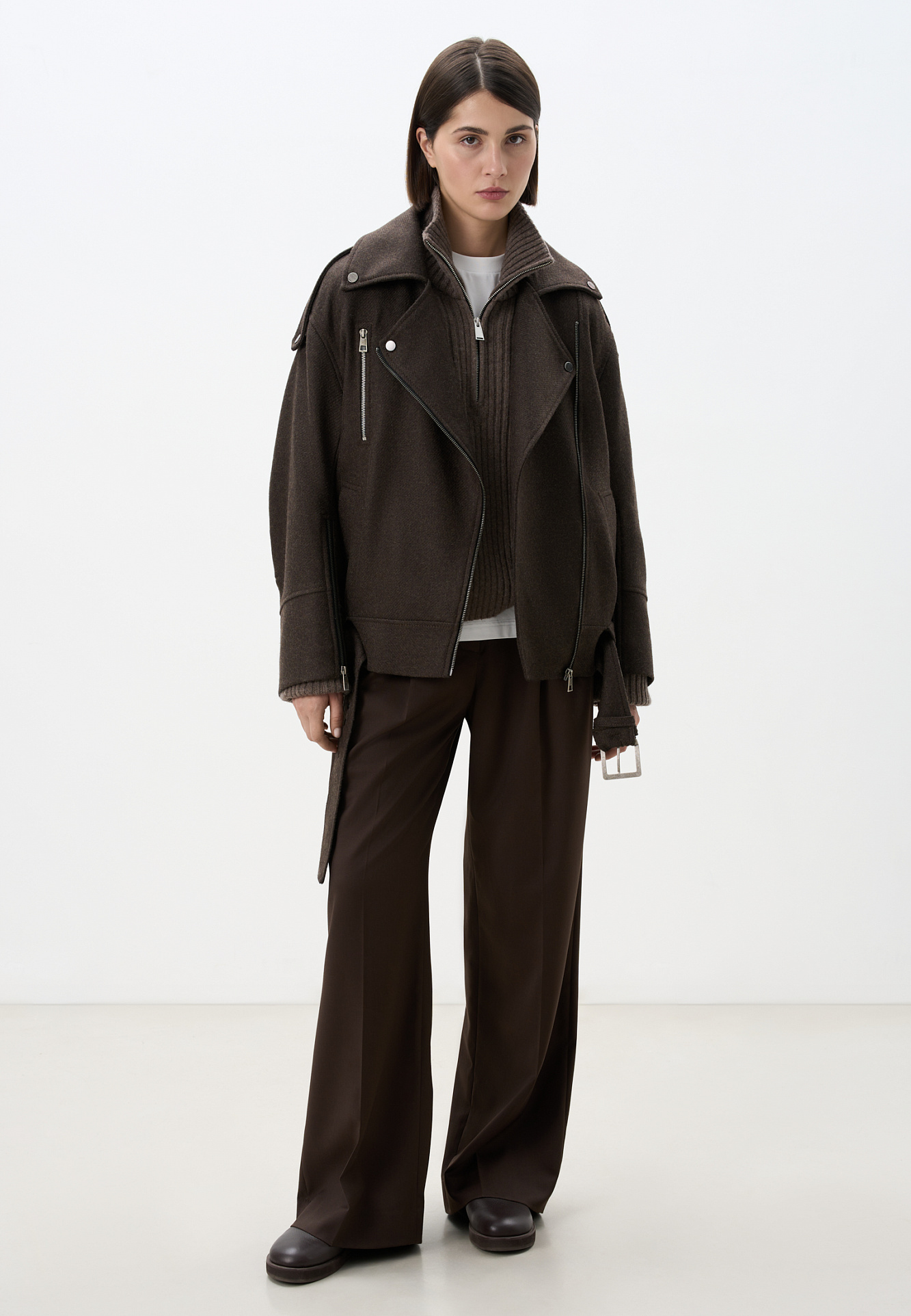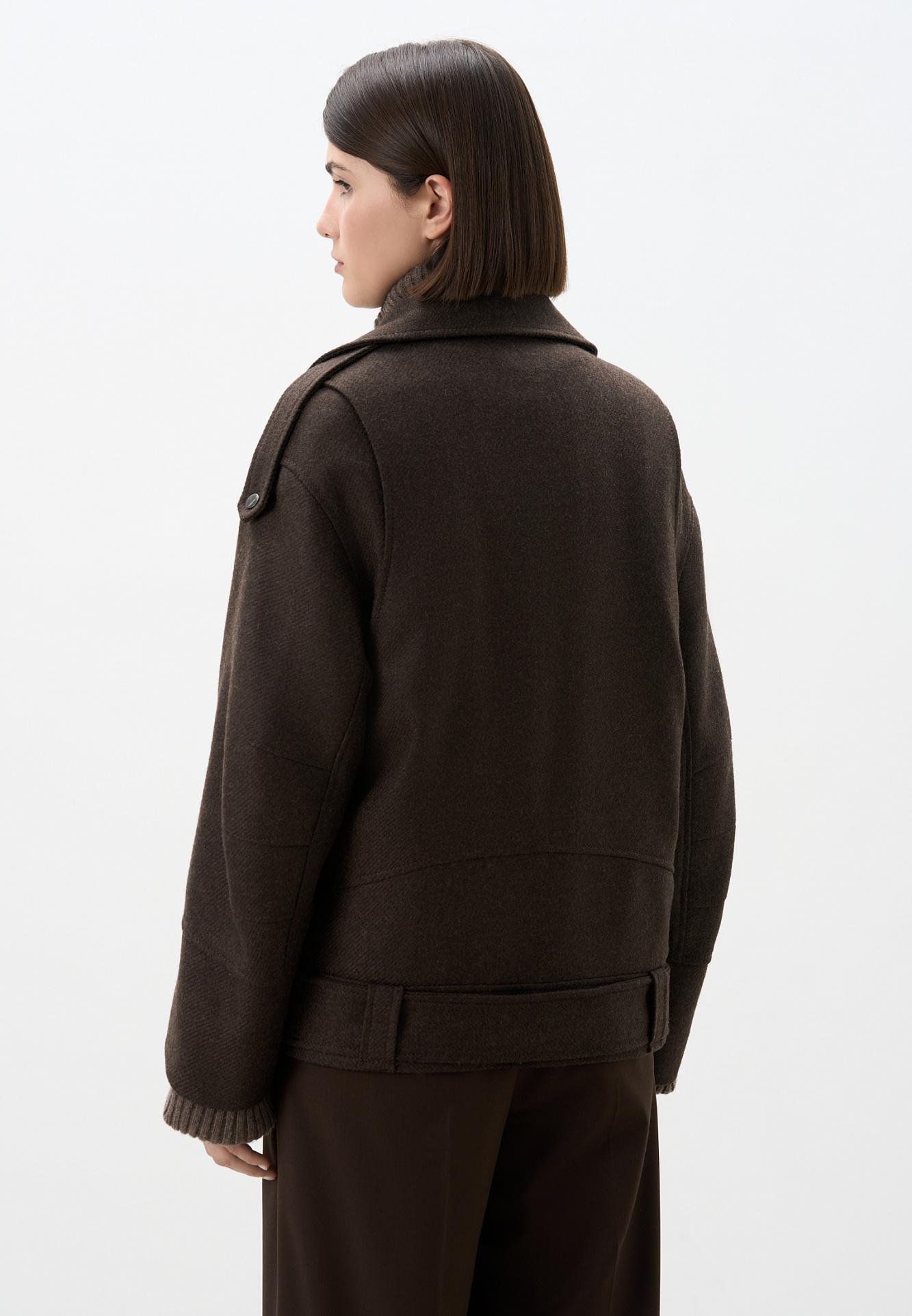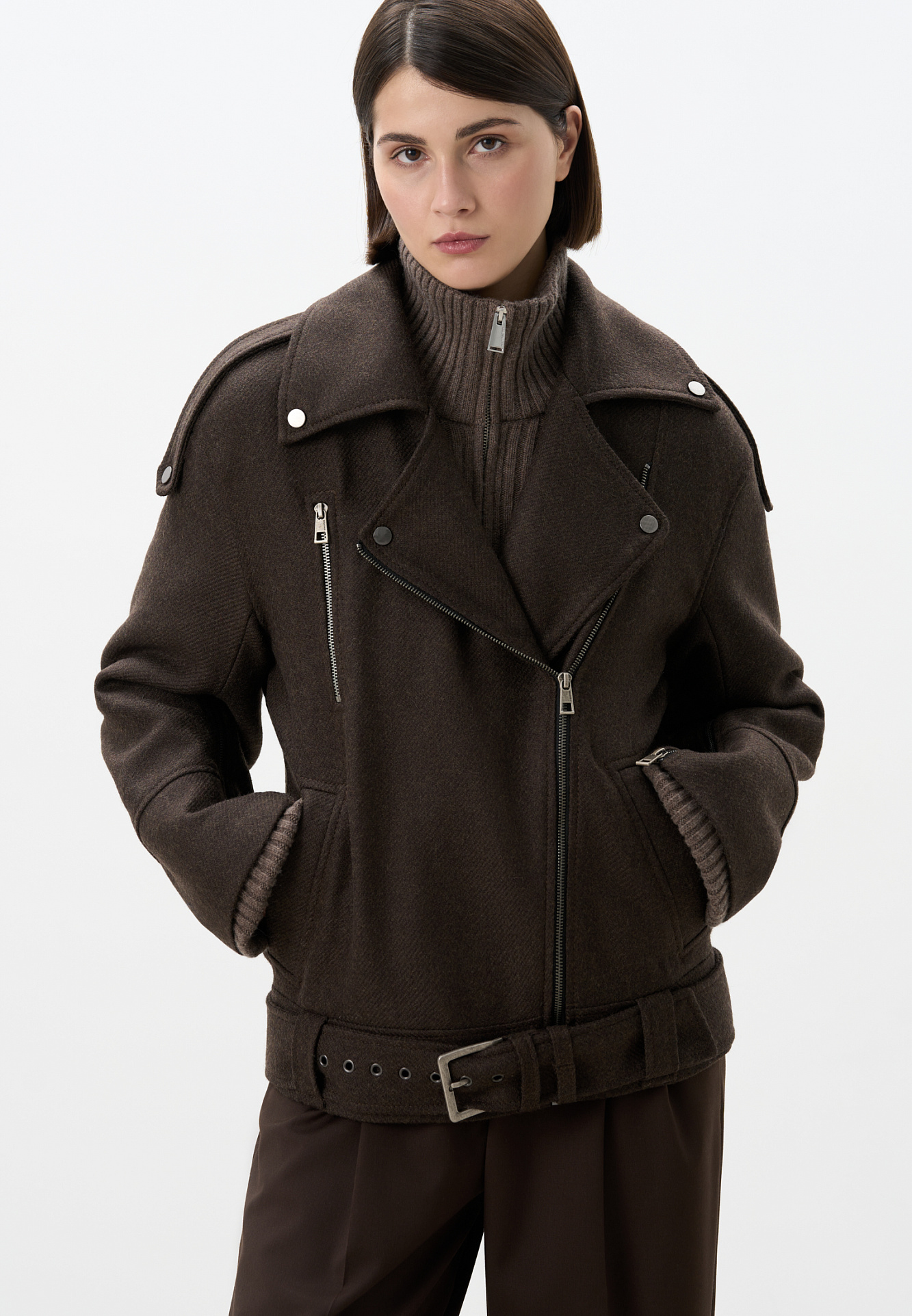 Жакет-косуха из шерсти. Модель свободного силуэта со спущенной линией плеч и косой застежкой. Изделие декорировано эполетами на плечах, широким поясом с пряжкой на талии, боковыми и нагрудным карманом. Изделие на подкладке.