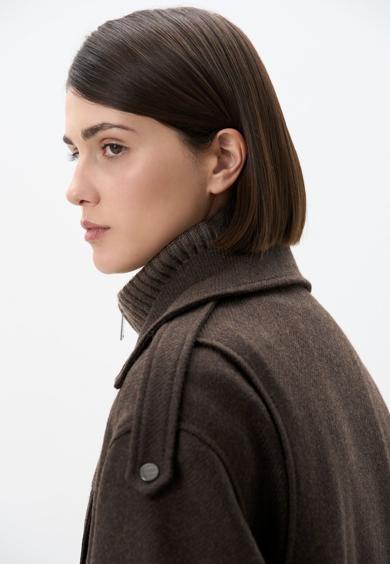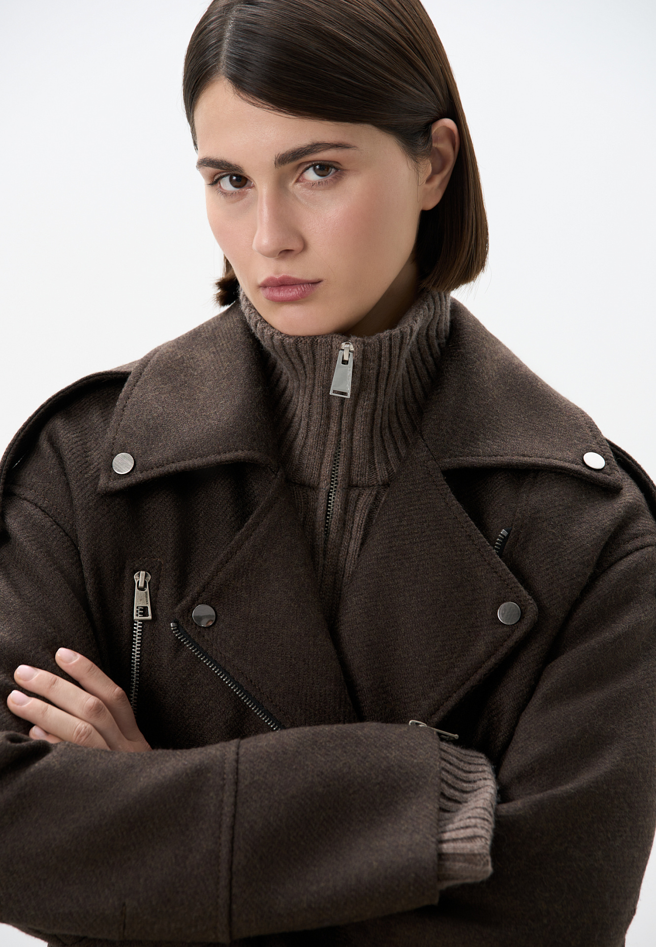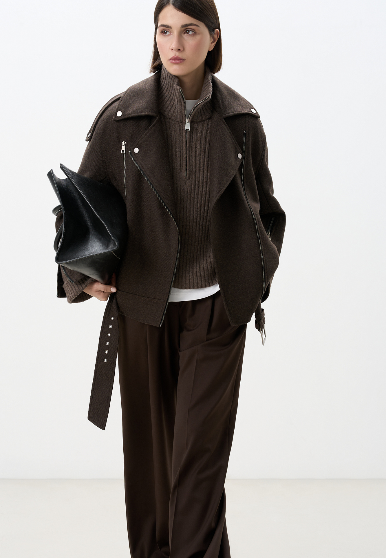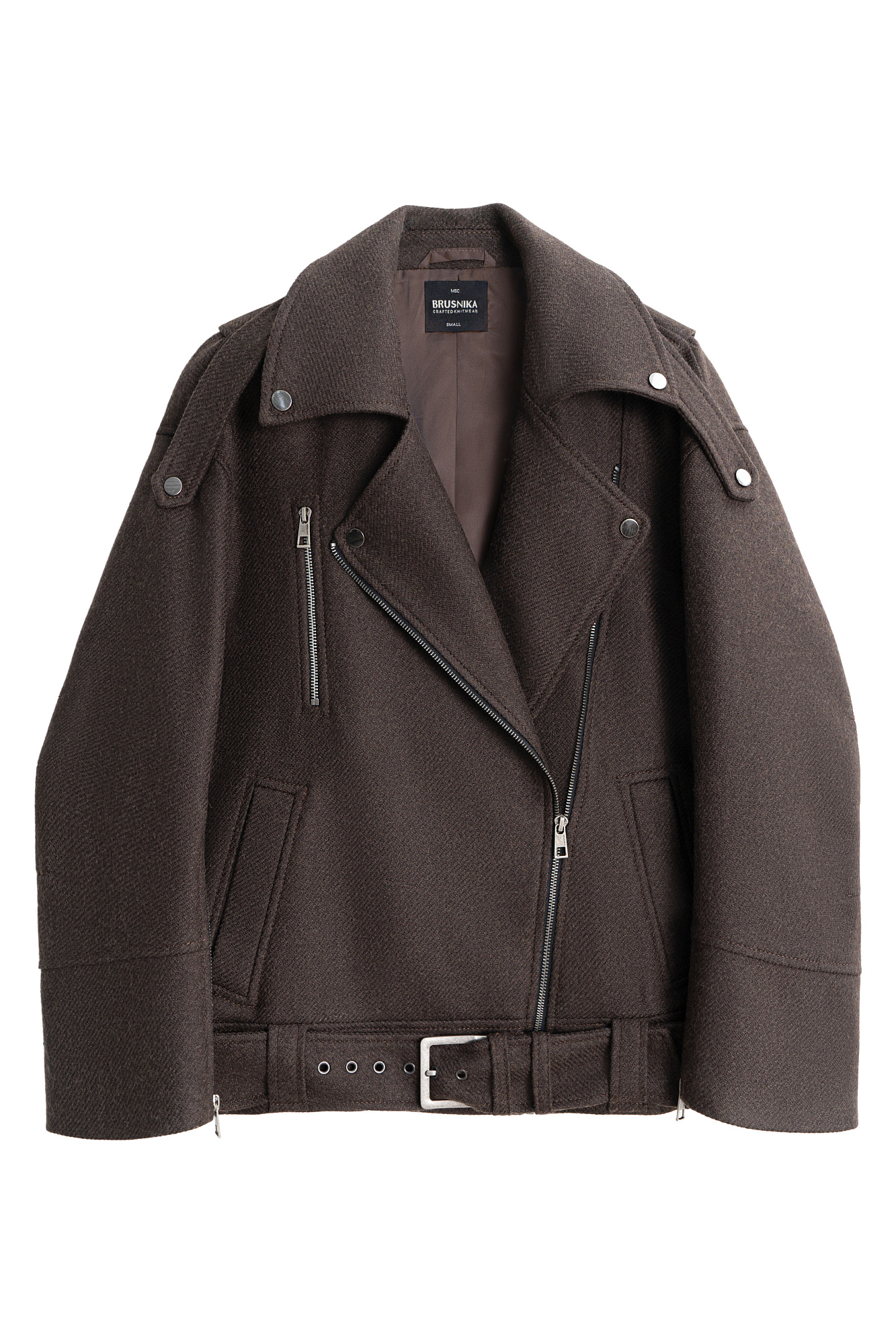Жакет-косуха из шерсти. Модель свободного силуэта со спущенной линией плеч и косой застежкой. Изделие декорировано эполетами на плечах, широким поясом с пряжкой на талии, боковыми и нагрудным карманом. Изделие на подкладке.
