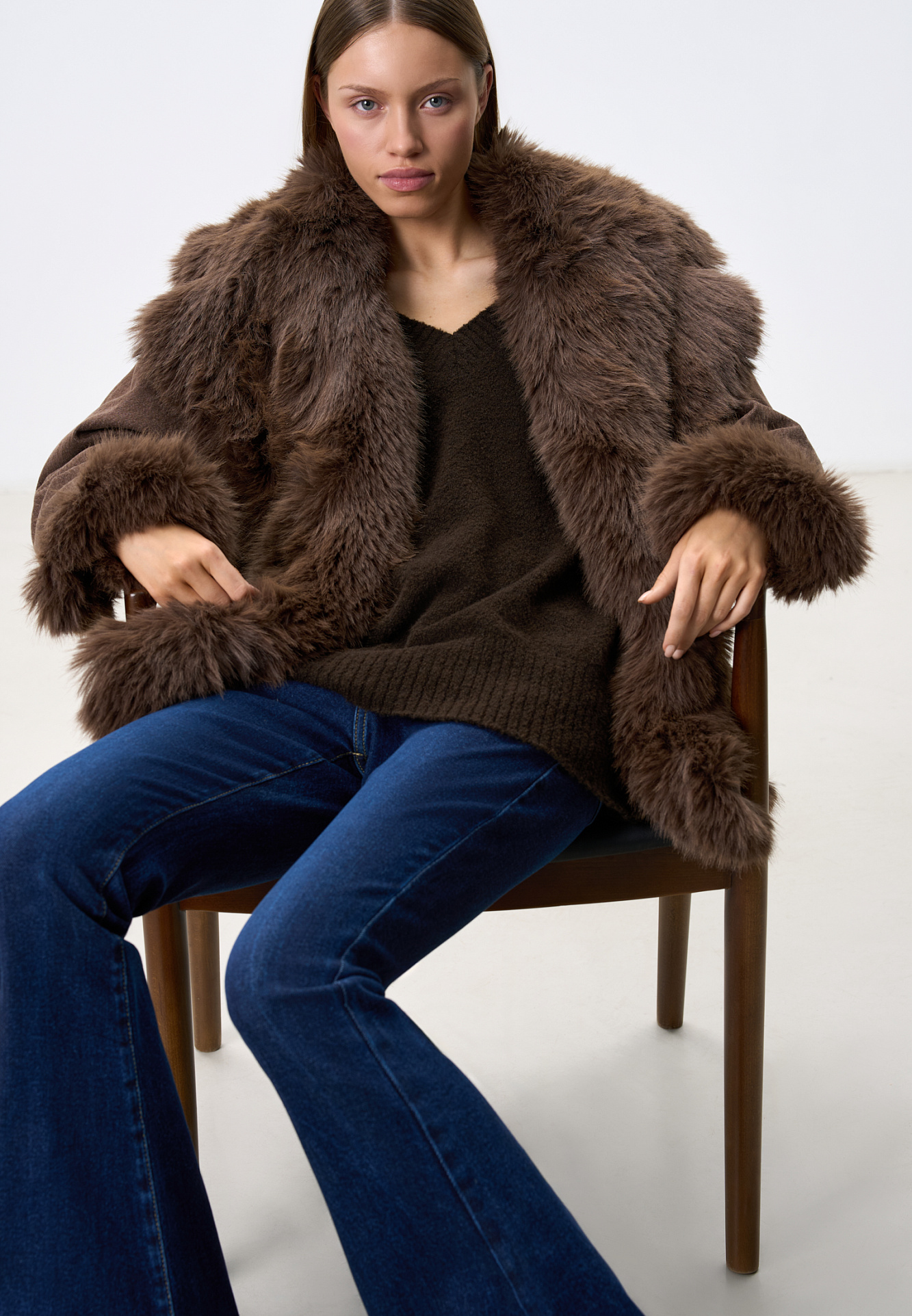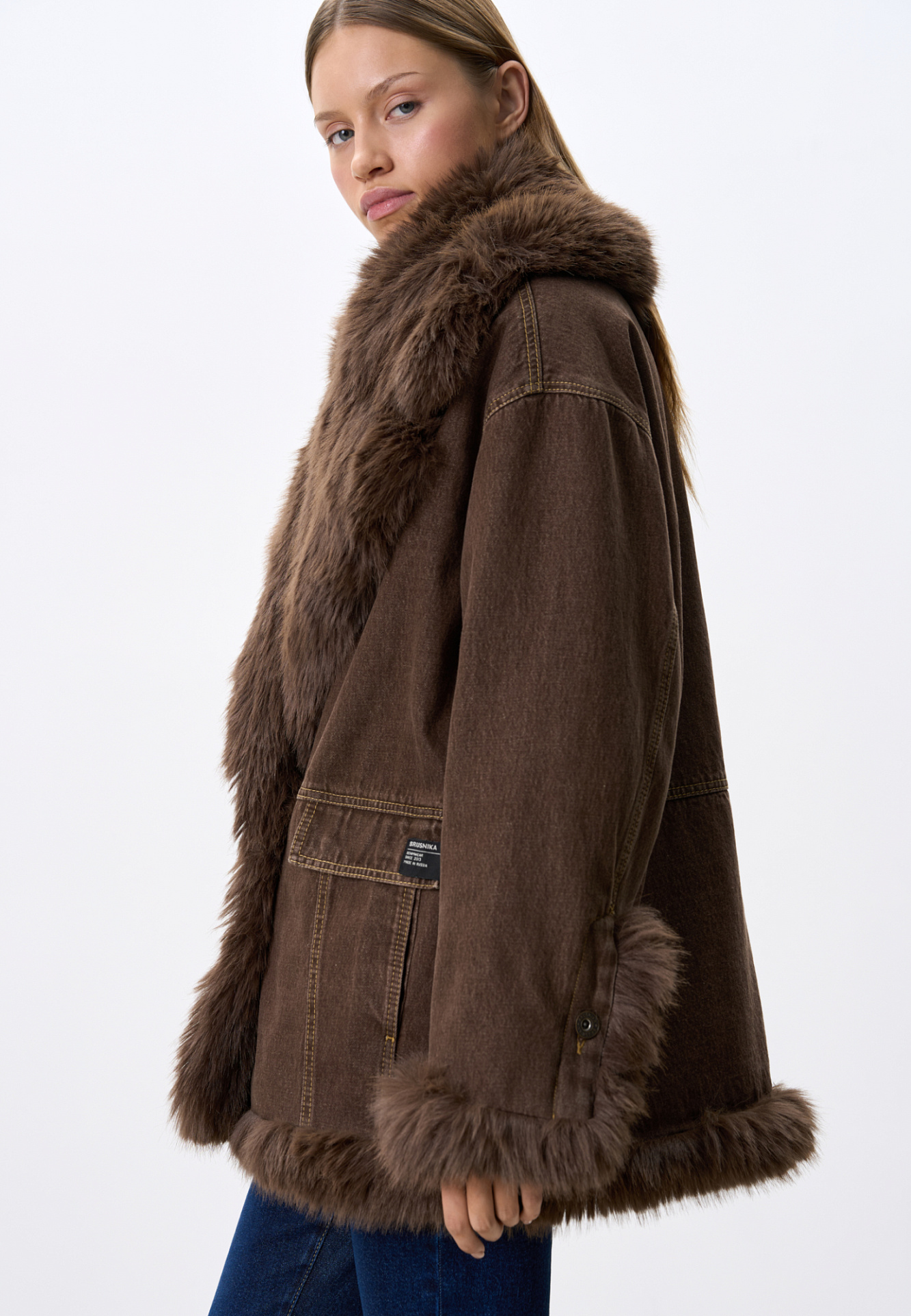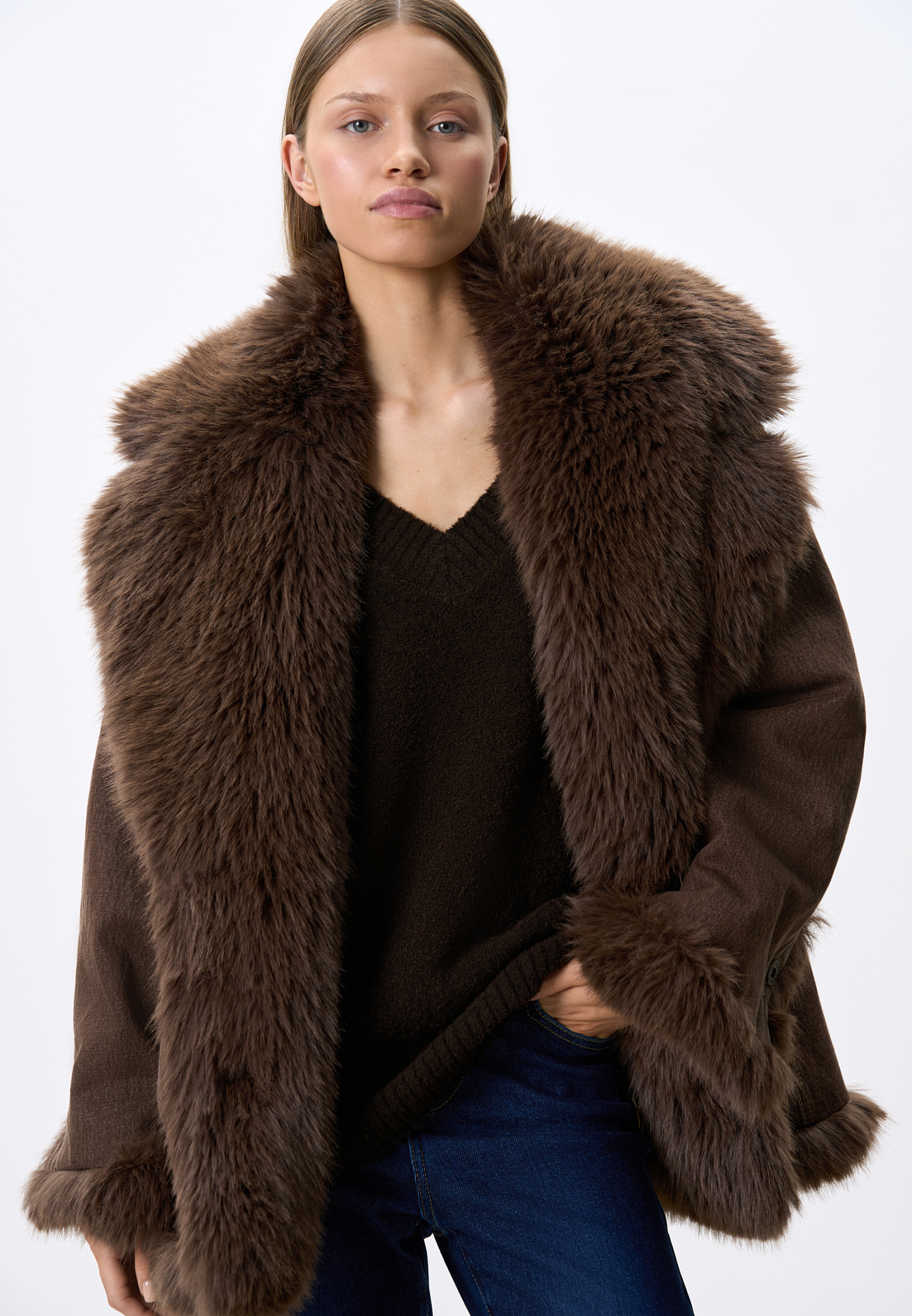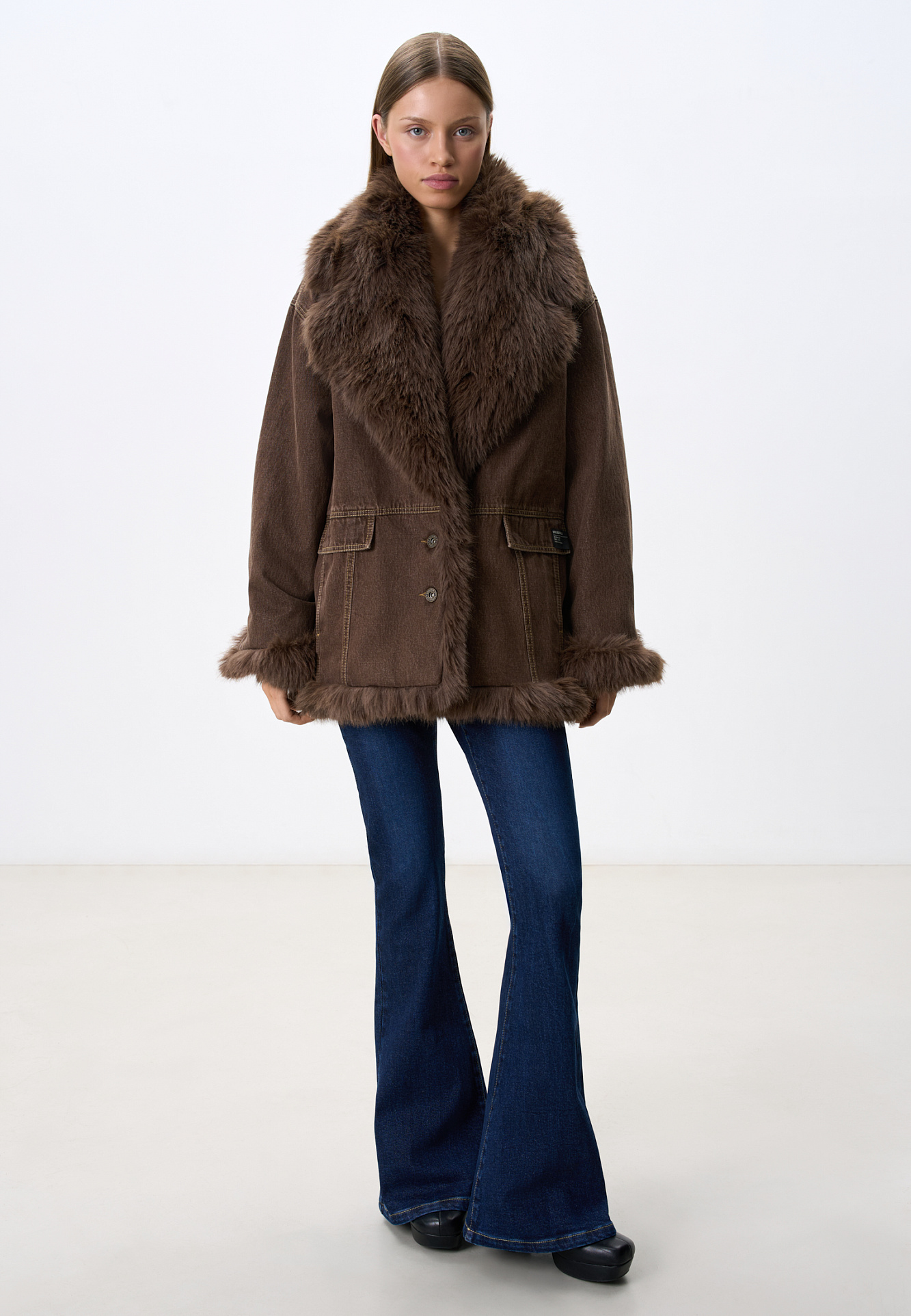 Утепленная джинсовая куртка из 100% хлопка. Модель свободного кроя с широким отложным воротником и манжетами, декорированными экомехом. Застежка на металлические пуговицы.
