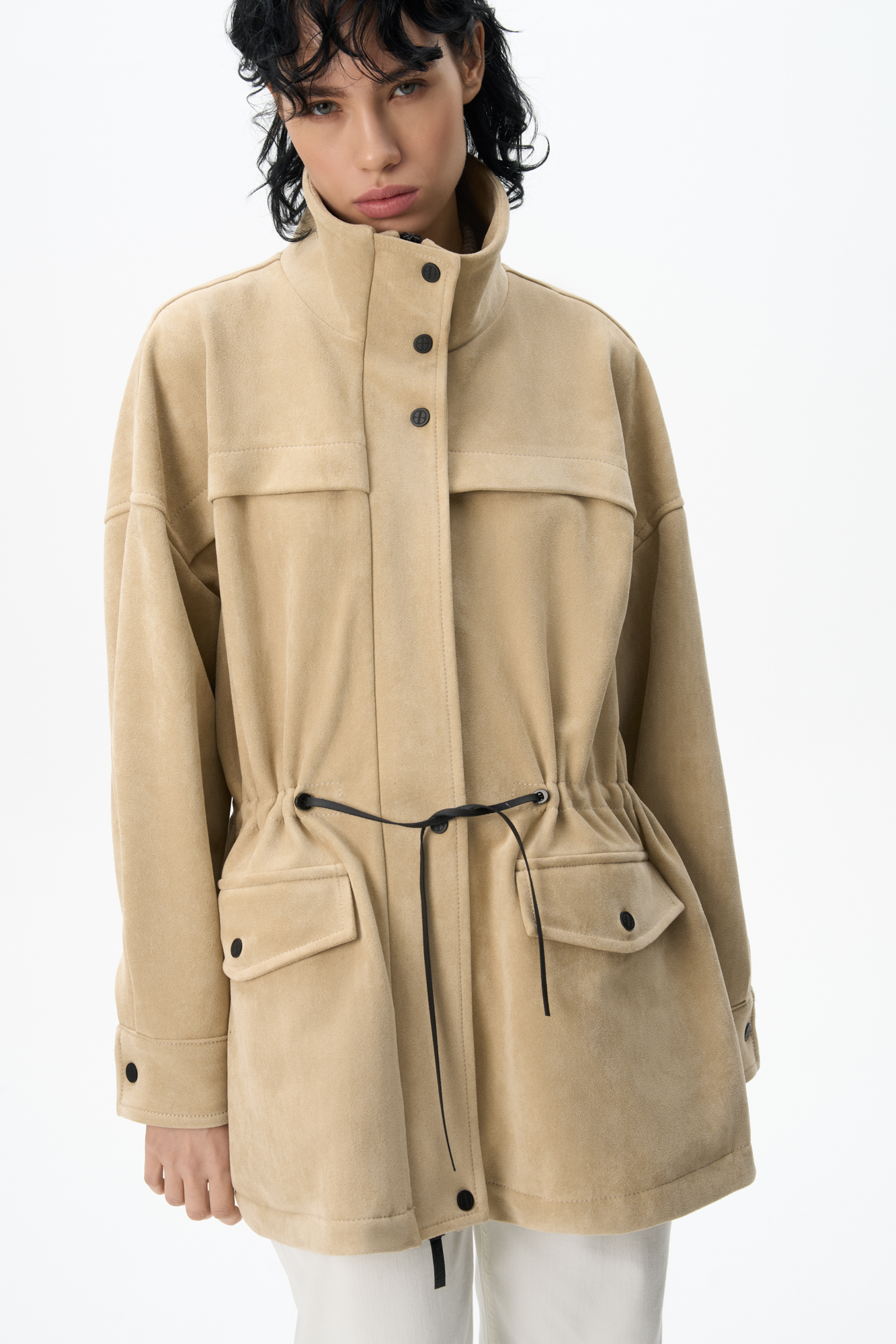 Парка, выполненная из ткани с имитацией внешнего вида и свойств натуральной замши. Модель свободного силуэта с высоким воротником-стойкой, карманами с клапанами и кулиской на талии. Застежка на молнию и магнитные кнопки на планке. Изделие выполнено на подкладке.
