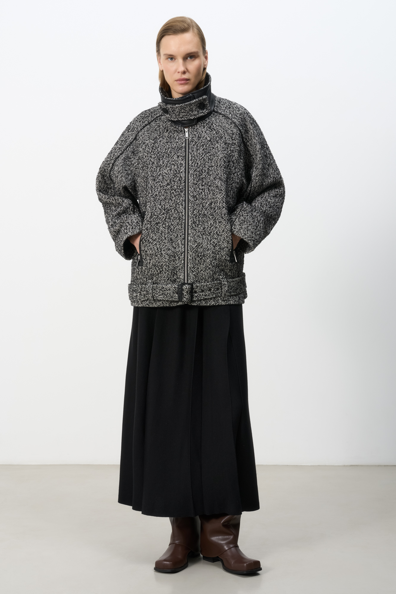 Куртка из смесовой шерсти с поясом. Модель свободного силуэта со спущенной линией плеча и воротником-стойкой. Карманы на молнии. Изделие декорировано вставками из экокожи. Застежка на молнию. На подкладке.