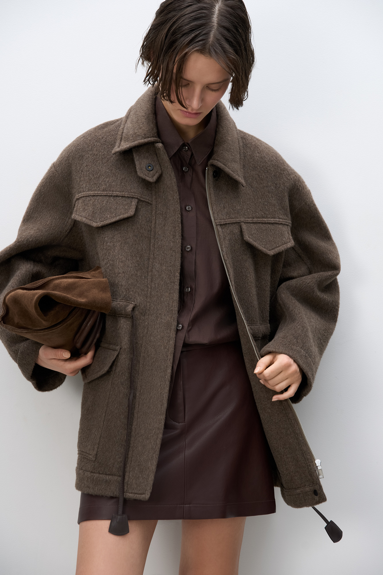 Куртка из 100% шерсти. Модель свободного силуэта со спущенной линией плеча, регулируемой кулиской на поясе и отложным воротником с патой. Изделие с накладными карманами. Застежка на молнию и магнитные кнопки под планкой.
