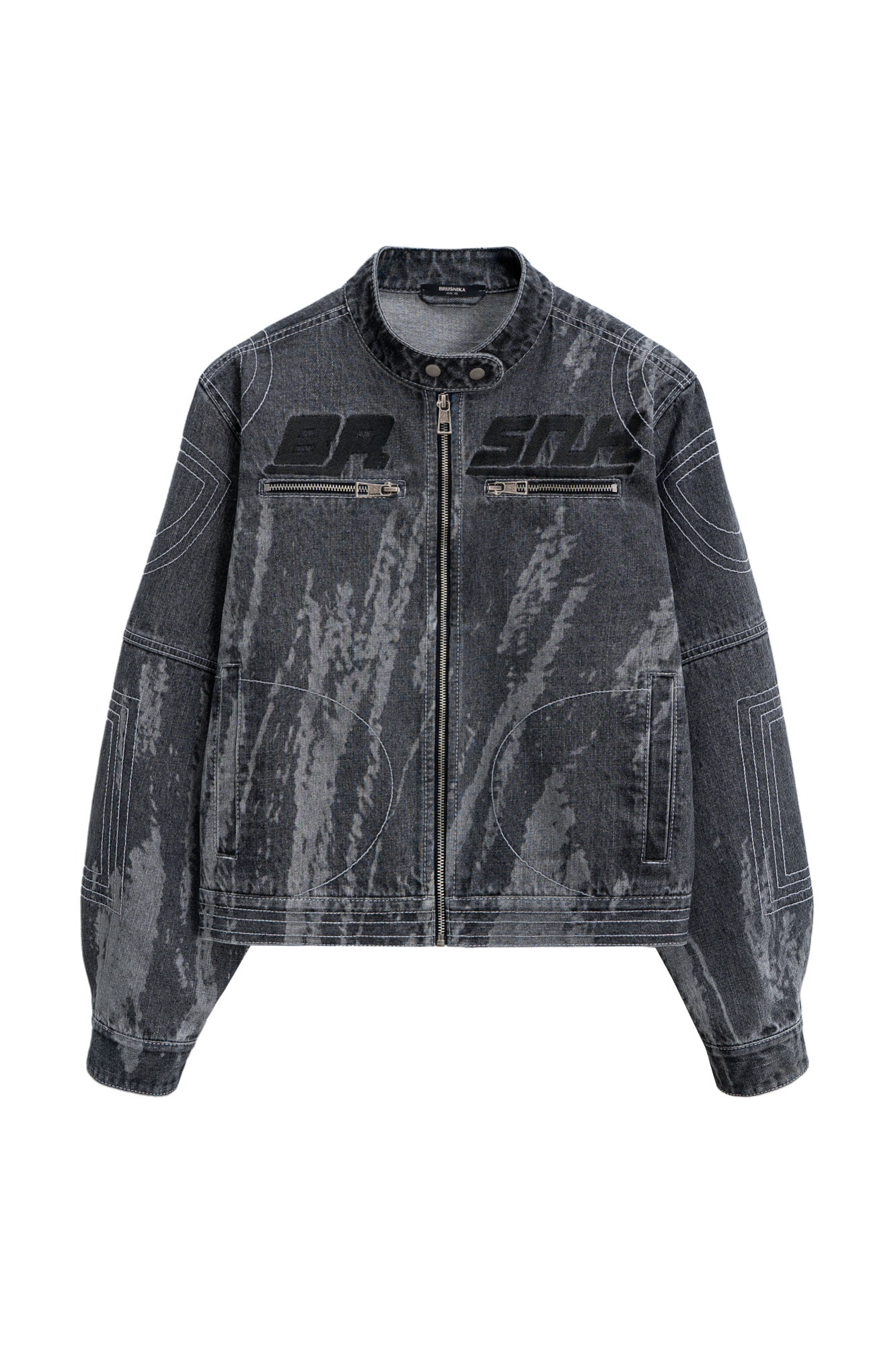 Джинсовая куртка из 100% хлопка. Модель свободного силуэта с коротким воротником-стойкой. Изделие декорировано отстрочкой контрастного цвета, формирующей графические акценты на плечах и рукавах, брендированной вышивкой на груди, боковыми карманами и карманами на груди под молнией. Застежка на молнию. Без подкладки.