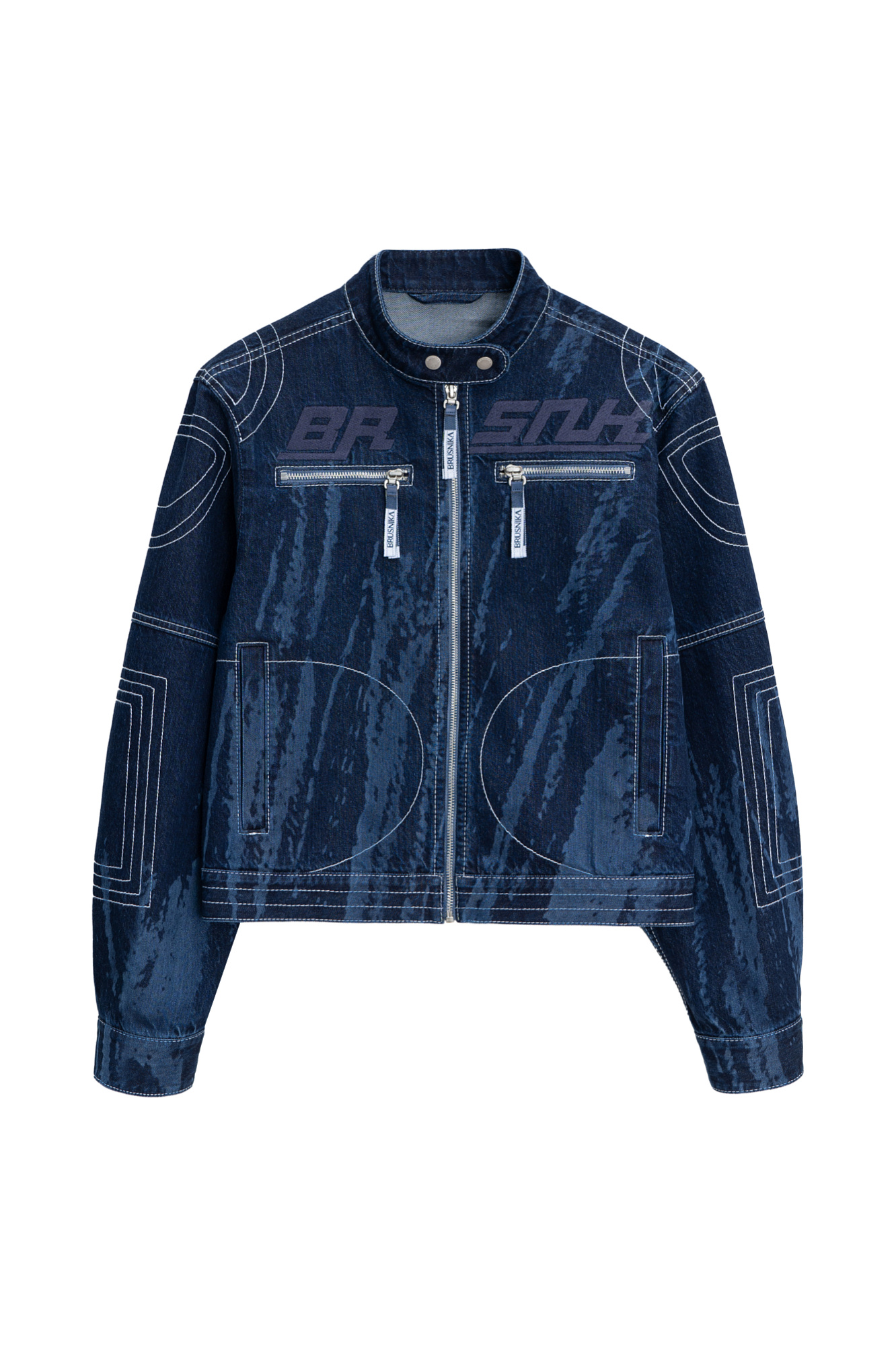 Джинсовая куртка из 100% хлопка. Модель свободного силуэта с коротким воротником-стойкой. Изделие декорировано отстрочкой контрастного цвета, формирующей графические акценты на плечах и рукавах, брендированной вышивкой на груди, боковыми карманами и карманами на груди под молнией. Застежка на молнию. Без подкладки.