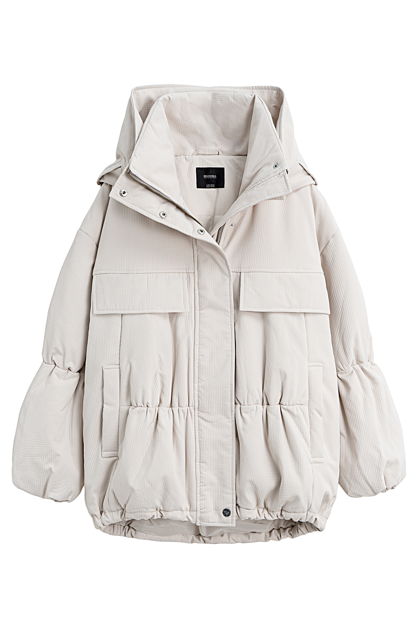 Длинная куртка на синтепоне из текстурной ткани. Модель свободного силуэта со спущенной линией плеча, накладными и боковыми карманами, воротником-стойкой и капюшоном. Изделие на подкладке. Застежка на молнию под планкой с кнопками.