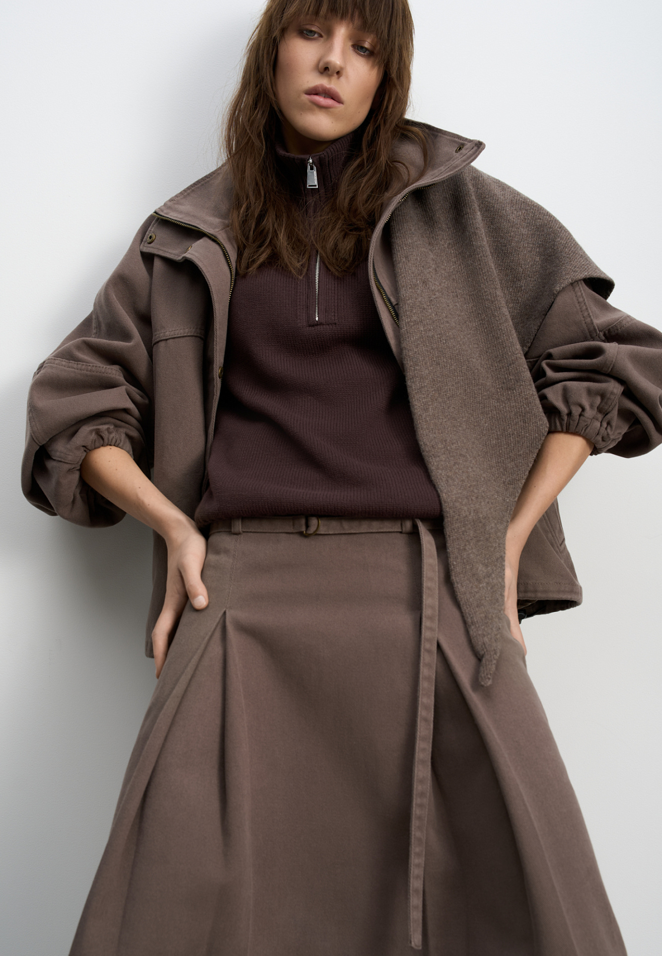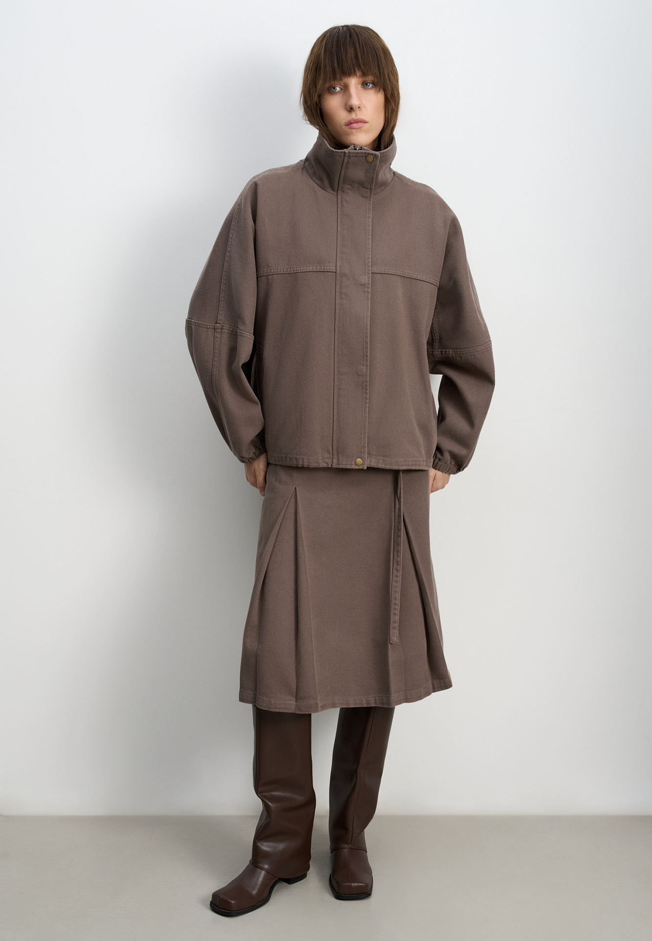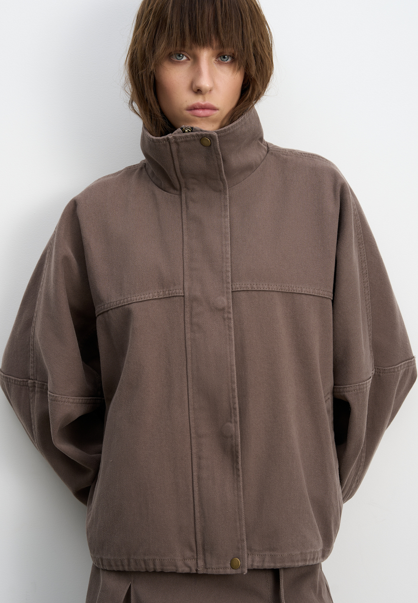Джинсовая куртка из 100% хлопка. Модель прямого кроя с объемными рукавами и высоким воротником-стойкой. Застежка на скрытую молнию под широкой планкой с кнопками. Манжеты рукавов выполнены на резинке.