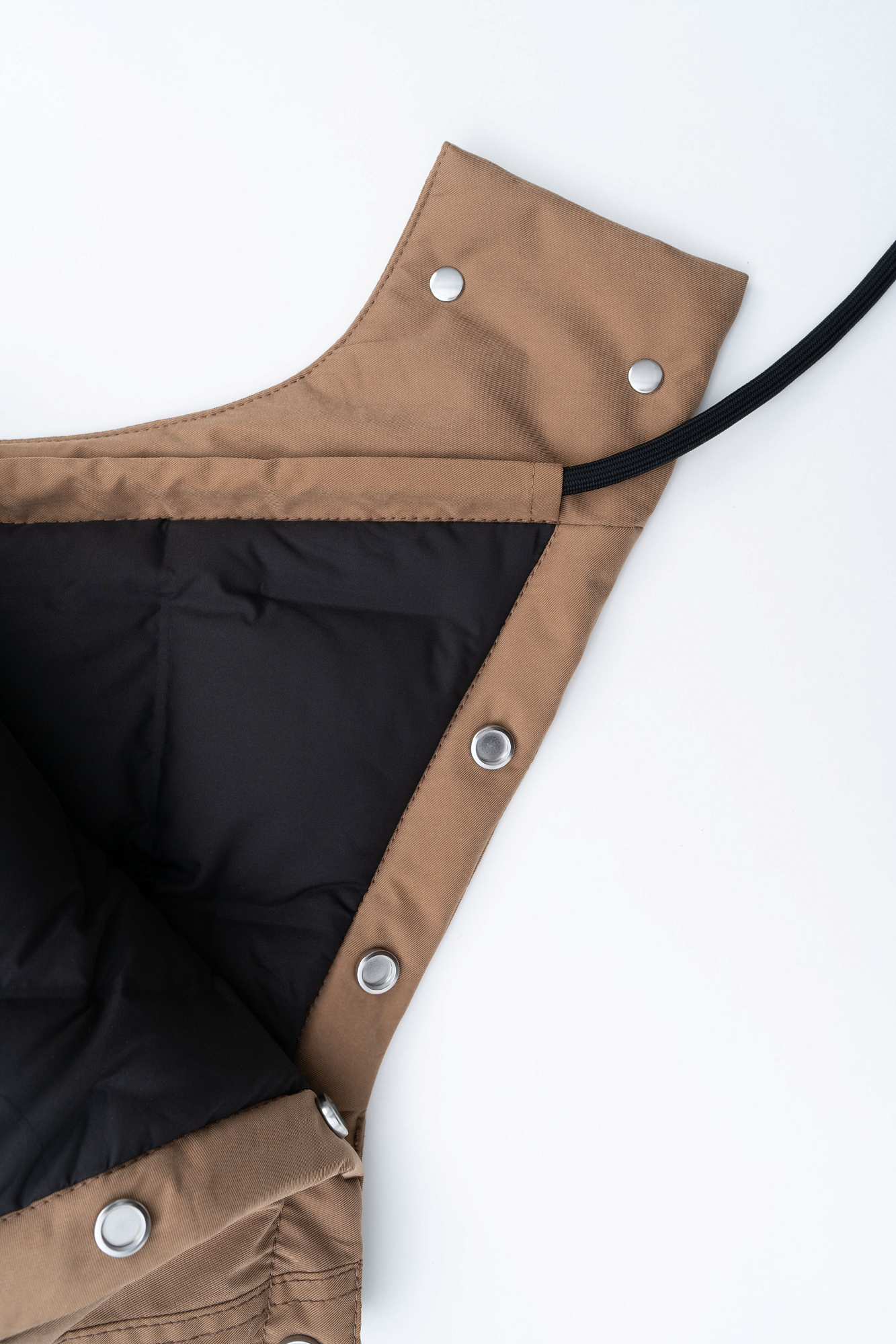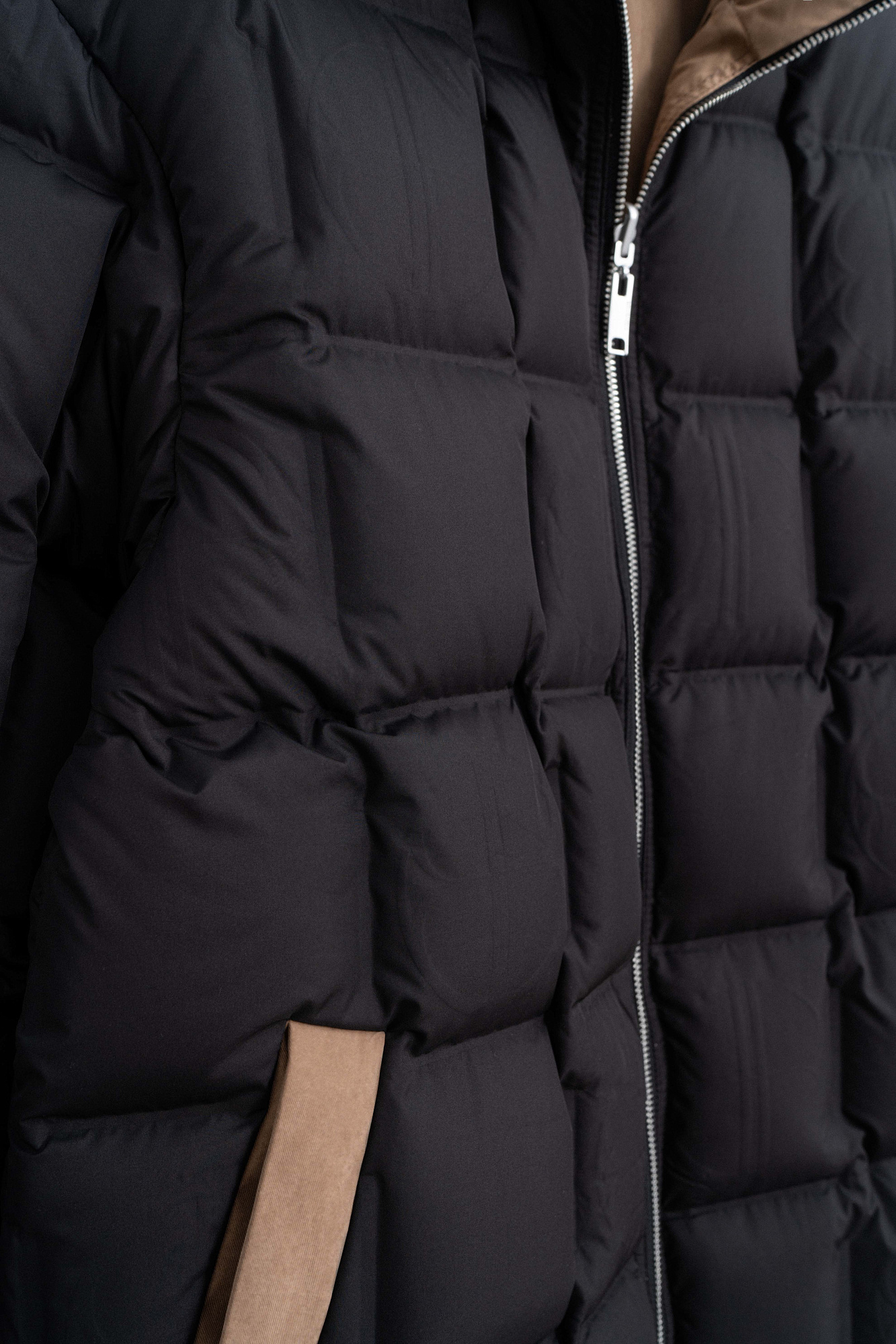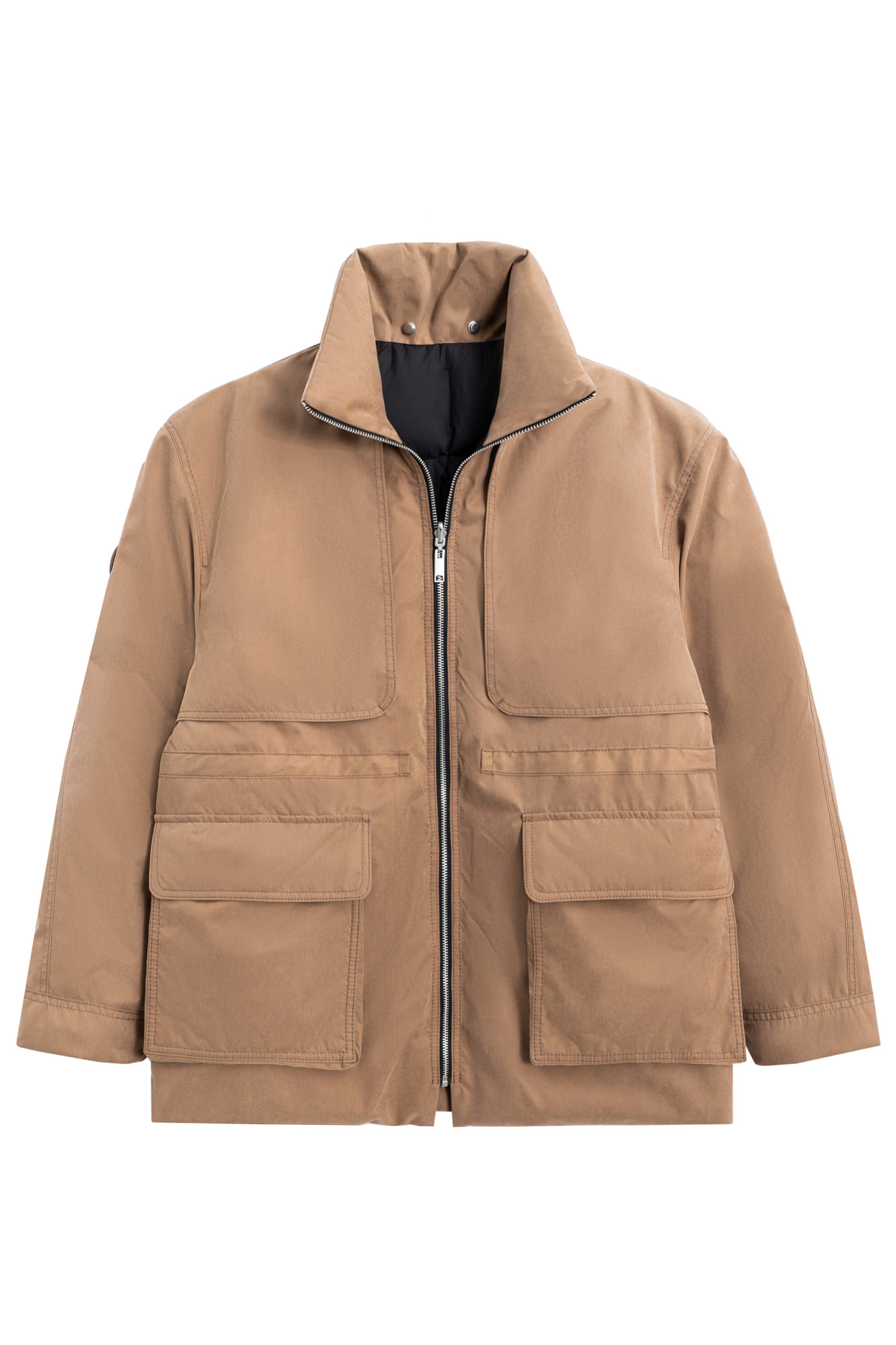 Двусторонний пуховик. Модель свободного силуэта с регулируемой кулиской на талии, большими накладными карманами с клапанами и воротником-стойкой. В комплекте к куртке идет дополнительный объемный воротник и капюшон. Застежка на молнию.