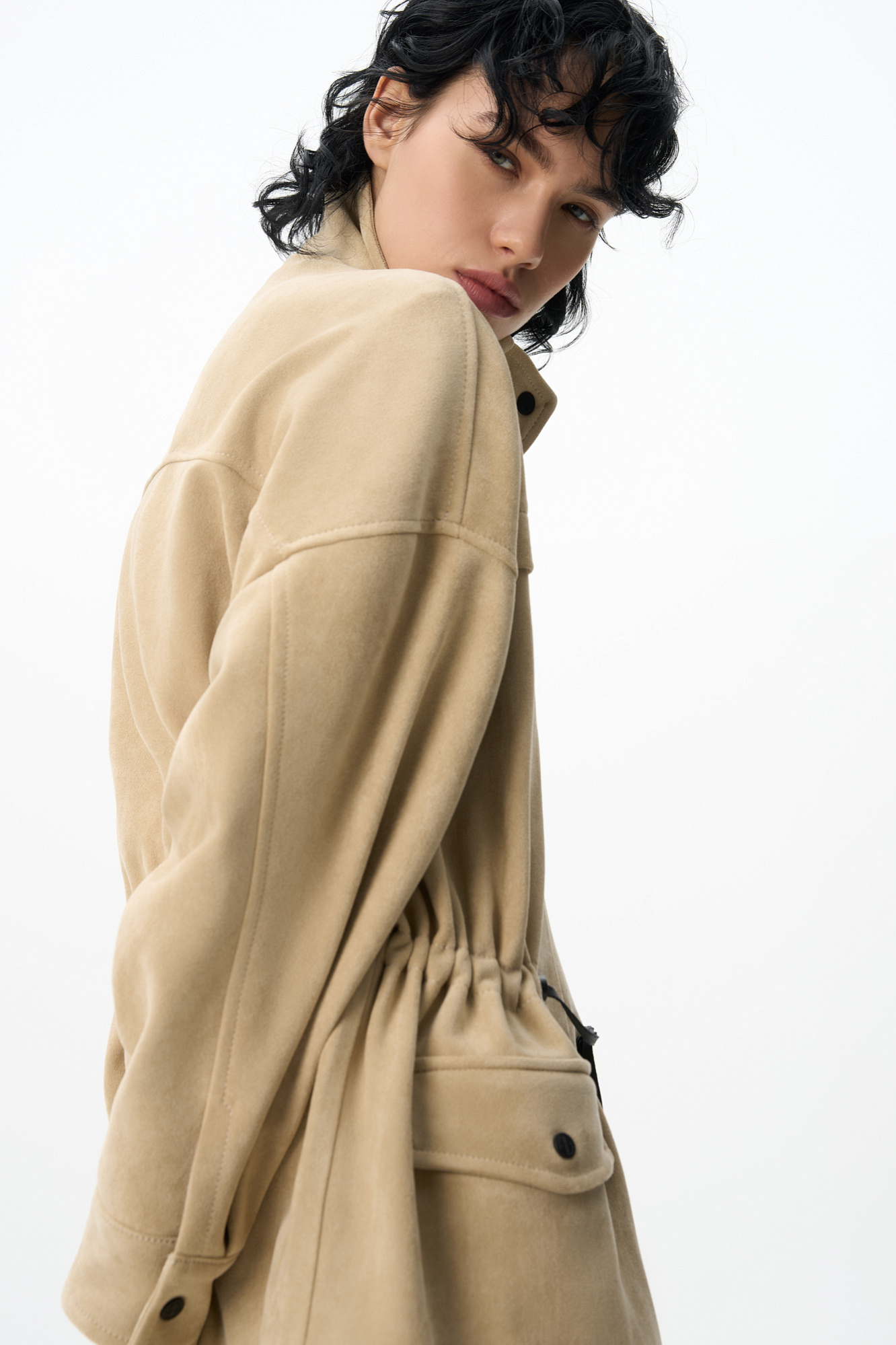 Парка, выполненная из ткани с имитацией внешнего вида и свойств натуральной замши. Модель свободного силуэта с высоким воротником-стойкой, карманами с клапанами и кулиской на талии. Застежка на молнию и магнитные кнопки на планке. Изделие выполнено на подкладке.