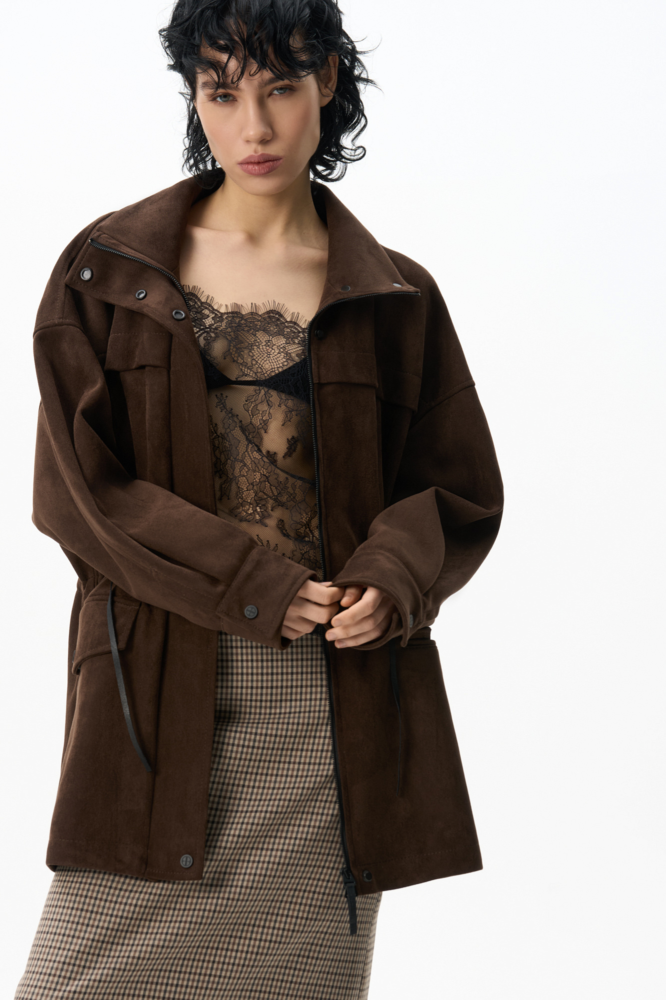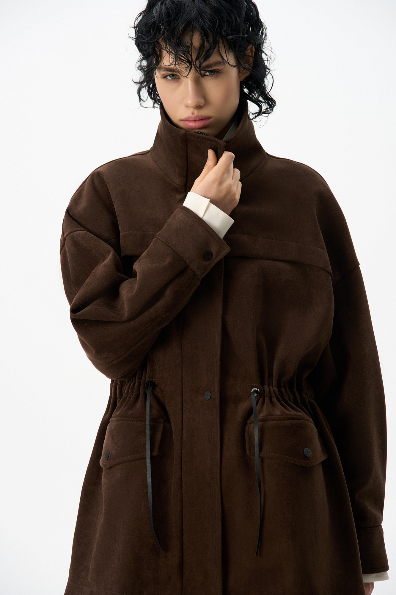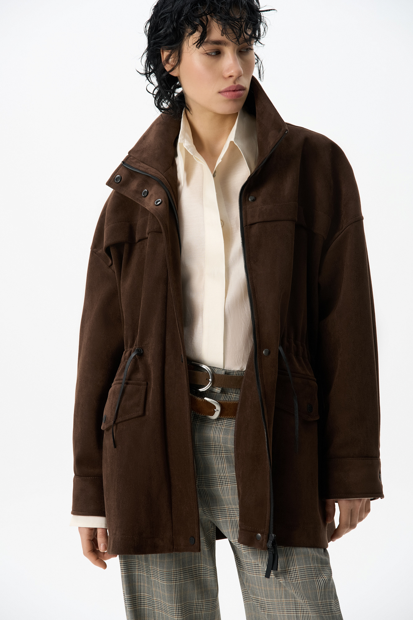 Парка, выполненная из ткани с имитацией внешнего вида и свойств натуральной замши. Модель свободного силуэта с высоким воротником-стойкой, карманами с клапанами и кулиской на талии. Застежка на молнию и магнитные кнопки на планке. Изделие выполнено на подкладке.
