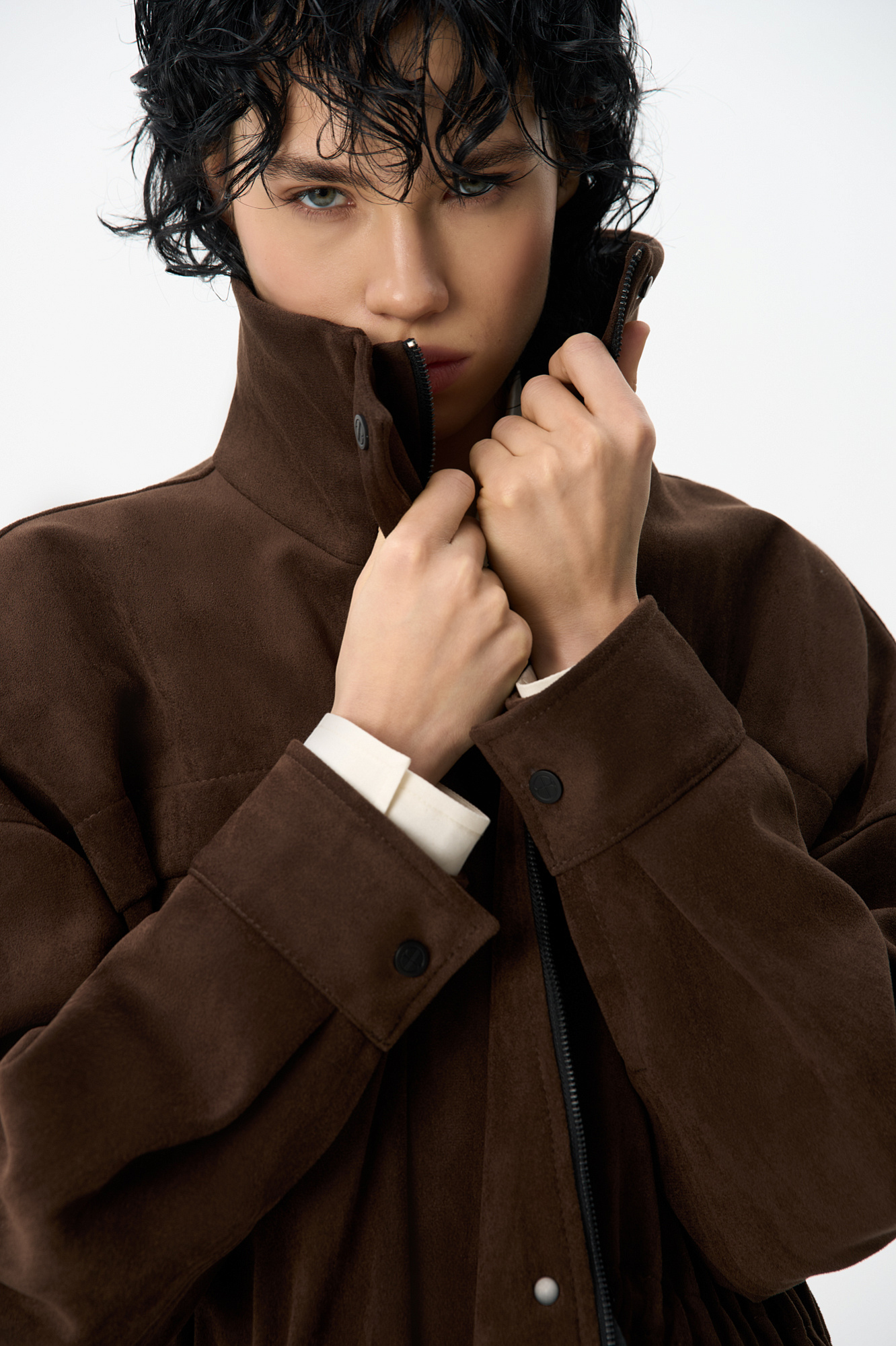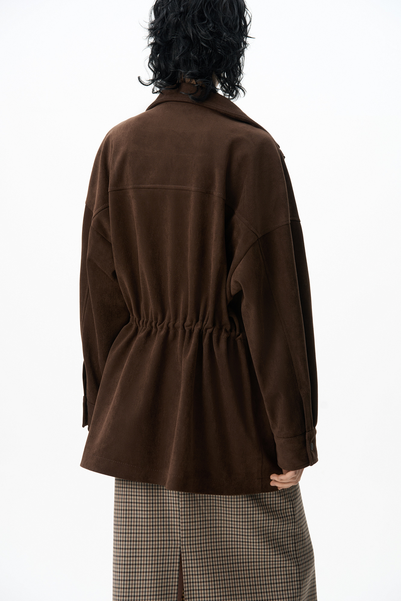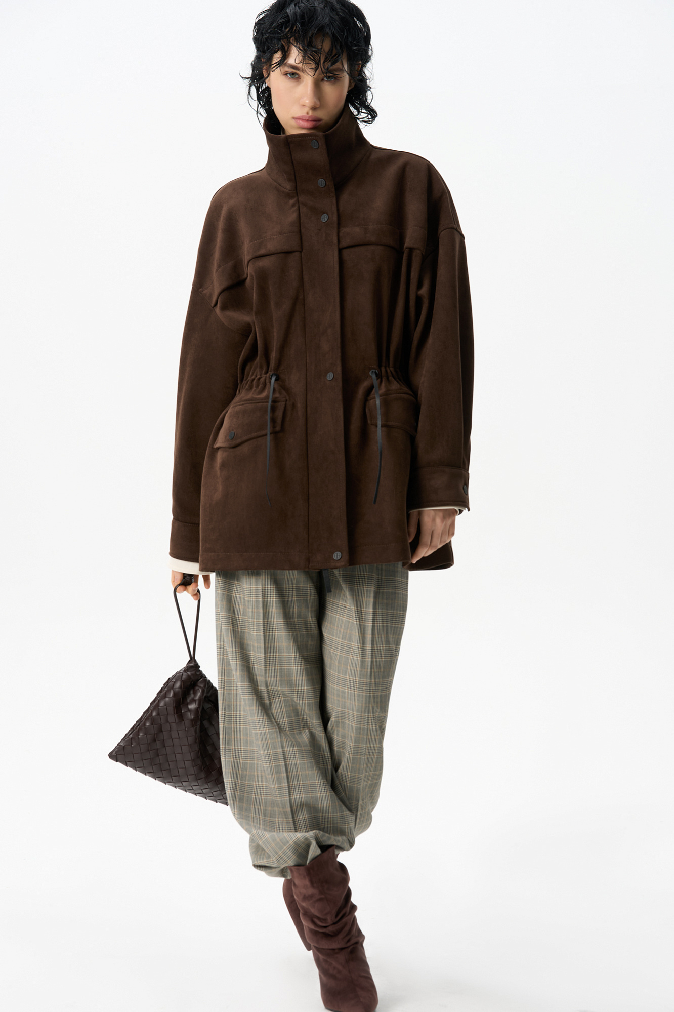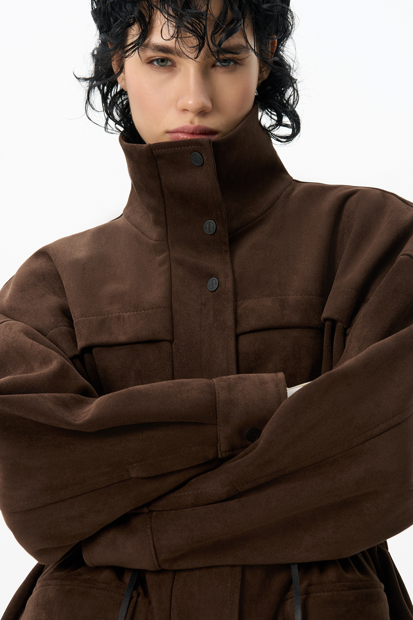 Парка, выполненная из ткани с имитацией внешнего вида и свойств натуральной замши. Модель свободного силуэта с высоким воротником-стойкой, карманами с клапанами и кулиской на талии. Застежка на молнию и магнитные кнопки на планке. Изделие выполнено на подкладке.