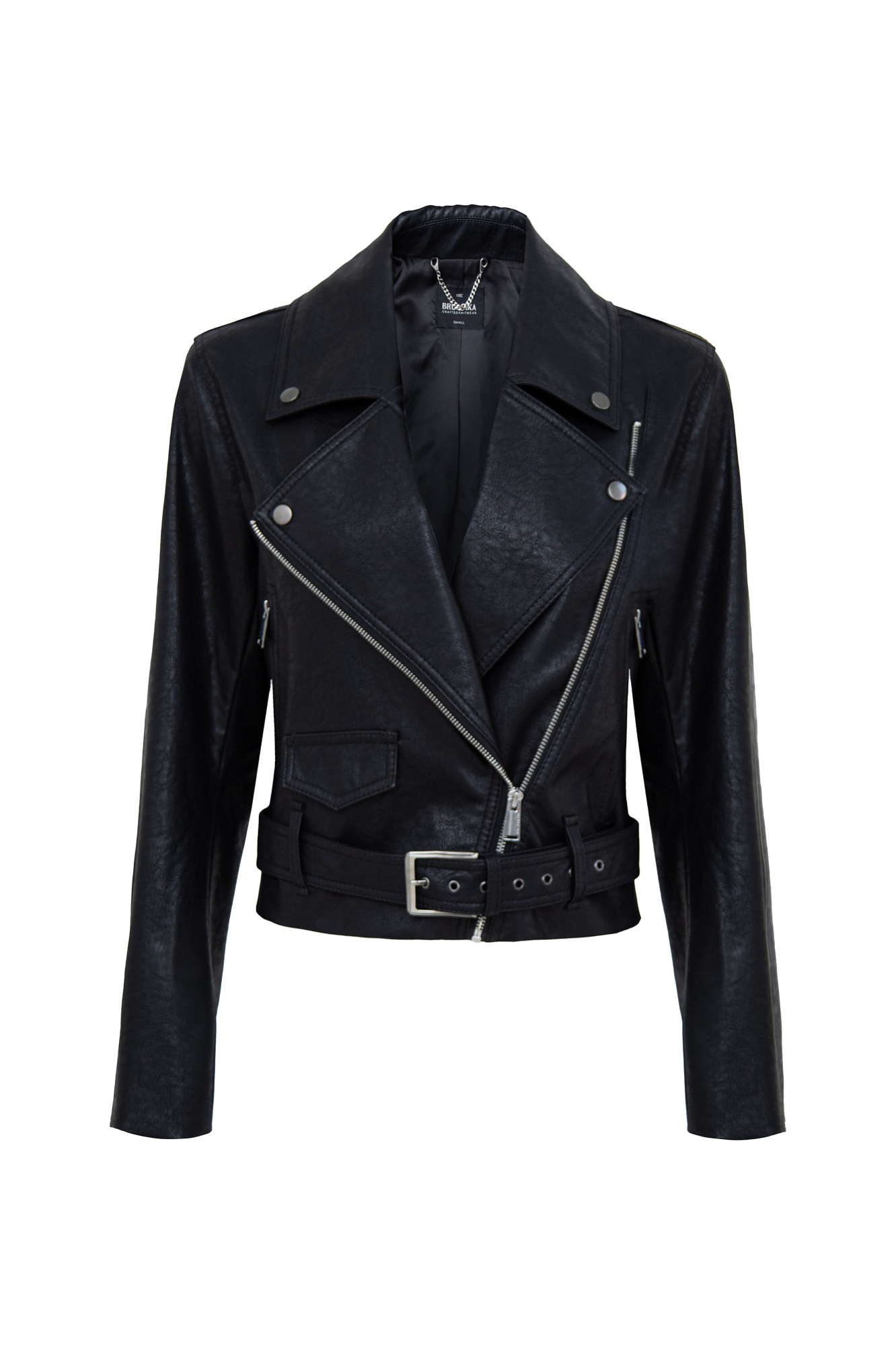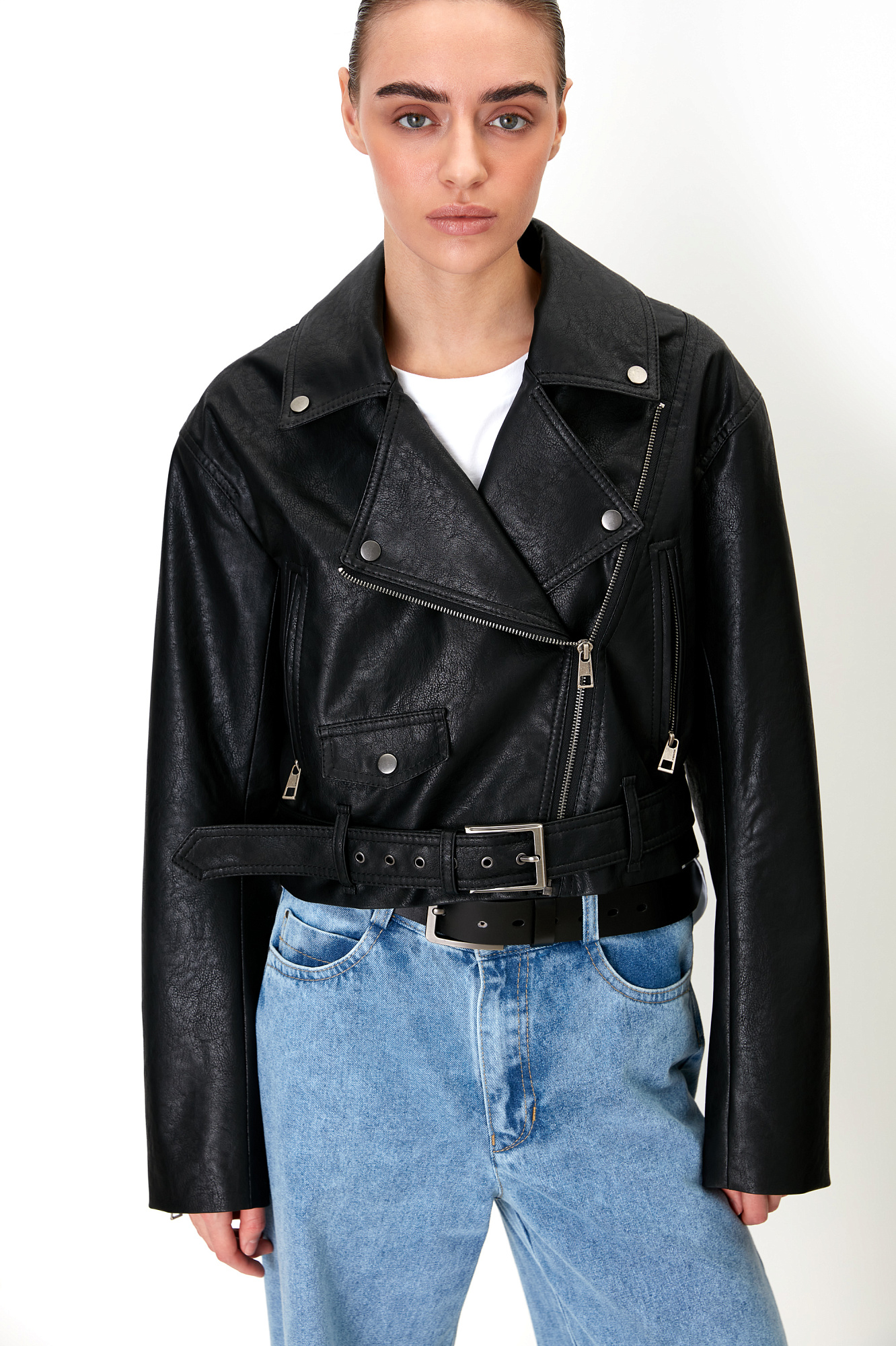 Короткая куртка-косуха из экокожи. Модель с отложным воротником, лацканами, боковыми карманами на молниях и накладным карманом на кнопке. Изделие дополнено шлевками на поясе и широким ремнем с люверсами и пряжкой. Застежка на молнию.