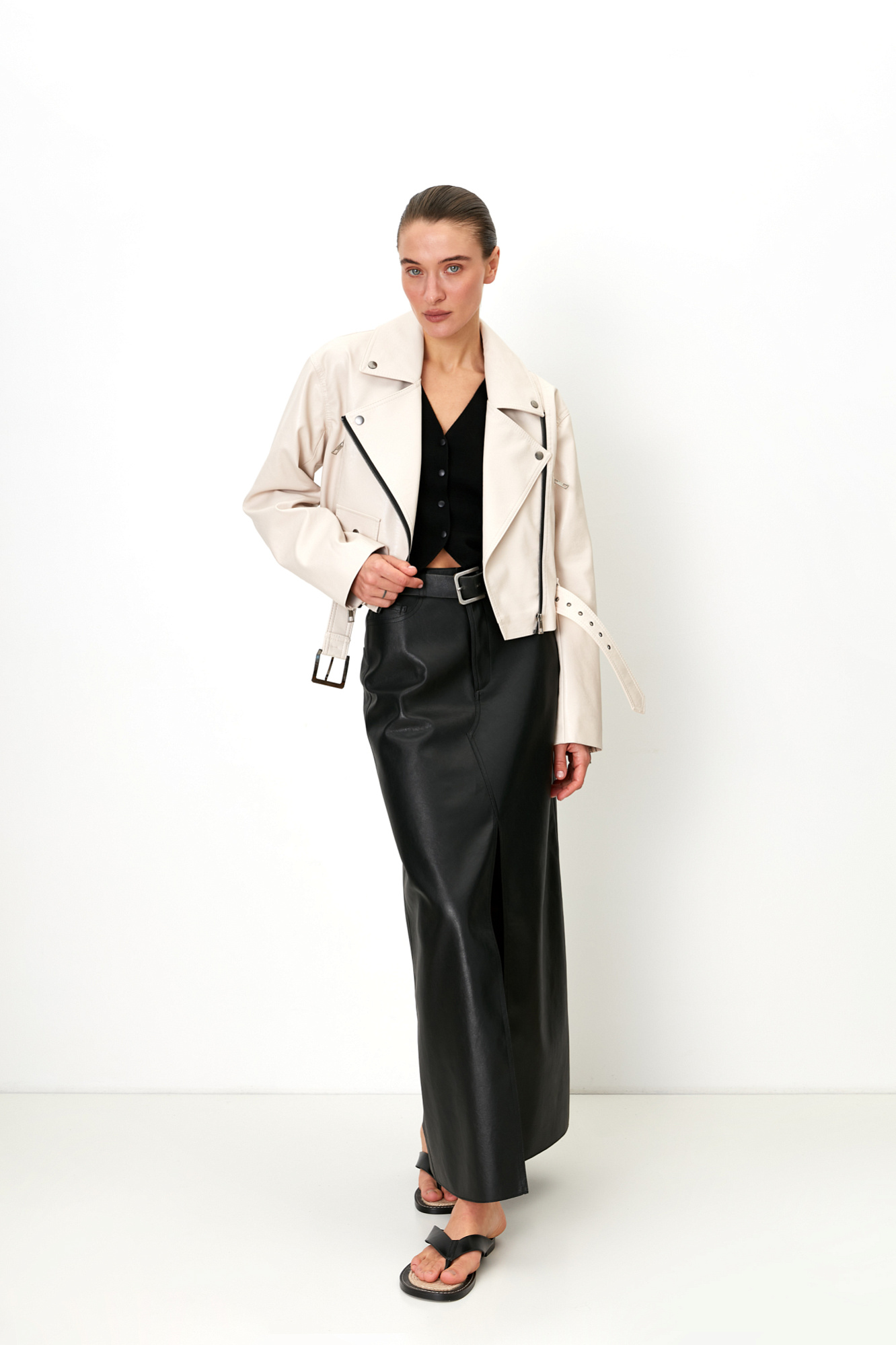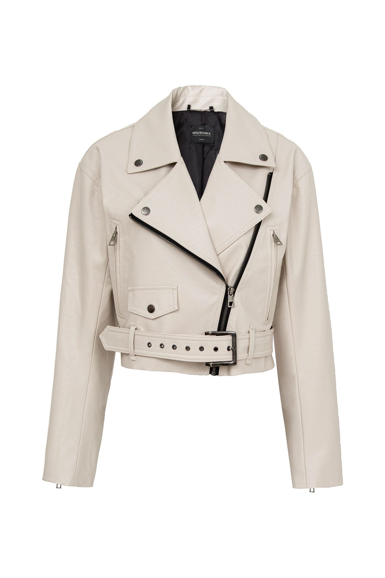 Короткая куртка-косуха из экокожи. Модель с отложным воротником, лацканами, боковыми карманами на молниях и накладным карманом на кнопке. Изделие дополнено шлевками на поясе и широким ремнем с люверсами и пряжкой. Застежка на молнию.